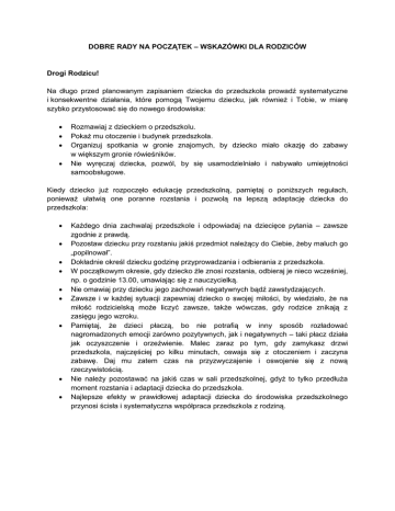 DOBRE RADY NA POCZĄTEK – WSKAZÓWKI DLA RODZICÓW Drogi Rodzicu! Na długo przed planowanym zapisaniem dziecka do przedszkola prowadź systematyczne i konsekwentne działania, które pomogą Twojemu dziecku, jak również i Tobie, w miarę szybko przystosować się do nowego środowiska:     Rozmawiaj z dzieckiem o przedszkolu. Pokaż mu otoczenie i budynek przedszkola. Organizuj spotkania w gronie znajomych, by dziecko miało okazję do zabawy w większym gronie rówieśników. Nie wyręczaj dziecka, pozwól, by się usamodzielniało i nabywało umiejętności samoobsługowe. Kiedy dziecko już rozpoczęło edukację przedszkolną, pamiętaj o poniższych regułach, ponieważ ułatwią one poranne rozstania i pozwolą na lepszą adaptację dziecka do przedszkola:          Każdego dnia zachwalaj przedszkole i odpowiadaj na dziecięce pytania – zawsze zgodnie z prawdą. Pozostaw dziecku przy rozstaniu jakiś przedmiot należący do Ciebie, żeby maluch go „popilnował”. Dokładnie określ dziecku godzinę przyprowadzania i odbierania z przedszkola. W początkowym okresie, gdy dziecko źle znosi rozstania, odbieraj je nieco wcześniej, np. o godzinie 13.00, umawiając się z nauczycielką. Nie omawiaj przy dziecku jego zachowań negatywnych bądź zawstydzających. Zawsze i w każdej sytuacji zapewniaj dziecko o swojej miłości, by wiedziało, że na miłość rodzicielską może liczyć zawsze, także wówczas, gdy rodzice znikają z zasięgu jego wzroku. Pamiętaj, że dzieci płaczą, bo nie potrafią w inny sposób rozładować nagromadzonych emocji zarówno pozytywnych, jak i negatywnych – taki płacz działa jak oczyszczenie i orzeźwienie. Malec zaraz po tym, gdy zamykasz drzwi przedszkola, najczęściej po kilku minutach, oswaja się z otoczeniem i zaczyna zabawę. Daj mu zatem czas na przyzwyczajenie i oswojenie się z nową rzeczywistością. Nie należy pozostawać na jakiś czas w sali przedszkolnej, gdyż to tylko przedłuża moment rozstania i adaptacji dziecka do przedszkola. Najlepsze efekty w prawidłowej adaptacji dziecka do środowiska przedszkolnego przynosi ścisła i systematyczna współpraca przedszkola z rodziną. Czy wiesz, Rodzicu, co Twój trzylatek już potrafi? 1. Wie już wiele, rozumie, pamięta, lecz trudno mu skupić uwagę na dłużej, zwłaszcza na jednym temacie. 2. Większość informacji przyjmuje bezkrytycznie i dosłownie, a fantazje, bajki nie mają wyraźnie zarysowanych granic. 3. Posiada dużą potrzebę poznawania otaczającego świata, dlatego łatwo obudzić w nim zainteresowanie przedszkolem. 4. Jego wiedza jest jeszcze skromna, dlatego uzupełnia ją swoją fantazją i skojarzeniami. 5. Dopiero zaczyna przyswajać pojęcia czasu, przestrzeni i podstawowe pojęcia matematyczne. 6. Chętnie powtarza, co usłyszał, lub snuje swoje opowieści, ponieważ intensywnie rozwija się jego mowa. 7. Lubi książeczki edukacyjne, które wzbogacają jego język, wiedzę i wrażliwość. 8. Jego zachowaniem rządzą emocje i impulsy. 9. Początek edukacji przedszkolnej może być silnym przeżyciem, dlatego trzylatek może zacząć budzić się w nocy, może być bardziej rozdrażniony i płaczliwy. 10. Przedszkole ma prawo budzić emocje, takie jak lęk, sprzeciw oraz płacz na starcie. 11. Warto pytać nauczyciela o samopoczucie dziecka w przedszkolu oraz o to, co pomaga mu się odprężać, a co budzi napięcie. 12. Trzylatek wyraża już chęć kontaktów z innymi rówieśnikami, jednak na razie bawi się obok innych dzieci. Wspólne, krótkie zabawy kończą się często konfliktem. 13. Trudne relacje z innymi dziećmi są istotne w rozwoju trzylatka, uczą norm grupowych, kompromisu oraz dbania o swoje prawa. 14. Trzylatek jest bardzo ufny, co może łączyć się z zagrożeniem. 15. Potrzebuje czasu i aktywnej pomocy ze strony dorosłych, by oswoić się z towarzystwem i opiekunem w przedszkolu. 16. Zabawa to podstawowa aktywność trzylatka. 17. Odpowiednie dla trzylatka są proste zabawki manualne, tematyczne i rozwijające myślenie – ważne, by były bezpieczne. 18. Trzylatek do zabawy może wykorzystać zwykłe przedmioty codziennego użytku czy dary natury, które pobudzają wyobraźnię i wrażliwość. 19. Najatrakcyjniejsze są zabawki, którymi bawią się inne dzieci, co często jest źródłem konfliktów, ale i okazją do nauki ich pokojowego rozwiązywania. 20. Trzylatek ma swój własny, typowy dla siebie poziom energii i zapotrzebowania na ruch, który zmienia się z wiekiem. 21. Swobodnie wykonuje już takie ćwiczenia jak: skakanie na jednej nodze, chodzenie na czworakach, wspinanie się, bieganie, wieszanie się na rękach. 22. U trzylatka wzrasta koordynacja wzrokowo-ruchowa, a ręce dziecka stają się coraz bardziej sprawne.