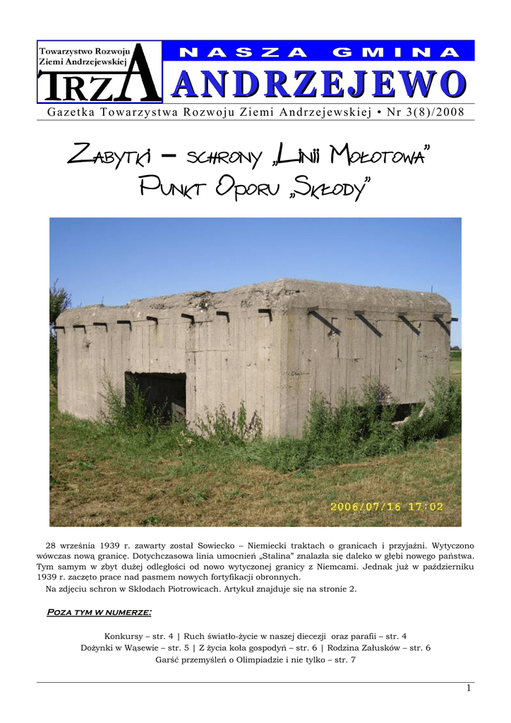 N A S Z A G M I N A ANDRZEJEWO G a z e t k a T o w a r z y s t w a R o z w o j u Z i e mi A n d r z e j e w s k i e j • Nr 3 ( 8 ) / 2 0 0 8 Zabytki – schrony „Linii Mołotowa” Punkt Oporu „Skłody” 28 września 1939 r. zawarty został Sowiecko – Niemiecki traktach o granicach i przyjaźni. Wytyczono wówczas nową granicę. Dotychczasowa linia umocnień „Stalina” znalazła się daleko w głębi nowego państwa. Tym samym w zbyt dużej odległości od nowo wytyczonej granicy z Niemcami. Jednak już w październiku 1939 r. zaczęto prace nad pasmem nowych fortyfikacji obronnych. Na zdjęciu schron w Skłodach Piotrowicach. Artykuł znajduje się na stronie 2. Poza tym w numerze: Konkursy – str. 4 | Ruch światło-życie w naszej diecezji oraz parafii – str. 4 Dożynki w Wąsewie – str. 5 | Z życia koła gospodyń – str. 6 | Rodzina Załusków – str. 6 Garść przemyśleń o Olimpiadzie i nie tylko – str. 7 1 Zabytki – schrony „Linii Mołotowa” – Punkt Oporu „Skłody” 28 września 1939r zawarty został Sowiecko – Niemiecki traktach o granicach i przyjaźni. Wytyczono wówczas nową granicę. Po stronie Niemieckiej znalazły się ówczesne województwa: pomorskie, poznańskie, łódzkie, warszawskie, katowickie, krakowskie, lubelskie, a po stronie Sowietów: białostockie, część lwowskiego, stanisławowskie, tarnopolskie, wołyńskie, podolskie, nowogródzkie i wileńskie. Zajęcie w 1940r Litwy, Łotwy i Estonii, a także części Rumunii i Finlandii spowodowało przejęcie przez ZSRS Fińskiej linii umocnień (Mannercheima), oraz Rumuńskich fortyfikacji Dniestru. Działania te spowodowały, że dotychczasowa linia umocnień „Stalina” znalazła się daleko w głębi nowego państwa. Tym samym w zbyt dużej odległości od nowowytyczonej granicy z Niemcami. Jednak już w październiku 1939r zaczęto prace nad pasmem nowych fortyfikacji obronnych. Szybki upadek Francji spowodował umocnienie się potęgi narodu niemieckiego, a tym samym stał się realnym zagrożeniem dla ZSRS. W czerwcu 1940r Ludowy Komisarz Obrony marszałek Siemion Timoszenko wydał polecenie budowy umocnień wzdłuż granicy. „Linia Mołotowa” zaprojektowana została przez generała lejtnanta Dymitra Karbyszewa. Rozpoczęto budowę 20 RU (Rejonów Umocnionych) oraz projektowanie kolejnych. Zajmowały one szerokość frontu od 100 do 180 km oraz głębokość do 20 km. (Zambrowski RU miał mieć szerokość frontu do 70 km, natomiast głębokość 5 – 6 km. Długość frontu przewidziano na 100 km ). Codziennie pracowało przy budowie umocnień około 140 tys. osób. Do obszarów budowy przydzielono 84 bataliony budowlane, 25 samodzielnych kompanii budowlanych i 17 batalionów samochodowych. Na wiosnę natomiast dołączyło do nich 160 batalionów inżynieryjnych oraz 41 batalionów saperów. Zwerbowano także okolicznych mieszkańców, którzy dowozili furmankami kamienie, drewno, żwir i inne materiały potrzebne przy budowie. Miejsca budowy otoczono ogromnymi płotami i wprowadzano zakaz przebywania w ich bezpośredniej bliskości osób postronnych. Zaostrzono rygor w całej okolicy. Mimo to prace nad nowymi umocnieniami postępowały bardzo mozolnie. Dyscyplina była dosyć luźna, a pijaństwo, samowole i inne nadużycia należały do codzienności. Często zdarzały się kradzieże i przypadki dewastacji. W wielu przypadkach nie przestrzegano również przewidzianych norm technicznych. RU miały wykonywać zadania wspomagające działania taktyczne na swoim odcinku, dlatego podporządkowano je dowództwom poszczególnych okręgów wojskowych. Tak więc „Linia Mołotowa” miała w założeniu zatrzymać natarcie wroga do czasu pełnej mobilizacji, a następnie wspierać działania własnych odcinków frontu. Zasadniczym elementem systemu obronnego miały być żelbetowe lub pancerno – żelbetowe schrony 2 wyposażone w karabiny maszynowe i działa. Ze względu na szybki rozwój broni pancernej projektanci postawili na uzbrojenie schronów w liczne działa ppanc. ( przeciwpancerne ). Konieczne stało się również wzmocnienie pancerza i zwiększenie hermetyczności obiektów. Na RU przypadało od 3 do 5 węzłów obrony obsadzonych w założeniu przez garnizon stałej załogi każdy. Wokół budowano system zapór przeciwpiechotnych i przeciwczołgowych. Schrony były tak usytuowane, aby mogły się wzajemnie osłaniać. W zależności od obiektu przewidziano jego odporność na ostrzał pociskami kalibru 122 – 305 mm. Ponieważ najbardziej narażona na zniszczenie była ściana czołowa oraz strop, ich grubość wahała się od 1,5m do 1,75m, a grubość ściany od 1,5 do 2m. Ścianki działowe były stosunkowo cienkie i miały przeważnie ok. 1m. Grubość ścian i stropów uzależniona była nie tylko od kalibru pocisku, ale również od kontu padania pocisku względem ściany. Ówczesna norma wytrzymałości materiału na ściskanie wynosiła 550 kg na cm² po około czterech tygodniach twardnienia. Dla ścianek wewnętrznych było to 400 kg/cm². Wejście do schronu zabezpieczały pancerne drzwi, za którymi był przedsionek. Obok niego przeważnie znajdowało się pomieszczenie sanitarne oraz wyjście ewakuacyjne. Znajdowało się tam również stanowisko obrony wewnętrznej na wypadek próby wtargnięcia nieprzyjaciela do środka. Jeżeli schron miał więcej niż jedną kondygnację, w sąsiednim przedsionku umieszczano hermetyczny właz do dolnych pomieszczeń zaplecza. W dodatkowych pomieszczeniach znajdowały się miejsca przeznaczone do wypoczynku (m.in. prycze), studnia głębinowa (czasami zbiorniki na wodę zasilane z zewnątrz), podręczna kuchnia, maszynownia oraz urządzenia filtracyjne i wentylatory odprowadzające gazy prochowe. W izbach bojowych znajdowały się dodatkowe wentylatory ręczne. Zasysały one powietrze z zaplecza schronu. Większe obiekty wyposażane były we własną instalację elektryczną (agregaty prądotwórcze