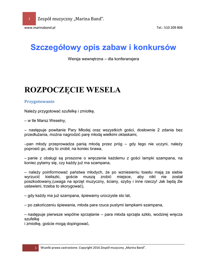Zespół muzyczny „Marina Band”. 1 www.marinaband.pl Tel.: 510 209 806 Szczegółowy opis zabaw i konkursów Wersja wewnętrzna – dla konferansjera ROZPOCZĘCIE WESELA Przygotowanie Należy przygotować szufelkę i zmiotkę. – w tle Marsz Weselny, – następuje powitanie Pary Młodej oraz wszystkich gości, dosłownie 2 zdania bez przedłużania, można nagrodzić parę młodą wielkimi oklaskami, –pan młody przeprowadza panią młodą przez próg – gdy tego nie uczyni, należy poprosić go, aby to zrobił, na koniec brawa, – panie z obsługi są proszone o wręczenie każdemu z gości lampki szampana, na koniec pytamy się, czy każdy już ma szampana, – należy poinformować państwa młodych, że po wzniesieniu toastu mają za siebie wyrzucić kieliszki, goście muszą zrobić miejsce, aby nikt nie został poszkodowany,(uwaga na sprzęt muzyczny, ściany, szyby i inne rzeczy! Jak będą źle ustawieni, trzeba to skorygować), – gdy każdy ma już szampana, śpiewamy uroczyste sto lat, – po zakończeniu śpiewania, młoda para rzuca pustymi lampkami szampana, – następuje pierwsze wspólne sprzątanie – para młoda sprząta szkło, wodzirej wręcza szufelkę i zmiotkę, goście mogą dopingować, 1 Wszelki prawa zastrzeżone. Copyright 2016 Zespół muzyczny „Marina Band”. Zespół muzyczny „Marina Band”. 2 www.marinaband.pl Tel.: 510 209 806 – po chwili panie z obsługi są proszone o pomoc parze młodej, pomagają sprzątać, – można teraz zaprosić wszystkich gości na uroczysty obiad. ZABAWY W TRAKCIE BLOKÓW MUZYCZNYCH POZNAWANIE SIĘ Ta zabawa jest przeprowadzana na początku wesela. Prowadzący prosi aby stworzyć dwa koła, zewnętrzne tworzą panie, a panowie są w środku. Orkiestra zaczyna grać, panie kręcą się w jedną stronę, a panowie w drugą. Gdy muzyka umilknie, na znak prowadzącego panowie się odwracają, następuje wzajemnie przedstawienie się i przywitanie. Można też powiedzieć kilka słów o sobie. Udział biorą goście i Para Młoda. Całość należy kilkukrotnie powtórzyć, celem przełamania “pierwszych lodów”. Kolejność następnych zabaw nie jest istotna. Zabawy są przeprowadzone w blokach muzycznych, lub na ich początku. HARLEM SHAKE Przygotowanie zabawy – goście otrzymują od zespołu rekwizyty, – część osób może zabrać rekwizyty we własnym zakresie, korzystając z przedmiotów znajdujących się na sali, – następnie przebieramy parę młodą – mogą to być np. zabawne maski lub kostiumy. 2 Wszelki prawa zastrzeżone. Copyright 2016 Zespół muzyczny „Marina Band”. Zespół muzyczny „Marina Band”. 3 www.marinaband.pl Tel.: 510 209 806 Przebieg zabawy – para młoda wykonuje na środku sali improwizowany układ choreograficzny do odtwarzanego utworu, stojąc przed kamerą – jest to skromny taniec, bez specjalnych „akrobacji”, – następnie dołączają goście, którzy tańczą w tle, – każdy musi wykonać taniec adekwatny do rodzaju rekwizytu, który trzyma w ręku. Efektem końcowym jest ciekawy film. Goście są zwykle bardzo pomysłowi i mają ciekawe propozycje na taniec. KONKURS TAŃCA DLA PANÓW Opis konkursu Konkurs polega na wyłonieniu męskich par, które najlepiej zatańczą. Nagrodą jest oczywiście butelka wódki dla zwycięzców. Werdykt ogłasza para młoda. Para młoda może również decydować o dodatkowych rozgrywkach itd. Przygotowanie konkursu – przygotowujemy 2 krzesełka, ustawiając je z boku parkietu – będą to krzesełka dla pary młodej, – prosimy parę młodą o zajęcie miejsc, – zapraszamy wszystkich gości na parkiet, – wyłaniamy jak największą liczbę mężczyzn – z zastrzeżeniem, że musi to być liczba parzysta, 3 Wszelki prawa zastrzeżone. Copyright 2016 Zespół muzyczny „Marina Band”. Zespół muzyczny „Marina Band”. 4 www.marinaband.pl Tel.: 510 209 806 – tworzymy męskie pary – jeden pan podwiązuje nogawki (staje się tym samym kobietą w parze). W przypadku braku chęci zagrania roli kobiety, przeprowadzamy rzut monetą. W ostateczności para młoda może zadecydować, kto odegra rolę damską. Przebieg konkursu Odtwarzane są następujące utwory 1. Tango Tutaj potrzebny jest rekwizyt w postaci róży. Warto zachęcać panów, żeby tańczyli prawdziwe tango. 2. Rock and roll 3. Techno 4. Utwór miłosny Panowie mają za zadanie odegrać rolę zakochanych. Należy tak kierować zabawę, żeby pary jak najlepiej wczuwały się w role 5. Kowbojski taniec Można proponować sposoby tańczenia np. – przeskakujemy przez siebie jak żaby, – łapiemy się za ręce w łokciach itd. 6. Gangnam style Można zaproponować panom, aby jeden z nich był np. tarzanem. 7. Polka – panowie muszą gwizdać, – skaczemy po całej sali, zajmując jak największy obszar, 4 Wszelki prawa zastrzeżone. Copyright 2016 Zespół muzyczny „Marina Band”. Zespół muzyczny „Marina Band”. 5 www.marinaband.pl Tel.: 510 209 806 8. Breakdance „Taniec na głowie”. 9. Jeden pan jest rurą, drugi tańczy (ta opcja jest zależna od sytuacji na weselu i od tego, czy panowie wykażą chęć do tego typu zabaw). ZABAWA W PRZEKŁADANIE RĄK Przygotowanie zabawy – zapraszamy na parkiet jak największą liczbę osób, – prosimy gości o dobranie się w pary, – następnie pary ustawiamy jedna za drugą, tak aby stworzyć okrąg wokół parkietu – pary ustawiane są podobnie, jak podczas poloneza studniówkowego, – panie po prawej stronie, panowie po lewej, – tworzymy zamknięte koło, – pary trzymają się oburącz, – prawa ręka pana trzyma prawą rękę pani – ręce są złączone na krzyż, – lewa ręka pana trzyma lewą rękę pani. Przeprowadzenie zabawy – informujemy gości o komendach, jakie będą się pojawiały podczas występu: panie do prawej – panie ustawiają się z prawej strony, panie do lewej – panie ustawiają się z lewej strony, panie do przodu – partner puszcza partne