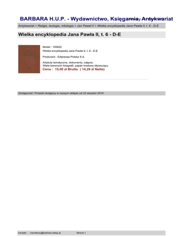Utworzono Antykwariat : 07 marzec 2017 BARBARA H.U.P. - Wydawnictwo, Księgarnia, Antykwariat > Religia, teologia, mitologia > Jan Paweł II > Wielka encyklopedia Jana Pawła II, t. 6 - D-E Wielka encyklopedia Jana Pawła II, t. 6 - D-E Model : 100622 Wielka encyklopedia Jana Pawła II, t. 6 - D-E Producent : Edipresse Polska S.A. Artykuły tematyczne, dokumenty, zdjęcia. Wiele barwnych fotografii, papier kredowy błyszczący. Cena : 15,00 zł Brutto ( 14,29 zł Netto) Dostępność: Produkt dostępny w naszym sklepie od 23 sierpień 2014 kontakt : - [email protected] Strona 1