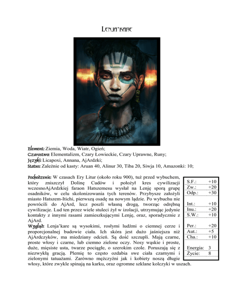 Lenja’kare ę Ziemia, Woda, Wiatr, Ogień; Elementalizm, Czary Łowieckie, Czary Uprawne, Runy; Licapoxi, Annana, AjArdzki; Zależnie od kasty: Aruan 40, Alinur 30, Tiba 20, Siwja 10, Amazonki: 10; W czasach Ery Litur (około roku 900), tuż przed wybuchem, który zniszczył Dolinę Cudów i położył kres cywilizacji S.F.: wczesnoAjArdzkiej faraon Hatszemesu wysłał na Lenję sporą grupę Zw.: osadników, w celu skolonizowania tych terenów. Przybysze założyli Odp.: miasto Hatszem-Itichi, pierwszą osadę na nowym lądzie. Po wybuchu nie powrócili do AjArd, lecz poszli własną drogą, tworząc odrębną Int.: cywilizacje. Lud ten przez wiele stuleci żył w izolacji, utrzymując jedynie Inu.: kontakty z innymi rasami zamieszkującymi Lenję, oraz, sporadycznie z S.W.: AjArd. ą Lenja’kare są wysokimi, rosłymi ludźmi o ciemnej cerze i Per.: proporcjonalnej budowie ciała. Ich skóra jest dużo jaśniejsza niż Aut.: AjArdczyków, ma miedziany odcień. Są dość szczupli. Mają czarne, Cha.: proste włosy i czarne, lub ciemno zielone oczy. Nosy wąskie i proste, duże, mięsiste usta, twarze pociągłe, o szerokim czole. Poruszają się z Energia: niezwykłą gracją. Plemię to często ozdabia swe ciała czarnymi i Życie: zielonymi tatuażami. Zarówno mężczyźni jak i kobiety noszą długie włosy, które zwykle spinają na karku, oraz ogromne szklane kolczyki w uszach. +10 +20 +30 +10 +20 +10 +20 +5 +10 3 8 ł ść Ż Do 150 lat, starzeją się w nieco wolniej niż ludzie w naszym wymiarze. Dojrzałość osiągają w wieku 17 lat. . Są przywiązani do własnych tradycji i kultury. Nigdy nie negują swego sposobu życia uważając go za najdoskonalszy z możliwych. Cechuje ich pewna niechęć i ostrożność w kontaktach z przybyszami z Drecare i Torgeth. Obawiają się bowiem zbyt silnej ekspansji tych krain i zajęcia swoich ziem przez obcych, czego chcieliby uniknąć pamiętając wojny z AjArdczykami. Niechęć budzą w nich także zamorskie zwyczaje, z których wiele jest dla nich niezrozumiałych. Jest to wszakże lud odważny i bitny, często dający upust emocjom i znany z gorącego temperamentu. Szlachtę cechuje silne poczucie honoru i obowiązku względem ochrony poddanych. Szeroko znana jest również wytrzymałość Lenja’kare na trud i zmęczenie. Mieszkańcy Lenji, to jedyna rasa ludzi, która potrafi obywać się bez snu przez dwa dni. Dziennie wystarcza im zaledwie pięć godzin drzemki. Słyną również z niezwykłej zręczności i szybkości, zarówno w biegu jak i w walce. Plemię to od wielu już lat toczy wojny z pajęczycami i czterorękimi zamieszkującymi dżunglę. Stąd ich wielka nienawiść do tych ras. Lenja’kare dopiero od niedawna utrzymują kontakty z Kontynentem Środka, dlatego też nie są przyzwyczajeni do widoku innych ras (np. Orta Vitra, krasnoludów czy gnomów). Przedstawiciele tych ras mogą więc liczyć na to, że ich pojawienie się na Lenji nie zostanie nie zauważone i wzbudzi wiele kontrowersji. Ród jest podstawą podziału majątku i pozycji społecznej – decyduje bowiem o przynależności do danej kasty. Kasta decyduje zaś o miejscu obywatela w życiu, zakresie jego obowiązków i dostępnych przywilejach. Podział ten przebiega następująco: najwyższa kasta, to grupa rządząca: Aruan, niżej znajdują się magowie – Alinur i wojownicy – Tiba. Najniższą kastę zajmują chłopi i robotnicy – Siwja. Władzę sprawuje męski potomek królewskiego rodu przy współudziale rady złożonej z Aruan i Alinur, który uważany jest za potomka boga słońca i otaczany najwyższą czcią. W większości lud ten zamieszkuje wzdłuż rzek, zajmując się uprawą ziemi. Dziełem Lenja’kare jest również kilka ogromnych miast, które wznoszą się u podnóża gór Xiquti i Astatat. Metropolie te wielkością nie ustępują miastom w DrecarE. Otacza je zwykle wysoki na kilkanaście metrów pierścień murów. Przedstawiciele tej rasy spotykają się tam w celach handlowych i towarzyskich. Plemię to nie zna techniki, za to dużym szacunkiem darzy magów, kapłanów i mędrców. Żyje w związkach poligamicznych, wszyscy mężczyźni mogą mieć kilka żon. Jednak również kobiety z kast wyższych niż Tiba mogą posiadać kilku mężów (zdarza się to jednak rzadko). Dżunglę Mgieł zamieszkuje również dzikie plemię Amazonek wywodzących się z tej rasy. Skłąda się ono z kobiet, które z różnych względów zmuszone były porzucić społeczeństwo i przez resztę Lenja’kare uznawane zostały za osoby spoza jakiejkolwiek kasty. Lenja’kare znani są powszechnie z wyrobu pięknych barwnych tkanin oraz naczyń i ozdób z barwionego szkła. Umieją też po mistrzowsku obrabiać cenne metale – zwłaszcza złoto i miedź, których kopalnie znajdują się w całym paśmie gór Astatat. Opracowany przez nich system melioracji pozwolił na stworzenie żyznych pól uprawnych na pogórzach, które mają zwykle postać upraw tarasowych. Hoduje się tam ryż, kukurydzę, topinambir, pszenicę a również tytoń, kawę, kakao, bawełnę i trzcinę cukrową. Lenja’kare trzymają również świnie i kozy – te ostatnie są dla nich świętymi zwierzętami. Aruan i Alinur ubierają kilka nakładających się na siebie tunik, oraz ozdobne tiary. Przedstawiciele kasty wojowników noszą wysokie buty, krótkie spódniczki, czasami naramienniki i metalowe naszyjniki. Kobiety z tej klasy na znak swej niezależności noszą często odkryte piersi. Siwja noszą zwykle tylko przepaskę biodrową i sandały – a i te ostatnie, nie zawsze. Na Lenji popularne są również ozdoby: tatuaże, duże metalowe bransolety i naszyjniki, oraz wisiory i kolczyki z kolorowego szkła. Kobiety noszą często na sobie suknie w postaci siatki z podłużnych, szklanych paciorków. Plemiona te nie znają mieczy czy toporów – najbardziej popularną wśród nich bronią jest włócznia, maczuga i łuk. Wojownicy używają oprócz tego 