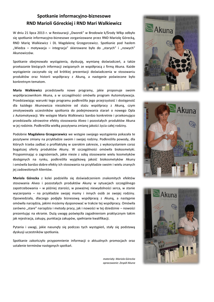 Spotkanie informacyjno-biznesowe RND Marioli Góreckiej i RND Mari Walkiewicz W dniu 21 lipca 2013 r. w Restauracji „Dworek” w Brodowie k/Środy Wlkp odbyło się spotkanie informacyjno-biznesowe zorganizowane przez RND Mariolę Górecką, RND Marię Walkiewicz i DL Magdalenę Grzegorzewicz. Spotkanie pod hasłem „Wiedza – motywacja – integracja” skierowane było do „starych” i „nowych” Akunowiczów. Spotkanie obejmowało wystąpienia, dyskusję, wymianę doświadczeń, a także przekazanie bieżących informacji związanych ze współpracą z firmą Akuna. Każde wystąpienie zaczynało się od krótkiej prezentacji doświadczenia w stosowaniu produktów oraz historii współpracy z Akuną, a następnie poświecone było konkretnym tematom. Maria Walkiewicz przedstawiła nowe programy, jakie proponuje swoim współpracownikom Akuna, a w szczególności omówiła program Automotywacja. Przedstawiając warunki tego programu podkreśliła jego przejrzystość i dostępność dla każdego Akunowicza niezależnie od stażu współpracy z Akuną, czym zmotywowała uczestników spotkania do podejmowania starań o nowego Opla z Automotywacji. We wstępie Maria Walkiewicz bardzo konkretnie i przekonująco przedstawiła zdrowotne efekty stosowania Alveo i pozostałych produktów Akuna w jej rodzinie. Podkreśliła wielką pozytywna zmianę jakości życia całej rodziny. Podobnie Magdalena Grzegorzewicz we wstępie swojego wystąpienia pokazała te pozytywne zmiany na przykładzie swoim i swojej rodziny. Podkreśliła powody, dla których trzeba zadbać o profilaktykę w szerokim zakresie, z wykorzystaniem coraz bogatszej oferty produktów Akuny. W szczególności omówiła biokosmetyki. Przypominając o zagrożeniach, jakie niesie z sobą stosowanie wielu kosmetyków dostępnych na rynku, podkreśliła wyjątkową jakość biokosmetyków Akuny i omówiła bardzo dobre efekty ich stosowania na przykładzie swoim i wielu znanych jej zadowolonych klientów. Mariola Górecka z kolei podzieliła się doświadczeniem znakomitych efektów stosowania Alveo i pozostałych produktów Akuny w sytuacjach szczególnego zapotrzebowania – w później starości, w poważnej niewydolności serca, w stanie wyczerpania – na przykładzie swojej mamy i innych osób ze swojej rodziny. Opowiedziała, dlaczego podjęła biznesową współpracę z Akuną, a następnie omówiła narzędzia, jakimi możemy dysponować w trakcie tej współpracy. Omówiła zarówno „stare” narzędzia i metody pracy, jak i nowości w tej dziedzinie – nowości prezentując na ekranie. Dużą uwagę poświęciła zagadnieniom praktycznym takim jak rejestracja, zakupy, punktacja zakupów, spełnianie kwalifikacji. Pytania i uwagi, jakie nasunęły się podczas tych wystąpień, stały się podstawą dyskusji uczestników spotkania. Spotkanie zakończyło przypomnienie informacji o aktualnych promocjach oraz ustalenie terminów następnych spotkań. materiały: Mariola Górecka opracowanie: Zespół Akuna