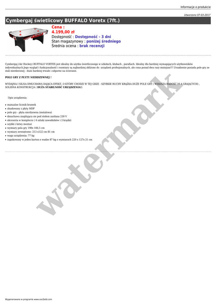 Informacje o produkcie Utworzono 07-03-2017 Cymbergaj świetlicowy BUFFALO Voretx (7ft.) Cena : 4.199,00 zł Dostępność : Dostępność - 3 dni Stan magazynowy : poniżej średniego Średnia ocena : brak recenzji Cymbergaj (Air Hockey) BUFFALO VORTEX jest idealny do użytku świetlicowego w szkołach, klubach , parafiach. Idealny dla bardziej wymagających użytkowników indywidualnych.Jego wygląd i funkcjonalność i rozmiary są najbardziej zbliżone do urządzeń profesjonalnych, ale cena ponad dwa razy mniejsza!!! Urzadzenie posiada pole gry ze stali nierdzewnej - dużo bardziej trwałe i odporne na ścieranie. POLE GRY Z PŁYTY NIERDZEWNEJ ! Opis urządzenia: er m ar k WYDAJNA I SILNA DMUCHAWA DAJĄCA EFEKT, O KTÓRY CHODZI W TEJ GRZE - SZYBKIE RUCHY KRĄŻKA DUŻE POLE GRY ( WIĘKSZA RADOŚĆ DLA GRAJĄCYCH) , SOLIDNA KONSTRUKCJA ( DUŻA STABILNOŚĆ URZĄDZENIA!) manualne licznik bramek ● zbudowany z płyty MDF ● pole gry - płyta nierdzewna (metalowa) ● dmuchawa znajdująca sie pod stołem zasilana 230 V ● akcesoria w komplecie ( 4 sztuki zawodników i 3 krążki) ● szybki i łatwy montaż ● wymiary pola gry 198x 106,5 cm ● wymiary zewnętrzne: 213 x122 cm 81 cm ● waga urządzenia: 77 kg ● zapakowany w jeden karton o wadze 87 kg o wymiarach 220 x 127x 21 cm w at ● Wygenerowano w programie www.oscGold.com