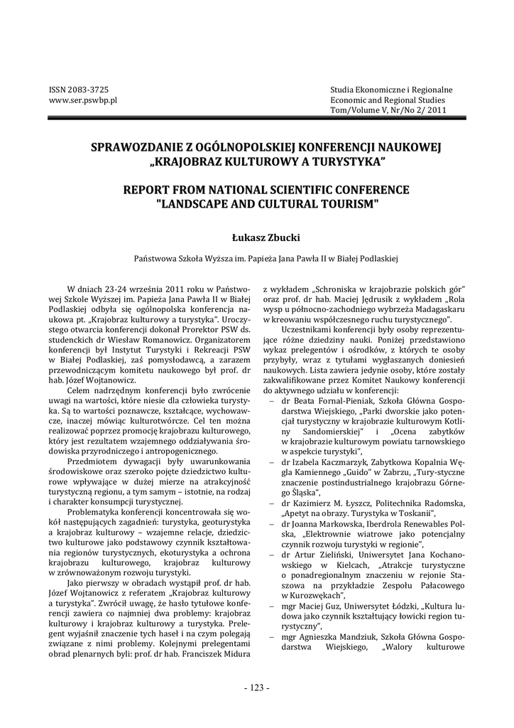 ISSN 2083-3725 www.ser.pswbp.pl Studia Ekonomiczne i Regionalne Economic and Regional Studies Tom/Volume V, Nr/No 2/ 2011 SPRAWOZDANIE Z OGÓLNOPOLSKIEJ KONFERENCJI NAUKOWEJ „KRAJOBRAZ KULTUROWY A TURYSTYKA” REPORT FROM NATIONAL SCIENTIFIC CONFERENCE "LANDSCAPE AND CULTURAL TOURISM" Łukasz Zbucki Państwowa Szkoła Wyższa im. Papieża Jana Pawła II w Białej Podlaskiej W dniach 23-24 września 2011 roku w Państwowej Szkole Wyższej im. Papieża Jana Pawła II w Białej Podlaskiej odbyła się ogólnopolska konferencja naukowa pt. „Krajobraz kulturowy a turystyka”. Uroczystego otwarcia konferencji dokonał Prorektor PSW ds. studenckich dr Wiesław Romanowicz. Organizatorem konferencji był Instytut Turystyki i Rekreacji PSW w Białej Podlaskiej, zaś pomysłodawcą, a zarazem przewodniczącym komitetu naukowego był prof. dr hab. Józef Wojtanowicz. Celem nadrzędnym konferencji było zwrócenie uwagi na wartości, które niesie dla człowieka turystyka. Są to wartości poznawcze, kształcące, wychowawcze, inaczej mówiąc kulturotwórcze. Cel ten można realizować poprzez promocję krajobrazu kulturowego, który jest rezultatem wzajemnego oddziaływania środowiska przyrodniczego i antropogenicznego. Przedmiotem dywagacji były uwarunkowania środowiskowe oraz szeroko pojęte dziedzictwo kulturowe wpływające w dużej mierze na atrakcyjność turystyczną regionu, a tym samym – istotnie, na rodzaj i charakter konsumpcji turystycznej. Problematyka konferencji koncentrowała się wokół następujących zagadnień: turystyka, geoturystyka a krajobraz kulturowy – wzajemne relacje, dziedzictwo kulturowe jako podstawowy czynnik kształtowania regionów turystycznych, ekoturystyka a ochrona krajobrazu kulturowego, krajobraz kulturowy w zrównoważonym rozwoju turystyki. Jako pierwszy w obradach wystąpił prof. dr hab. Józef Wojtanowicz z referatem „Krajobraz kulturowy a turystyka”. Zwrócił uwagę, że hasło tytułowe konferencji zawiera co najmniej dwa problemy: krajobraz kulturowy i krajobraz kulturowy a turystyka. Prelegent wyjaśnił znaczenie tych haseł i na czym polegają związane z nimi problemy. Kolejnymi prelegentami obrad plenarnych byli: prof. dr hab. Franciszek Midura z wykładem „Schroniska w krajobrazie polskich gór” oraz prof. dr hab. Maciej Jędrusik z wykładem „Rola wysp u północno-zachodniego wybrzeża Madagaskaru w kreowaniu współczesnego ruchu turystycznego”. Uczestnikami konferencji były osoby reprezentujące różne dziedziny nauki. Poniżej przedstawiono wykaz prelegentów i ośrodków, z których te osoby przybyły, wraz z tytułami wygłaszanych doniesień naukowych. Lista zawiera jedynie osoby, które zostały zakwalifikowane przez Komitet Naukowy konferencji do aktywnego udziału w konferencji: − dr Beata Fornal-Pieniak, Szkoła Główna Gospodarstwa Wiejskiego, „Parki dworskie jako potencjał turystyczny w krajobrazie kulturowym Kotliny Sandomierskiej” i „Ocena zabytków w krajobrazie kulturowym powiatu tarnowskiego w aspekcie turystyki”, − dr Izabela Kaczmarzyk, Zabytkowa Kopalnia Węgla Kamiennego „Guido” w Zabrzu, „Tury-styczne znaczenie postindustrialnego krajobrazu Górnego Śląska”, − dr Kazimierz M. Łyszcz, Politechnika Radomska, „Apetyt na obrazy. Turystyka w Toskanii”, − dr Joanna Markowska, Iberdrola Renewables Polska, „Elektrownie wiatrowe jako potencjalny czynnik rozwoju turystyki w regionie”, − dr Artur Zieliński, Uniwersytet Jana Kochanowskiego w Kielcach, „Atrakcje turystyczne o ponadregionalnym znaczeniu w rejonie Staszowa na przykładzie Zespołu Pałacowego w Kurozwękach”, − mgr Maciej Guz, Uniwersytet Łódzki, „Kultura ludowa jako czynnik kształtujący łowicki region turystyczny”, − mgr Agnieszka Mandziuk, Szkoła Główna Gospodarstwa Wiejskiego, „Walory kulturowe - 123 - Studia Ekonomiczne i Regionalne Nr 2 (V) 2011 w krajobrazie leśnym na przykładzie Nadleśnictwa Tomaszów”, − mgr Paulina Mrowczyk, mgr Grzegorz Madeja, Akademia Górniczo-Hutnicza, „Geoturystyka szansą krajów rozwijających się na przykładzie Rumunii”, − mgr Agnieszka Nowak, mgr Natalia Tokarczyk, mgr Justyna Cygan, Uniwersytet Jagielloński, „Waloryzacja wybranych szlaków turystycznych w powiecie nowotarskim dla potrzeb ekoturystyki”, − mgr Tomasz Parusel, Uniwersytet Śląski, „Regiony geoekoturystyczne w północno-zachodniej części Tadżykistanu” i „Zabytkowe dworce kolejowe w Polsce jako potencjalne atrakcje turystyczne”, − mgr Kamila Węglarska, Uniwersytet Marii Curie Skłodowskiej, „Rola dziedzictwa kulturowego w procesie budowania marki terytorialnej”, − mgr Łukasz Zbucki, PSW w Białej Podlaskiej, „Czy obiekty geoturystyczne są atrakcyjne?”. W konferencji uczestniczyli ponadto zebrani nauczyciele akademiccy z regionu, studenci oraz zainteresowane zagadnieniem osoby. Tematyka konferencji skupiła się wokół aktualnych współcześnie problemów szeroko pojętej kulturowości w turystyce. Temat przewodni mówiący o krajobrazie kulturowym stanowi problem badawczy dla wielu środowisk naukowych w Polsce i na świecie. W trakcie obrad podejmowano zagadnienia wskazujące na problem prowadzenia dalszych badań dotyczących miejsca człowieka w zmieniającym się środowisku kulturowym. Wielokrotnie wskazywano na wpływ turystyki masowej na zachowania oraz styl życia ludności autochtonicznej w miejscach regularnie eksplo- Sprawozdanie z ogólnopolskiej... atowanych. W związku z tym zauważa się negatywne zmiany w warstwie kultury materialnej decydującej o zewnętrznym obliczu krajobrazu (degradacja środowiska naturalnego, urbanizacja itp.). Nieodzownym elementem krajobrazu jest również kultura niematerialna (duchowa) człowieka, która określa takie zjawiska jak obrzędy, zwyczaje, stosunki społecznie, religię itp. Zdaniem wielu prelegentów wartości kultury materialnej i duchowej należy pielęgnować i kultywować 