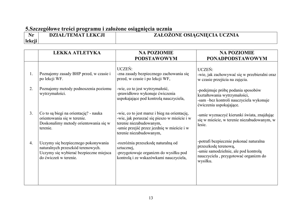 5.Szczegółowe treści programu i załoŜone osiągnięcia ucznia Nr lekcji DZIAŁ/TEMAT LEKCJI LEKKA ATLETYKA ZAŁOśONE OSIĄGNIĘCIA UCZNIA NA POZIOMIE PODSTAWOWYM NA POZIOMIE PONADPODSTAWOWYM UCZEŃ: -zna zasady bezpiecznego zachowania się przed, w czasie i po lekcji WF, UCZEŃ: -wie, jak zachowywać się w przebieralni oraz w czasie przejścia na zajęcia. Poznajemy metody podnoszenia poziomu wytrzymałości. -wie, co to jest wytrzymałość, -prawidłowo wykonuje ćwiczenia uspokajające pod kontrolą nauczyciela, -podejmuje próbę podania sposobów kształtowania wytrzymałości, -sam –bez kontroli nauczyciela wykonuje ćwiczenia uspokajające. 3. Co to są biegi na orientację? - nauka orientowania się w terenie. Doskonalimy metody orientowania się w terenie. -wie, co to jest marsz i bieg na orientację, -wie, jak poruszać się pieszo w mieście i w terenie niezabudowanym, -umie przejść przez jezdnię w mieście i w terenie niezabudowanym, -umie wyznaczyć kierunki świata, znajdując się w mieście, w terenie niezabudowanym, w lesie. 4. Uczymy się bezpiecznego pokonywania naturalnych przeszkód terenowych. Uczymy się wybierać bezpieczne miejsca do ćwiczeń w terenie. -rozróŜnia przeszkodę naturalną od sztucznej, -przygotowuje organizm do wysiłku pod kontrolą i ze wskazówkami nauczyciela, -potrafi bezpiecznie pokonać naturalna przeszkodę terenową, -umie samodzielnie, ale pod kontrolą nauczyciela , przygotować organizm do wysiłku. 1. Poznajemy zasady BHP przed, w czasie i po lekcji WF. 2. 13 5. Nauka techniki biegu na krótkich dystansach /nauka koordynacji ruchu NN i RR/. Doskonalimy technikę biegową /koordynacja pracy NN i RR/. -umie wykonać skip A i C -wykonuje ćwiczenia NN i RR. -umie wykonać skip A,B i C. -wykonuje poprawnie ćwiczenia NN i RR. -podejmuje próbę samooceny. 6. Sami organizujemy konkurs biegów na krótkim dystansie. -bierze udział w organizacji biegów. -bierze udział w sędziowaniu biegu. 7. Uczymy się startu niskiego. -przygotowujemy organizm do wysiłku pod kontrolą nauczyciela. -samodzielnie , ale pod kontrolą n-la potrafi przygotować organizm do wysiłku. 8. Organizujemy gry i zabawy doskonalące reakcję na sygnały wzrokowe i słuchowe. -reaguje poprawnie na sygnały wzrokowe i słuchowe. -prawidłowo wykonuje start niski. 9. Nauka startu niskiego z bloków. -bierze udział w organizacji biegów. -umie obiektywnie ocenić technikę startu niskiego z bloków. 10. Organizujemy konkurs biegów na dystansie 60 m. -umie zmierzyć i odczytać czas na stoperze. -bierze udział w sędziowaniu i mierzeniu czasu kolegów. 11. Nauka przekazywania pałeczki sztafetowej -wykonuje zmianę pałeczki sztafetowej w – nauka pracy w zespole. truchcie. -wie na czym polega praca zespołowa w biegu sztafetowym. -potrafi przeprowadzić ćwiczenia z przekazywaniem pałeczki sztafetowej. -wykonuje zmianę pałeczki sztafetowej w biegu. 12. Organizujemy marszobieg w terenie/ok. 800-1000 m /. -samodzielnie, ale pod kontrolą n-la przeprowadza rozgrzewkę przygotowującą organizm do wysiłku. 13. Marszobieg w terenie /1500-1800 m/. -pod kontrolą i ze wskazówkami n-la przeprowadza rozgrzewkę przygotowującą organizm do wysiłku. 14 14. Nauka taktyki biegu na długim dystansie – -wie, na czym polega rozłoŜenie sił na nauka biegu na łuku i po prostej. długim dystansie. -umie rozłoŜyć siły podczas biegu na długim dystansie. -wie , jak zachować się podczas biegu na prostej i po łuku. 15. Co trzeba zrobić aby skoczyć jak najdalej. -zna ćwiczenia skocznościowe, -wykonuje skok w dal dowolną techniką, -umie jednonóŜ odbić się z deski do skoku w dal. -prawidłowo posługuje się taśmą mierniczą. -potrafi wybrać i przeprowadzić przy pomocy n-la zadania przygotowujące organizm do ćwiczeń skocznościowych, -wykonuje skok w dal z prawidłowym odbiciem i lądowaniem. 16. Nauka skoku w dal techniką naturalną , nauka wymierzania rozbiegu. -prawidłowo wykonuje skok w dal. -prawidłowo mierzy długość rozbiegu. 17. Uczymy się skoku wzwyŜ techniką naturalną. 18. Doskonalimy technikę skoku wzwyŜ techniką naturalną. -pod kontrolą n-la przeprowadza rozgrzewkę -samodzielnie , ale pod kontrolą n-la przygotowującą organizm do wysiłku. przeprowadza rozgrzewkę przygotowującą organizm do wysiłku. -wykonuje skok wzwyŜ techniką naturalną. -prawidłowo wykonuje skok wzwyŜ techniką naturalną. -pomaga w organizacji konkursu. 19. Nauka techniki rzutu piłeczką palantową. Gry i zabawy doskonalące technikę rzutu piłeczką palantową. -pod kontrolą i ze wskazówkami n-la proponuje ćwiczenia rozgrzewające obręcz barkową. -potrafi rzucić piłeczką palantową z miejsca. 20. Konkurs rzutu piłeczką palantową-sami mierzymy długość rzutu. -podejmuje próbę oceny odległości rzutu. -umie zmierzyć odległość rzutu. -bierze udział w konkursie rzutów. 15 -samodzielnie proponuje ćwiczenia rozgrzewające obręcz barkową. -pod kontrolą n-la wykonuje rozgrzewkę obręczy barkowej. -wykonuje rzut piłeczką palantową z rozbiegu. -ocenia odległość rzutu z dokładnością do 1m. 21. Uczymy się posługiwać dowolnym testem sprawności fizycznej. Sami układamy test sprawności fizycznej. -uczestniczy w układaniu prób do testu sprawności fizycznej. -propozycje , jakie podaje świadczą o tym , Ŝe dobrze rozumie pojęcia związane z testem sprawności fizycznej. 22. Uczymy się prowadzić rozgrzewkę w sali gimnastycznej. -ma podstawowy zasób słownictwa. -zna podstawowe zasady przeprowadzania rozgrzewki. -zna podstawowe pozycje wyjściowe do ćwiczeń. -umie wykorzystać do rozgrzewki przyrządy i przybory znajdujące się w sali gimnastycznej. 23. Wykorzystujemy wybrane przedmioty do wyrabiania siły. -rozgrzewkę wykonuje pod kierunkiem n-la. -organizuje konkurs rzutów. 24. Rzucamy piłką lekarską w tył zza głowy. Organizujemy konkurs rzutów piłką lekarską. -wykonuje rzut piłką le