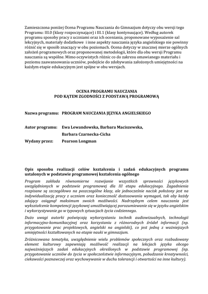 Zamieszczona poniżej Ocena Programu Nauczania do Gimnazjum dotyczy obu wersji tego Programu: III.0 (klasy rozpoczynające) i III.1 (klasy kontynuujące). Według autorek programu sposoby pracy z uczniami oraz ich oceniania, proponowane wyposażenie sal lekcyjnych, materiały dodatkowe i inne aspekty nauczania języka angielskiego nie powinny różnić się w sposób znaczący w obu poziomach. Ocena dotyczy w znacznej mierze ogólnych założeń programowych oraz proponowanej metodologii, które dla obu wersji Programu nauczania są wspólne. Mimo oczywistych różnic co do zakresu omawianego materiału i poziomu zaawansowania uczniów, podejście do zdobywania założonych umiejętności na każdym etapie edukacyjnym jest spójne w obu wersjach. OCENA PROGRAMU NAUCZANIA POD KĄTEM ZGODNOŚCI Z PODSTAWĄ PROGRAMOWĄ Nazwa programu: PROGRAM NAUCZANIA JĘZYKA ANGIELSKIEGO Autor programu: Ewa Lewandowska, Barbara Maciszewska, Barbara Czarnecka-Cicha Wydany przez: Pearson Longman Opis sposobu realizacji celów kształcenia i zadań edukacyjnych programu ustalonych w podstawie programowej kształcenia ogólnego Program zakłada równomierne rozwijanie wszystkich sprawności językowych uwzględnionych w podstawie programowej dla III etapu edukacyjnego. Zagadnienia rozpisane są szczegółowo na poszczególne klasy, ale jednocześnie nacisk położony jest na indywidualizację pracy z uczniem oraz konieczność dostosowania wymagań, tak aby każdy zdający osiągnął maksimum swoich możliwości. Nadrzędnym celem nauczania jest wykształcenie kompetencji językowej umożliwiającej porozumiewanie się w języku angielskim i wykorzystywanie go w typowych sytuacjach życia codziennego. Dużo uwagi autorki poświęcają wykorzystaniu technik audiowizualnych, technologii informacyjno-komunikacyjnej oraz korzystaniu z różnorodnych źródeł informacji (np. przygotowanie prac projektowych, angielski na angielski), co jest jedną z ważniejszych umiejętności kształtowanych na etapie nauki w gimnazjum. Zróżnicowana tematyka, uwzględnienie wielu problemów społecznych oraz rozbudowany element kulturowy zapewniają możliwość realizacji na lekcjach języka obcego najważniejszych zadań edukacyjnych określonych w podstawie programowej (np. przygotowanie uczniów do życia w społeczeństwie informacyjnym, pobudzanie kreatywności, ciekawości poznawczej oraz wychowywanie w duchu tolerancji i otwartości na inne kultury). Opis szczegółowych celów kształcenia i wychowania zawartych w programie Opis szczegółowych celów kształcenia i wychowania odpowiada zapisom zawartym w podstawie programowej dla III etapu edukacyjnego. Cele kształcenia to przede wszystkim umiejętności, których opanowanie zapewnia uczniom sprawne funkcjonowanie we współczesnym świecie czyli komunikowanie się w mowie i piśmie w języku obcym. Cele wychowawcze najpełniej rozwijane są w zaproponowanym programie w zakresie współdziałania w grupie oraz wdrażania uczniów do samodzielności w procesie uczenia się języka obcego. Opis zgodności treści programu z podstawą programową: Treści zawarte w programie są zgodne z podstawą programową, chociaż część z nich zdecydowanie wykracza poza możliwości przeciętnego ucznia na tym etapie. Dotyczy to zwłaszcza części zawierającej konstrukcje zdaniowe i zakres materiału gramatycznego, który wyczerpuje bardzo szeroki zakres zagadnień odpowiadający obecnym wymaganiom do matury na poziomie podstawowym, a częściowo nawet rozszerzonym. Zakładam, że taki poszerzony zakres treści umożliwia nauczycielowi pracę z uczniem zdolnym, ale jednocześnie będzie on wymagał indywidualnego dobór zagadnień dla poszczególnych klas i uczniów i ograniczenia tych treści dla klas/uczniów o niższych umiejętnościach. Opis osiągania celów kształcenia i wychowania z uwzględnieniem możliwości indywidualizacji pracy w zależności od potrzeb i możliwości uczniów oraz warunków dydaktycznych Program przedstawia sposoby osiągania celów w różnych aspektach. Odnosi się nie tylko do zalecanych metod nauczania zapewniających jak największą komunikatywność oraz technik umożliwiających rozwijanie poszczególnych sprawności językowych, ale zaleca także dopasowanie tych metod do odbiorcy poprzez rozpoznanie potrzeb uczniów, ich stylów uczenia się oraz zainteresowań. Duży nacisk położony na autonomię zdającego oraz wypracowanie w uczniach dążenia do samodzielnego zdobywania wiedzy i planowania swojego rozwoju jest niewątpliwie dużym atutem tego programu i jedną z kluczowych metod osiągnięcia celów kształcenia (zróżnicowanych dla poszczególnych klas/uczniów). Opis założonych osiągnięć ucznia Wymagania ogólne i szczegółowe wyszczególnione w podstawie programowej są zakładanym minimum, jakie osiągną przeciętni uczniowie. Program przewiduje znaczne poszerzenie treści nauczania, umożliwiające osiągnięcie znacznie wyższej kompetencji językowej uczniom o wyższym możliwościach. Dostosowanie treści do poziomu ucznia jest zadaniem nauczyciela. W przypadku programu nauczania ogólnego, uwzględniającego dotychczasową podstawę programową kształcenia ogólnego określoną w rozporządzeniu MENiS z dnia 26 lutego 2002r. w sprawie podstawy programowej wychowania przedszkolnego oraz kształcenia ogólnego w poszczególnych typach szkół (Dz. U. Nr 51, poz. 458, z późn. zm.) – opis założonych osiągnięć ucznia z uwzględnieniem standardów wymagań będących podstawą do przeprowadzania sprawdzianów i egzaminów, określonych w przepisach rozporządzenia MEN z dnia 10 sierpnia 2001r. w sprawie standardów wymagań będących podstawą przeprowadzania sprawdzianów i egzaminów (Dz.U.Nr 92, poz.1020, z późn. zm.) nie dotyczy Propozycje kryteriów oceny i metod sprawdzania osiągnięć ucznia Oprócz tradycyjnych sposobów oceny pracy uczniów, program proponuje wprowadzenie nowatorskiego systemu