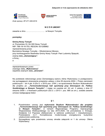 Załącznik nr 4 do zaproszenia do składania ofert Znak sprawy: ZP.271.028.2016 W Z Ó R UMOWY zawarta w dniu ……………………….. w Nowym Tomyślu pomiędzy: Gminą Nowy Tomyśl ul. Poznańska 33, 64-300 Nowy Tomyśl NIP: 788-19-16-753, REGON: 631258862 reprezentowaną przez: Burmistrza Nowego Tomyśla – Włodzimierza Hibnera przy kontrasygnacie Skarbnika Gminy Nowy Tomyśl- Pani Ludomiry Śpiączki, zwaną dalej „Zamawiającą”, a firmą : a …………………………………… reprezentowanym przez: zwanego dalej „Wykonawcą”, wspólnie zwanych dalej „stronami”. Na podstawie dokonanego przez Zamawiającą wyboru oferty Wykonawcy w postępowaniu nie wymagającym stosowania przepisów ustawy z dnia 29 stycznia 2004 r. Prawo zamówień publicznych – art 4 pkt. 8 (Dz.U. z 2015 poz. 2164 ), na opracowanie Studium Wykonalności dla projektu pn. „Termomodernizacja hali sportowej przy Gimnazjum im. Feliksa Szołdrskiego w Nowym Tomyślu”, i mając na uwadze art. 44 ust. 3 ustawy z dnia 27 sierpnia 2009 r. o finansach publicznych (Dz.U. z 2013 r. poz. 885 ze zm.), została zawarta umowa następującej treści: § 1. 1. 2. Przedmiotem umowy jest wykonanie Studium Wykonalności dla projektu „Termomodernizacja hali sportowej przy Gimnazjum im. Feliksa Szołdrskiego w Nowym Tomyślu”, w ramach Regionalnego Programu Operacyjnego Województwa Wielkopolskiego na lata 2014-2020, Oś priorytetowa 3. Energia, Działanie 3.2 Poprawa efektywności w sektorze publicznym i mieszkaniowym, Poddziałanie 3.2.1 Kompleksowa modernizacja energetyczna budynków użyteczności publicznej. Szczegółowy opis przedmiotu umowy określa załącznik nr 1 do umowy- Oferta Wykonawcy. 1 3. 4. 5. 6. Wykonawca oświadcza, że do realizacji przedmiotu umowy wyznacza Zespół, w skład którego wejdą: a) ………………………………………. b) ………………………………………. Wykonawca nie może powierzyć do wykonania Podwykonawcom innych części przedmiotu umowy, niż te, które wymienił w swojej ofercie, bez uprzedniej zgody Zamawiającej wyrażonej na piśmie. Wykonawca odpowiada wobec Zamawiającego za wszelkie działania lub zaniechania Podwykonawców, jak za własne działania lub zaniechania. Strony zobowiązują się do wzajemnego przekazywania sobie niezwłocznie wszelkich informacji mogących mieć wpływ na realizację Umowy. Wykonawca udzieli odpowiedzi w formie pisemnej na zgłaszane przez Zamawiającą uwagi dotyczące realizacji przedmiotu Umowy, w terminie nie dłuższym niż dwa dni robocze. § 2. Wykonawca zobowiązuje się do: 1. Wykonania powierzonego zadania w sposób profesjonalny 2. Opracowania Studium Wykonalności zgodnie z wytycznymi Instytucji Zarządzającej WRPO - Urzędu Marszałkowskiego Województwa Wielkopolskiego dostępnymi na stronie internetowej http://www.wrpo.wielkopolskie.pl, w szczególności z aktualnymi wytycznymi zatwierdzonymi przez Zarząd Województwa Wielkopolskiego - „Instrukcja do sporządzania Studium wykonalności (część opisowa oraz część obliczeniowa) do Poddziałania 3.2.1 Kompleksowa modernizacja budynków użyteczności publicznej oraz zgodnie z zapisami wniosku aplikacyjnego. 3. Dochowania w tajemnicy wszystkich otrzymanych informacji Zamawiającej. § 3. 1. Wykonawca zobowiązuje się do: a) wykonania przedmiotu umowy określonego w §1 do dnia 25 marca 2016r., b) dostarczenia drogą elektroniczną wersji roboczej dokumentu określonego w §1 do dnia 21 marca 2016r. c) niezwłocznego zawiadomienia Zamawiającej o jakichkolwiek przeszkodach w realizacji Przedmiotu umowy zgodnie z umową. 2. Wykonawca zapewnia gotowość do wprowadzenia zamian w Studium Wykonalności w przypadku zgłoszenia przez Instytucję Zarządzającą RPO Województwa Wielkopolskiego potrzeby wprowadzenia zmian do Studium Wykonalności, do momentu zaakceptowania przez Urząd Marszałkowski wniosku aplikacyjnego o dofinansowanie projektu wraz załącznikami pod względem formalnym i merytorycznym. § 4. 1. Za prawidłowe wykonanie przedmiotu umowy Wykonawca otrzyma wynagrodzenie w łącznej wysokości netto: …………………………………………………………… PLN (słownie:………………………………………………………..) plus …….podatek VAT w wysokości ………………………………………………………..………………….. PLN (słownie:……………………………………………………………), co daje łączną kwotę brutto w wysokości ………………………………………………………. PLN (słownie: ……………………………………). 2. Podwyższenie stawki podatku VAT, w trakcie trwania umowy, pozostaje bez wpływu na wysokość wynagrodzenia brutto. Obniżenie stawki podatku VAT, w trakcie trwania umowy, uprawnia Zamawiającej do obniżenia wynagrodzenia brutto o różnicę wynikającą z obniżenia stawki tego podatku. 3. Wynagrodzenie brutto, o którym mowa w ust. 1 zawiera wszelkie koszty jakie Wykonawca może ponieść w związku z realizacją przedmiotu umowy. Jest wynagrodzeniem ryczałtowym i nie może ulec podwyższeniu. 2 4. Wynagrodzenie, o którym mowa w ust. 1, zawiera wynagrodzenie z tytułu przeniesienia autorskich praw majątkowych do utworów, które mogą powstać w związku z wykonaniem przedmiotu umowy, na zasadach określonych w § 6. 5. Wynagrodzenie będzie płatne po wykonaniu przedmiotu umowy, w terminie 14 dni od daty doręczenia faktury, wystawionej na podstawie podpisanego protokołu odbioru. 6. Wykonawca wystawi fakturę VAT, o której mowa w ust. 5, na poniższe dane: Gmina Nowy Tomyśl, ul. Poznańska 33, 64-300 Nowy Tomyśl; NIP 7881916753. 7. Dniem zapłaty wynagrodzenia jest dzień wydania dyspozycji przelewu z rachunku bankowego Zamawiającej. Wykonawca nie może bez pisemnej zgody Zamawiającej przenieść wierzytelności wynikających z umowy na osobę trzecią. 8. Wykonawca nie może bez p