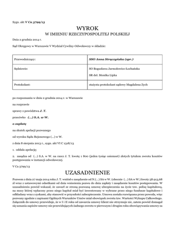 Sygn. akt V Ca 3799/13 WYROK W IMIENIU RZECZYPOSPOLITEJ POLSKIEJ Dnia 2 grudnia 2014 r. Sąd Okręgowy w Warszawie V Wydział Cywilny-Odwoławczy w składzie: Przewodniczący: SSO Anna Strączyńska (spr.) Sędziowie: SO Bogusława Jarmołowicz-Łochańska SR del. Monika Lipka Protokolant: stażysta protokolant sądowy Magdalena Zych po rozpoznaniu w dniu 2 grudnia 2014 r. w Warszawie na rozprawie sprawy z powództwa J. T. przeciwko (...) S.A. w W. o zapłatę na skutek apelacji pozwanego od wyroku Sądu Rejonowego (...) w W. z dnia 8 sierpnia 2013 r., sygn. akt VI C 1318/13 1. oddala apelację; 2. zasądza od (...) S.A. w W. na rzecz J. T. kwotę 1 800 (jeden tysiąc osiemset) złotych tytułem zwrotu kosztów postępowania w instancji odwoławczej. V Ca 3799/13 UZASADNIENIE Pozwem z dnia 27 maja 2014 roku J. T. wniósł o zasądzenie od N.(...) SA w W. (obecnie (...) SA w W.) kwoty 58.913,68 zł wraz z ustawowymi odsetkami od dnia wniesienia pozwu do dnia zapłaty i zasądzenie kosztów postępowania. W uzasadnieniu powód wskazał, że zawarł ze stroną pozwaną umowę ubezpieczenia na życie tzw. polisę kapitałową, na mocy której wpłacony przez niego kapitał miał być inwestowany w wybrane przez niego fundusze kapitałowe i odkładany wraz z zyskami, aby stanowić w przyszłości zabezpieczenie. Umowa została rozwiązana przez powoda, więc pozwany zgodnie z zapisami Ogólnych Warunków Umów miał obowiązek zwrotu tzw. Wartości Wykupu Całkowitego. Załącznik do umowy przewiduje, że w I i II roku od zawarcia umowy klient nie otrzymuje nic, zatem powód domagał się uznania zapisów umowy nie przewidujących żadnego zwrotu w pierwszym i drugim roku obowiązywania umowy za klauzule niedozwolone. Powód wskazywał na naruszenie przepisu art. 3851 kc i jego praw konsumenckich, powoływał podobne klauzule uznane za niedozwolone przez Sąd Apelacyjny w Warszawie i wskazał, ze obciążenie go opłatą 98 % środków zgromadzonych na rachunku było niedopuszczalne. W odpowiedzi na pozew strona pozwana wniosła o oddalenie powództwa. Przyznała, że zawarła umowę z powodem umowę ubezpieczenia na życie z ubezpieczeniowym funduszem kapitałowym ze składką regularną – roczną 60.000 zł, pod nazwą N. (...) w dniu 23 lutego 2012 roku. Umowa została zawarta na podstawie Ogólnych Warunków Ubezpieczenia na życie z ubezpieczeniowym funduszem kapitałowym, które weszły w życie w dniu 07 marca 2011 roku wraz z kartą parametrów obowiązującą od dnia 28 listopada 2011 roku. Powód przystąpił do umowy i oświadczył, że otrzymał, zna i akceptuje treść tych dokumentów. Dodatkowo powód podpisał załącznik do wniosku, w którym potwierdził wysokość kwot wypłacanych mu w związku z rozwiązaniem umowy – tzw. wykup całkowity i częściowy. Zarzuty powoda, że nie był należycie poinformowany lub, że warunki umowy są zawiłe, są zatem bezpodstawne. Powód miał 30 dni na przemyślenie i odstąpienie od umowy. Opłacił pierwszą składkę i nie opłacił drugiej, zatem umowa uległa rozwiązaniu z powodu braku jej kontynuacji. Strona pozwana wskazała też, ze na dzień rozwiązania umowy wysokość środków na Indywidualnym Rachunku Kapitałowym klienta wyniosła 60.115,87 zł. Wartość wykupu całkowitego w drugim roku obowiązywania polisy to natomiast 0 %, stąd odmowa wypłaty na rzecz powoda. Zdaniem strony pozwanej nie może być zatem mowy o klauzuli niedozwolonej. Ponadto ubezpieczyciel poniósł wysokie koszty ubezpieczenia i uruchomienia funduszu, zgodne z umowa i OWU, w tym prowizję i koszty wskazane w odpowiedzi na pozew. Wyrokiem z dnia 08 sierpnia 2013 roku Sąd Rejonowy dla (...) w W. zasądził od N. (...) SA w W. na rzecz J. T. kwotę 57.737,91 zł wraz z ustawowymi odsetkami od dnia 23 maja 2013 roku do dnia zapłaty, oddalił powództwo w pozostałym zakresie i zasądził od strony pozwanej na rzecz powoda kwotę 6.563 zł tytułem zwrotu kosztów postępowania. Sąd Rejonowy ustalił następujący stan faktyczny: J. T. zawarł z N. (...)SA w W. umowę ubezpieczenia na życie z ubezpieczeniowym funduszem kapitałowym ze składką regulowaną N. (...) w dniu 23 lutego 2012 roku. Umowę potwierdzała polisa nr (...). Integralną częścią umowy były Ogólne Warunki Ubezpieczenia na życie z ubezpieczeniowym funduszem kapitałowym ze składką regulowaną N.(...), zatwierdzone w dniu 03 marca 2011 roku, które weszły w życie w dniu 07 marca 2011 roku wraz z Kartą Parametrów, obowiązującą od dnia 28 listopada 2011 roku. Powód przystępując do umowy oświadczył, że otrzymał, zapoznał się i akceptuje treść OWU i załącznik do wniosku, w którym potwierdził wysokość kwot wypłacanych w razie rozwiązania umowy, tj. wartości wykupu częściowego i całkowitego. W dniu 20 lutego 2012 roku powód opłacił składkę ubezpieczeniową roczną w wysokości 60.000 zł, każda następna składka miała być płatna do 22 lutego każdego roku. W dniu 05 lutego 2013 roku J. T. skierował do ubezpieczyciela pismo, w którym złożył oświadczenie o wypowiedzeniu umowy i wezwał go do wypłaty środków zgromadzonych na indywidualnym rachunku kapitałowym. Wskazał, ze domaga się całości środków, ponieważ nie wiążą go postanowienia umowne przewidujące opłatę likwidacyjną, gdyż są niezgodne z art. 3851 kc. Pismem z dnia 25 marca 2013 roku strona pozwana poinformowała powoda, iż na polisie wystąpiła zaległość 60.000 zł i wskazała, że w razie braku wpłaty tej kwoty, polisa zostanie rozwiązana ze skutkiem na dzień 22 marca 2013 roku. Następnie pismem z dnia 29 marca 2013 roku strona pozwana poinformowała, że nie może przychylić się do wniosku o wypłatę wartości wykupu całkowitego, ponieważ istniała możliwość zapisania w umowie faktu istnienia opłat, które będzie musiał ponieść konsument w razie odstąpienia od umowy. Zgodnie z decyzją zarządu Towarzystwa w I i II roku polisowym