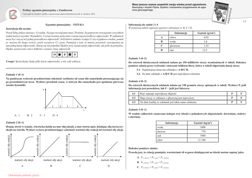 Copyright by ZamKor spółka z ograniczoną odpowiedzialnością S.K.A., Kraków 2014 Egzamin gimnazjalny – FIZYKA Instrukcja dla ucznia: Informacja do zadań 3 i 4 W poniższej tabeli zapisano gęstości substancji A, B, C i D. Przed Tobą arkusz złożony z 13 zadań. Na jego rozwiązanie masz 20 minut. Za poprawne rozwiązanie wszystkich zadań możesz uzyskać 20 punktów. Czytaj uważnie polecenia i zaznaczaj prawidłowe odpowiedzi. W zadaniach może być więcej niż jedna prawidłowa odpowiedź. Jeśli któreś zadanie wydaje Ci się wyjątkowo trudne, pomiń je; możesz do niego wrócić, jeżeli wystarczy Ci czasu. Pamiętaj o tym, że musisz przenieść rozwiązania na specjalną kartę odpowiedzi. Staraj się nie popełnić błędów przy zaznaczaniu odpowiedzi, ale jeśli się pomylisz, błędne zaznaczenie otocz kółkiem i zaznacz inną odpowiedź. 10 B Substancja sklep.z amko Skorzystaj z książki Fizyka. Szybkie i niezawodne przygotowanie do egzaminu gimnazjalnego. Próbny egzamin gimnazjalny z ZamKorem r.pl Masz jeszcze szansę uzupełnić swoją wiedzę przed egzaminem. 1/2 Gęstość (g/cm3) A oliwa 0,92 B woda 1,0 C gliceryna D rtęć 1,25 13,5 D Uwaga! Sprawdzane będą tylko karty odpowiedzi, a nie całe arkusze. Zadanie 3 (0–2) Do czterech identycznych szklanek nalano po 150 mililitrów cieczy wymienionych w tabeli. Dokończ poniższe zdania przez wybranie i otoczenie kółkiem litery, która w tabeli odpowiada danej cieczy. 3.1. Najmniejszą masę ma szklanka z A/B/C/D. Zadanie 1 (0–1) 3.2. Na dnie szklanki z A/B/C/D jest największe ciśnienie. Na poniższym wykresie przedstawiono zależność szybkości od czasu dla samochodu poruszającego się po prostoliniowym torze. Wybierz przedział czasu, w którym dla samochodu jest spełniona pierwsza zasada dynamiki. Zadanie 4 (0–3) Do czterech identycznych szklanek nalano po 150 gramów cieczy opisanych w tabeli. Wybierz P, jeśli informacja jest prawdziwa, lub F – jeśli jest fałszywa. 4.1 Rtęć zajmuje największą objętość. P F 4.2 Słup cieczy w szklance z gliceryną jest najwyższy. P F 4.3 Na dnie każdej ze szklanek jest takie samo ciśnienie. P F Zadanie 5 (0–1) A. 1 B. 2 C. 3 D. 4 W wodzie całkowicie zanurzano kolejno trzy klocki o jednakowych objętościach: drewniany, stalowy i ołowiany. Zadanie 2 (0–1) Substancja Drążąc otwór w ścianie, wiertarka działa na mur siłą (akcji), a mur stawia opór, działając siłą tarcia (reakcji) na wiertło. Wybierz wykres przedstawiający zależność wartości siły reakcji od wartości siły akcji. Gęstość (kg/m3) woda 1000 drewno 770 stal 7800 ołów 11 340 Dokończ poniższe zdanie: Prawdą jest, że relację pomiędzy wartościami sił wyporu działającymi na klocki można zapisać jako: Dokument pobrany przez: A. Fw. ołowiu > Fw. stali > Fw. drewna B. Fw. ołowiu < Fw. stali < Fw. drewna C. Fw. ołowiu = Fw. stali = Fw. drewna Próbny egzamin gimnazjalny z ZamKorem Zam Kor Copyright by ZamKor spółka z ograniczoną odpowiedzialnością S.K.A., Kraków 2014 2/2 Zadanie 6 (0–1) Jeśli jedną żaróweczkę wykręcimy, to: Zabawka wyrzutnia wyrzuca pionowo w górę stalową kuleczkę z szybkością 2 m/s. Jeśli odpowiednio mocniej ściśniemy sprężynę wyrzutni i zwolnimy ją, to kuleczka uzyska początkową szybkość 4 m/s. W drugim przypadku kuleczka osiągnie wysokość: A. pozostałe będą świecić jaśniej, B. pozostałe będą świecić ciemniej, C. pozostałe zgasną, D. jasność świecenia żaróweczek się nie zmieni. A. taką jak w pierwszym przypadku, B. dwa razy większą, Zadanie 10 (0–1) C. trzy razy większą, D. cztery razy większą. W poniższych grupach substancji, zaznacz tę, w której znajdują się tylko przewodniki prądu elektrycznego. Zadanie 7 (0–2) Wodę i olej o jednakowych masach ogrzewamy w taki sam sposób o tę samą liczbę stopni. Ciepła J J właściwe ogrzewanych cieczy są równe: cw = 4200 , c = 1900 . Wybierz P, jeśli inkg ⋅° C kg ⋅° C o formacja jest prawdziwa, lub F – jeśli jest fałszywa. 7.1 Do ogrzania wody trzeba dostarczyć ponad dwa razy więcej energii niż do ogrzania oleju. P F 7.2 Ogrzewanie oleju będzie trwało ponad dwukrotnie dłużej niż ogrzewanie wody. P F Odważnik zawieszony na sprężynie wykonuje drgania. W punkcie B sprężyna jest maksymalnie rozciągnięta, a w punkcie D maksymalnie ściśnięta. Oceń prawdziwość poniższych stwierdzeń. 8.2 8.3 8.4 Jeśli ruch odważnika z punktu A przez B do punktu C trwa 3 s, to okres drgań tego odważnika jest równy 12 s. W punktach A i C odważnik ma największą szybkość. Z punktu A do B odważnik porusza się ruchem przyspieszonym. Energia kinetyczna odważnika w punkcie A jest równa jego energii potencjalnej sprężystości w punkcie D (jeśli pominiemy zmianę energii potencjalnej grawitacyjnej). P F P F P F P F Zadanie 9 (0–1) 60 żaróweczek choinkowych połączonych tak, jak pokazano na rysunku, podłączono do domowej sieci elektrycznej. Dokument pobrany przez: A. woda, granit, marmur B. szkło, porcelana, drewno C. stal, nikiel, papier D. miedź, grafit, aluminium Zadanie 11 (0–1) Uczeń chce oznaczyć bieguny magnetyczne namagnesowanego pręta. Poniżej opisano trzy sposoby. 1. Należy zawiesić pręt poziomo na nitce i poczekać, aż przestanie się wahać. Znając kierunki geograficzne, będzie można oznaczyć bieguny magnetyczne pręta. Północny biegun pręta wskaże północny biegun geograficzny. 2. Do pręta należy zbliżyć stalowy gwóźdź. Ten koniec pręta, który przyciąga gwóźdź, jest jego biegunem północnym. Zadanie 8 (0–4) 8.1 3. Do pręta należy zbliżyć inny oznakowany magnes i skorzystać z zasady, że bieguny jednoimienne się odpychają, a różnoimienne się przyciągają. Który (które) z powyższych sposobów nie nadaje (nadają) się do określenia biegunów magnetycznych pręta. A. tylko 1 B. 1 i 2 C. 1 i 3 D. tylko 2 Zadanie 12 (0–1) Na taflę 