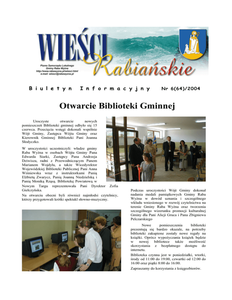 B i u l e t y n I n f o r m a c y j n y Nr 6(64)/2004 Otwarcie Biblioteki Gminnej Uroczyste otwarcie nowych pomieszczeń Biblioteki gminnej odbyło się 15 czerwca. Przecięcia wstęgi dokonali wspólnie Wójt Gminy, Zastępca Wójta Gminy oraz Kierownik Gminnej Biblioteki Pani Joanna Słodyczko. W uroczystości uczestniczyli: władze gminy Raba Wyżna w osobach Wójta Gminy Pana Edwarda Siarki, Zastępcy Pana Andrzeja Dziwisza, radni z Przewodniczącym Panem Marianem Wojdyła, a także Wicedyrektor Wojewódzkiej Biblioteki Publicznej Pani Anna Wiśniewska wraz z instruktorkami Panią Elżbietą Zwarycz, Panią Joanną Niedzielską i Panią Moniką Rząsą. Bibliotekę Powiatową w Nowym Targu reprezentowała Pani Dyrektor Zofia Giełczyńska. Na otwarciu obecni byli również najmłodsi czytelnicy, którzy przygotowali krótki spektakl słowno-muzyczny. Podczas uroczystości Wójt Gminy dokonał nadania medali pamiątkowych Gminy Raba Wyżna w dowód uznania i szczególnego wkładu wniesionego w rozwój czytelnictwa na terenie Gminy Raba Wyżna oraz tworzenia szczególnego wizerunku promocji kulturalnej Gminy dla Pani Alicji Gruca i Pana Zbigniewa Pelczarskiego Nowe pomieszczenia biblioteki prezentują się bardzo okazale, na potrzeby biblioteki zakupione zostały nowe regały na książki. Oprócz wypożyczania książek będzie w nowej bibliotece także możliwość skorzystania z bezpłatnego dostępu do internetu. Biblioteka czynna jest w poniedziałki, wtorki, środy od 11:00 do 19:00, czwartki od 12:00 do 16:00 oraz piątki 8:00 do 16:00. Zapraszamy do korzystania z księgozbiorów. Obowiązki wytwórców odpadów Wytwórca odpadów w zależności od ilości wytworzonych odpadów jest zobowiązany do uzyskania decyzji zatwierdzającej program gospodarki odpadami niebezpiecznymi, jeżeli wytwarza odpady niebezpieczne w ilości powyżej 0,1 tony rocznie. - - Przedłożenie informacji o wytwarzanych odpadach, oraz o sposobach gospodarowania wytworzonymi odpadami, jeżeli wytwarza odpady niebezpieczne w ilości do 0,1 tony rocznie, albo powyżej 5 ton rocznie odpadów innych niż niebezpieczne. Uzyskanie pozwolenia na wytwarzanie odpadów, które powstają w związku z eksploatacją instalacji, jeżeli wytwarza powyżej 1 tony odpadów niebezpiecznych rocznie lub powyżej 5 tysięcy ton odpadów innych niż niebezpieczne rocznie. Powyższe zasady nie dotyczą odpadów komunalnych. Wytwórca odpadów może zlecić wykonanie obowiązku gospodarowania odpadami innemu posiadaczowi odpadów. Posiadacz odpadów może je przekazać wyłącznie podmiotom, które uzyskały zezwolenia właściwego organu na prowadzenie działalności w zakresie gospodarowania odpadami chyba, że działalność taka nie wymaga zezwolenia. Posiadacz odpadów jest obowiązany do prowadzenia ich ilościowej i jakościowej ewidencji zgodnie z przyjętym katalogiem odpadów i listą odpadów niebezpiecznych. wymogami prawodawstwa obowiązującego w Unii Europejskiej. Odpady podzielone zostały na 20 grup, podgrup i rodzaje. Każdej grupie, podgrupie i rodzajowi przyporządkowany został określony kod. Posiadaczem odpadów jest każdy, kto faktycznie włada odpadami – czyli wytwórca odpadów, osoba fizyczna, osoba prawna lub jednostka organizacyjna. Właściwość rzeczową ustala się w zależności od rodzaju przedsięwzięcia: A/ wojewoda – jest właściwy dla przedsięwzięć mogących znacząco oddziaływać na środowisko, dla których obowiązek sporządzania raportu oddziaływania przedsięwzięcia na środowisko wynika z przepisów o ochronie środowiska (ustawa Prawo ochrony środowiska), oraz gdy dotyczy eksploatacji instalacji na terenach zakładów zaliczanych do tych przedsięwzięć, B/ starosta-dla pozostałych przedsięwzięć Wytwórca odpadów jest obowiązany do stosowania takich sposobów produkcji lub form usług oraz surowców i materiałów, które zapobiegają powstawaniu odpadów lub pozwalają utrzymać na możliwie najniższym poziomie ich ilość, a także ograniczają negatywne oddziaływanie na środowisko lub zagrożenie życia lub zdrowia ludzi. Informacji o wykazie firm uprawnionych do odbioru odpadów można uzyskać w Urzędzie Gminy pokój nr 22 tel. 26 91 255. Opracowała: Ewidencję prowadzi się przy pomocy kart ewidencji odpadu i kart przekazania odpadu. Zofia Stopka Dokumenty ewidencji należy przechowywać przez 5 lat licząc od końca roku kalendarzowego, w którym je sporządzono. Inspektor ds. Ochrony Środowiska Ustawa o odpadach jest aktem prawnym, zgodnym z Spotkanie z przedszkolakami Dzieci z koła teatralnego „Skrzat” działającego przy świetlicy Parafialnej „Emaus” w Rabie Wyżnej pod kierunkiem mgr Małgorzaty Lewandowskiej spotkały się z przedszkolakami. Dzieci przedstawiły spektakl „Jak Wojtek został strażakiem” oraz zaprezentowały taniec „Krakowiak”. Podczas spotkania dzieci miały okazję porozmawiać z Komendantem OSP w Rabie Wyżnej panem Stanisławem Świdrem. Komendant straży cierpliwie i z uśmiechem odpowiadał na pytania wszystkich dzieci. Mgr Małgorzata Lewandowska Wieści Rabiańskie nr 6/2004 2 Zakończenie roku w świetlicy „Emaus” Uroczystość zakończenia działalności w roku szkolnym 2003/2004 dzieci i młodzieży skupionej przy Świetlicy „EMAUS” w Rabie Wyżnej odbyła się 24 czerwca w Sali Gminnego Ośrodka Kultury. W czasie uroczystości wszystkie dzieci otrzymały dyplomy uczestnictwa w zajęciach świetlicowych. Dyplomy otrzymali również wspierający świetlicę: rodzice, władze samorządowe, Rada Świetlicy, Bank Spółdzielczy. Zakończenie roku szkolnego jest także okazją do zaprezentowania prac wykonywanych podczas zajęć świetlicowych. Piękne prace wykonane haftem krzyżykowym zaprezentowała Urszula Gruca uczestniczka zajęć świetlicowych w Rabie Wyżnej, a także w Promyku w Nowym Targu. Część zaprezentowanych prac przekazana zostanie na loterię fantową podczas rodzinnego festyn