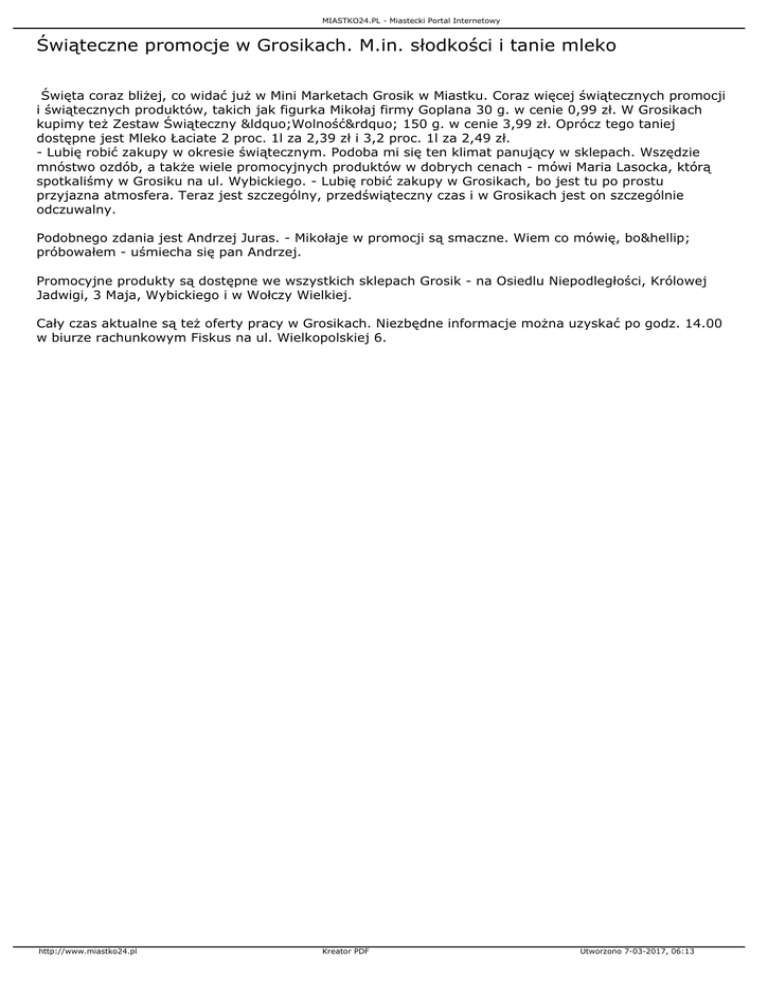 MIASTKO24.PL - Miastecki Portal Internetowy Świąteczne promocje w Grosikach. M.in. słodkości i tanie mleko Święta coraz bliżej, co widać już w Mini Marketach Grosik w Miastku. Coraz więcej świątecznych promocji i świątecznych produktów, takich jak figurka Mikołaj firmy Goplana 30 g. w cenie 0,99 zł. W Grosikach kupimy też Zestaw Świąteczny “Wolność” 150 g. w cenie 3,99 zł. Oprócz tego taniej dostępne jest Mleko Łaciate 2 proc. 1l za 2,39 zł i 3,2 proc. 1l za 2,49 zł. - Lubię robić zakupy w okresie świątecznym. Podoba mi się ten klimat panujący w sklepach. Wszędzie mnóstwo ozdób, a także wiele promocyjnych produktów w dobrych cenach - mówi Maria Lasocka, którą spotkaliśmy w Grosiku na ul. Wybickiego. - Lubię robić zakupy w Grosikach, bo jest tu po prostu przyjazna atmosfera. Teraz jest szczególny, przedświąteczny czas i w Grosikach jest on szczególnie odczuwalny. Podobnego zdania jest Andrzej Juras. - Mikołaje w promocji są smaczne. Wiem co mówię, bo… próbowałem - uśmiecha się pan Andrzej. Promocyjne produkty są dostępne we wszystkich sklepach Grosik - na Osiedlu Niepodległości, Królowej Jadwigi, 3 Maja, Wybickiego i w Wołczy Wielkiej. Cały czas aktualne są też oferty pracy w Grosikach. Niezbędne informacje można uzyskać po godz. 14.00 w biurze rachunkowym Fiskus na ul. Wielkopolskiej 6. http://www.miastko24.pl Kreator PDF Utworzono 7-03-2017, 06:13