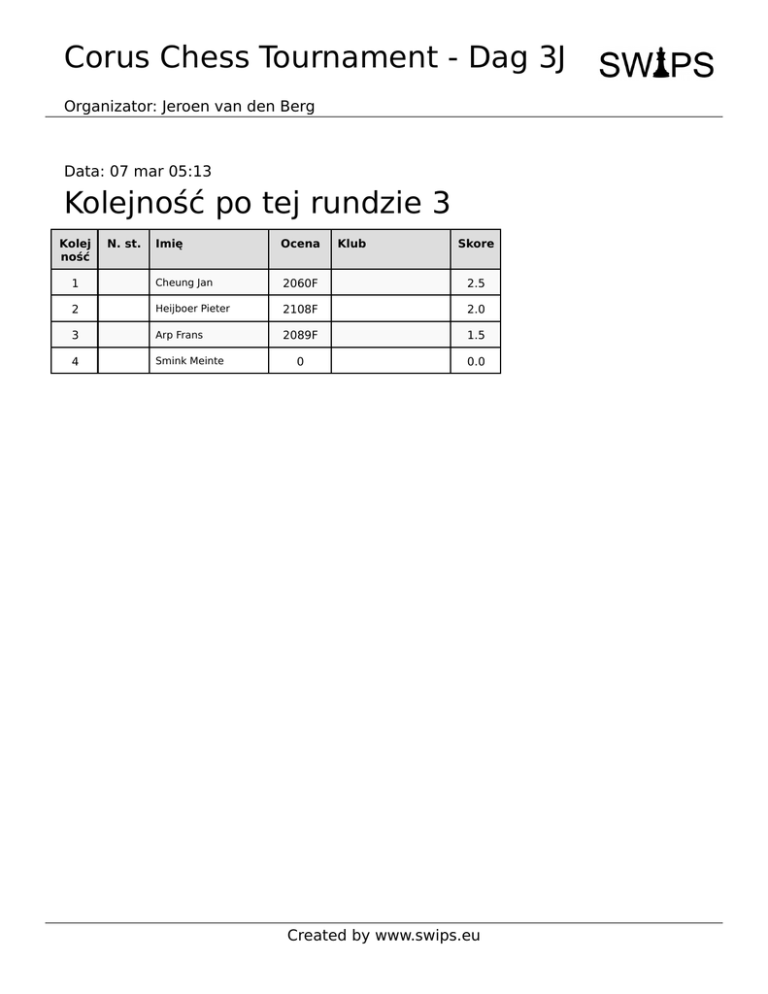Corus Chess Tournament - Dag 3J Organizator: Jeroen van den Berg Data: 07 mar 05:13 Kolejność po tej rundzie 3 Kolej ność N. st. Imię Ocena Klub Skore 1 Cheung Jan 2060F 2.5 2 Heijboer Pieter 2108F 2.0 3 Arp Frans 2089F 1.5 4 Smink Meinte 0 0.0 Created by www.swips.eu
