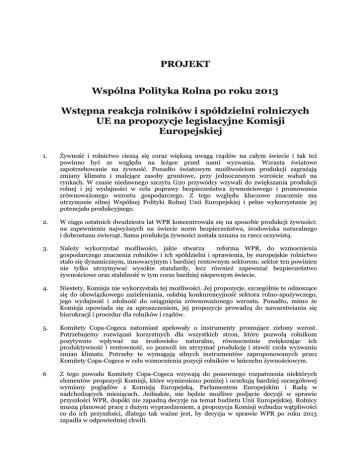 PROJEKT Wspólna Polityka Rolna po roku 2013 Wstępna reakcja rolników i spółdzielni rolniczych UE na propozycje legislacyjne Komisji Europejskiej 1. Żywność i rolnictwo cieszą się coraz większą uwagą rządów na całym świecie i tak też powinno być ze względu na leżące przed nami wyzwania. Wzrasta światowe zapotrzebowanie na żywność. Ponadto światowym możliwościom produkcji zagrażają zmiany klimatu i malejące zasoby gruntowe, przy jednoczesnym wzroście wahań na rynkach. W czasie niedawnego szczytu G20 przywódcy wzywali do zwiększania produkcji rolnej i jej wydajności w celu poprawy bezpieczeństwa żywnościowego i promowania zrównoważonego wzrostu gospodarczego. Z tego względu kluczowe znaczenie ma utrzymanie silnej Wspólnej Polityki Rolnej Unii Europejskiej i pełne wykorzystanie jej potencjału produkcyjnego. 2. W ciągu ostatnich dwudziestu lat WPR koncentrowała się na sposobie produkcji żywności: na zapewnieniu najwyższych na świecie norm bezpieczeństwa, środowiska naturalnego i dobrostanu zwierząt. Sama produkcja żywności została uznana za rzecz oczywistą. 3. Należy wykorzystać możliwości, jakie stwarza reforma WPR, do wzmocnienia gospodarczego znaczenia rolników i ich spółdzielni i sprawienia, by europejskie rolnictwo stało się dynamicznym, innowacyjnym i bardziej rentownym sektorem: sektor ten powinien nie tylko utrzymywać wysokie standardy, lecz również zapewniać bezpieczeństwo żywnościowe oraz stabilność w tym coraz bardziej niepewnym świecie. 4. Niestety, Komisja nie wykorzystała tej możliwości. Jej propozycje, szczególnie te odnoszące się do obowiązkowego zazieleniania, osłabią konkurencyjność sektora rolno-spożywczego, jego wydajność i zdolność do osiągnięcia zrównoważonego wzrostu. Ponadto, mimo że Komisja opowiada się za uproszczeniem, jej propozycje prowadzą do nawarstwiania się biurokracji i procedur dla rolników i rządów. 5. Komitety Copa-Cogeca natomiast apelowały o instrumenty promujące zielony wzrost. Potrzebujemy rozwiązań korzystnych dla wszystkich stron, które pozwolą rolnikom pozytywnie wpływać na środowisko naturalne, równocześnie zwiększając ich produktywność i rentowność, co pozwoli im utrzymać produkcję i stawić czoła wyzwaniu zmian klimatu. Potrzeby te wymagają silnych instrumentów zaproponowanych przez Komitety Copa-Cogeca w celu wzmocnienia pozycji rolników w łańcuchu żywnościowym. 6 Z tego powodu Komitety Copa-Cogeca wzywają do ponownego rozpatrzenia niektórych elementów propozycji Komisji, które wymieniono poniżej i oczekują bardziej szczegółowej wymiany poglądów z Komisją Europejską, Parlamentem Europejskim i Radą w nadchodzących miesiącach. Jednakże, nie będzie możliwe podjęcie decyzji w sprawie przyszłości WPR, dopóki nie zapadną decyzje na temat budżetu Unii Europejskiej. Rolnicy muszą planować pracę z dużym wyprzedzeniem, a propozycja Komisji wzbudza wątpliwości co do ich przyszłości, dlatego tak ważne jest, by decyzja w sprawie WPR po roku 2013 zapadła w odpowiedniej chwili. 7. WPR jest jedyną prawdziwie wspólną polityką i wniosła ważny i cenny wkład do konstrukcji europejskiej. Komitety Copa-Cogeca potwierdzają wsparcie dla integracji europejskiej i wzywają głowy państw i rządów, Parlament Europejski oraz Komisję Europejską, aby zapewnili utrzymanie silnej Wspólnej Polityki Rolnej i silnego jednolitego rynku popartego silnym budżetem UE. Reakcja Komitetów Copa-Cogeca na główne elementy propozycji Komisji Uproszczenie 8. Myślą przewodnią obecnej reformy WPR powinno być uproszczenie. Niestety, mimo iż Komisja uznaje pilną potrzebę uproszczenia WPR, każda kolejna reforma prowadzi do dalszego komplikowania i mnożenia biurokracji. Nie inaczej jest obecnie. Propozycje Komisji dotyczące zasady wzajemnej zgodności, zazieleniania, pułapów ograniczających płatności oraz definicji aktywnego rolnika sprawią, że system będzie mniej przejrzysty dla społeczeństwa i będzie nakładał większe obciążenia na rolników i rządy. Jeżeli propozycja nie prowadzi do uproszczenia, musi zostać zmieniona. Zasada wzajemnej zgodności 18. Z zadowoleniem przyjmujemy fakt, iż Komisja pozytywnie zareagowała na prośbę Komitetów Copa-Cogeca, aby przekształcić zasadę wzajemnej zgodności w jedną grupę wymogów i standardów oraz wyeliminować dobrowolne zasady dobrej kultury rolnej zgodnej z ochroną środowiska (GAEC). Jednakże, zamiast uprościć zasadę wzajemnej zgodności, Komisja proponuje jej znaczące wzmocnienie. Ponadto, mimo iż cały czas Komisja podkreśla potrzebę uzasadnienia płatności bezpośrednich, nie wykorzystała tej możliwości, aby lepiej poinformować społeczeństwo o licznych zobowiązaniach rolników, które muszą oni realizować w ramach zasady wzajemnej zgodności, i które gwarantują że normy produkcji europejskiej są zdecydowanie wyższe niż normy stosowane przez większość konkurentów na świecie, w tym producentów towarów importowanych do UE. 19. Komitety Copa-Cogeca ponownie nawołują do zmiany nazwy ogółu obowiązkowych standardów i wymogów w ramach zasady wzajemnej zgodności na „Normy europejskiej produkcji rolnej” i rozpowszechnienie wiedzy o tych normach. Poza tym zachodzi potrzeba usprawnienia i lepszej harmonizacji obowiązkowych zasad w całej Unii Europejskiej1. Ponadto, rolnicy w państwach członkowskich, które wdrożyły legislację krajową wykraczającą poza normy UE, powinni mieć możliwość otrzymania wyrównania w II filarze za poniesione dodatkowe koszty, w porównaniu do konkurentów na jednolitym rynku. Badania, innowacje, szkolenia i usługi doradcze 42. Komitety Copa-Cogeca z zadowoleniem przyjmują propozycję, aby wzmocnić innowacje, szkolenia i usługi doradcze. Założenie Europejskiego Partnerstwa na rzecz Innowacji mającego na celu wypracowanie wspólnego podejścia do badań, inn