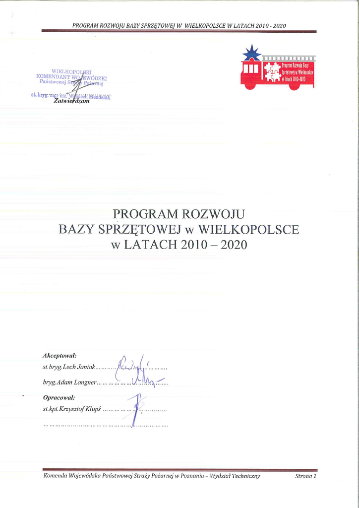 PROGRAM ROZWOJU BAZY SPRZĘTOWEJ W WIELKOPOLSCE W LATACH 2010 - 2020 Spis treści 1. Wstęp 2. Cele strategiczne Programu 3. Mierniki oceny wdroŜenia Programu 4. Podstawa prawna / dokumenty odniesienia 5. Definicje i pojęcia przywołane w opracowaniu 6. Etapy wdroŜenia zadań programu 7. Uzgodnienia i zatwierdzenie przyjętych rozwiązań 8. Modyfikacje programu w trakcie realizacji 9. Wykaz załączników Komenda Wojewódzka Państwowej Straży Pożarnej w Poznaniu – Wydział Techniczny Strona 2 PROGRAM ROZWOJU BAZY SPRZĘTOWEJ W WIELKOPOLSCE W LATACH 2010 - 2020 1.Wstęp: Obecnie operacyjne zabezpieczenie województwa wielkopolskiego to 42 jednostki ratowniczo-gaśnicze PSP w ramach, których funkcjonuje 14 specjalistycznych grup ratowniczych. Jednostki te eksploatują 393 pojazdy o średnim wieku pojazdów ponad 9 lat. W ramach KSRG na terenie województwa funkcjonuje takŜe 315 jednostek OSP w KSRG dysponujące 713 pojazdami o średnim wieku ponad 15 lat. Dodatkowym wsparciem w realizacji zadań ochrony przeciwpoŜarowej w województwie jest 1542 jednostek OSP. Tak duŜa baza sprzętowa wymaga ciągłego monitorowania i planowego rozwoju. Celem opracowania Programu rozwoju bazy sprzętowej w Wielkopolsce na lata 2010-2020 jest optymalizacja zaplecza sprzętowego jednostek straŜy poŜarnych, adekwatnego do zagroŜeń towarzyszących rozwojowi regionu w obszarze infrastruktury, gospodarczym i społecznym a takŜe przygotowanie do działań w stanach zagroŜeń nadzwyczajnych, w tym awarii przemysłowych występujących na terenie województwa oraz przygotowanie jednostek do działań w ramach COO i WBO. Realizacja programu ma takŜe na celu zapewnienie prawidłowego stanu technicznego pojazdów i sprzętu. Niniejsze opracowanie winno być poprzedzone szczegółową analiza operacyjnego zabezpieczenia obszaru chronionego uwzględniającą takŜe planowany rozwój gospodarczy do roku 2020. Analiza taka winna zostać wykonana dla kaŜdego powiatu i województwa. Nadto, bazą wyjściową opracowania i realizacji Programu stanowić musi aktualizowany cyklicznie Plan ratowniczy obszaru chronionego na poziomie powiatowym i wojewódzkim. Określając asortyment i ilość sprzętu naleŜy w pierwszej kolejności kierować się standardami określonymi rozporządzeniem w sprawie szczegółowych zasad wyposaŜenia jednostek organizacyjnych PSP i wytycznymi organizacji ratownictwa specjalistycznego oraz dokumentami odniesienia i podstawami prawnymi wskazanymi w punkcie 4 opracowania. Wypracowane rozwiązania ujęte w Programie winny być szeroko konsultowane i mieć podbudowę w realiach ekonomicznych jednostek je tworzących. Systematyka opracowania Programu jest określona celami Strategii i przypisanymi im wskaźnikami produktu, stanowiącymi miernik efektywności podejmowanych działań. Zaproponowany algorytm postępowania stanowi bazę wyjściową realizacji zadań i moŜe podlegać ewaluacji w trakcie wdroŜenia w celu uwzględnienia zmian w otoczeniu dla którego Komenda Wojewódzka Państwowej Straży Pożarnej w Poznaniu – Wydział Techniczny Strona 3 PROGRAM ROZWOJU BAZY SPRZĘTOWEJ W WIELKOPOLSCE W LATACH 2010 - 2020 jest tworzony. WaŜne dla spójności opracowania jest odpowiednie dokumentowanie i uzasadnienie wprowadzonych zmian. Szczegółowy terminarz realizacji poszczególnych celów strategicznych i etapów wdroŜenia zostanie określony przez Zespół do spraw wdroŜenia Programu, powołany przez Wielkopolskiego Komendanta Wojewódzkiego. Komenda Wojewódzka Państwowej Straży Pożarnej w Poznaniu – Wydział Techniczny Strona 4 PROGRAM ROZWOJU BAZY SPRZĘTOWEJ W WIELKOPOLSCE W LATACH 2010 - 2020 2. Cele strategiczne Programu Zgodnie z systematyką Strategii w ramach Programu rozwoju bazy sprzętowej w województwie określono następujące cele strategiczne: III.2.1. – Zapewnienie optymalnych zasobów ratowniczych i technicznych na potrzeby systemu ratowniczego – Standaryzacja i ekonomizacja zasobów sprzętowych oraz monitorowanie efektywności w wypełnianiu zadań zabezpieczenia logistycznego PSP – Opracowanie i wdroŜenie standardu sprzętowego a takŜe zabezpieczenia logistycznego do realizowania specjalistycznych działań ratowniczych. III.2.2. – Zapewnienie optymalnych zasobów ratowniczych, technicznych i infrastrukturalnych na potrzeby systemu ratowniczego – Standaryzacja i ekonomizacja zasobów sprzętowych oraz monitorowanie efektywności w wypełnianiu zadań zabezpieczenia logistycznego PSP – Analizowanie istniejącego stanu wyposaŜenia OSP oraz pozostałych podmiotów włączonych do KSRG oraz wypracowanie normatywu i standardów sprzętowych dla poszczególnych jednostek z uwzględnieniem charakterystyki zagroŜeń obszarów chronionych. III.2.3. – Zapewnienie optymalnych zasobów ratowniczych, technicznych i infrastrukturalnych na potrzeby systemu ratowniczego – Standaryzacja i ekonomizacja zasobów sprzętowych oraz monitorowanie efektywności w wypełnianiu zadań zabezpieczenia logistycznego PSP – Opracowanie i wdroŜenie normatywu dla SiS zaplanowanych do działań ponadpowiatowych (odwód operacyjny) w tym rozbudowy baz kontenerowych. III.2.4. – Zapewnienie optymalnych zasobów ratowniczych, technicznych i infrastrukturalnych na potrzeby systemu ratowniczego – Standaryzacja i ekonomizacja zasobów sprzętowych oraz monitorowanie efektywności w wypełnianiu zadań zabezpieczenia logistycznego PSP – DoposaŜenie jednostek organizacyjnych w pojazdy i specjalistyczny sprzęt. Komenda Wojewódzka Państwowej Straży Pożarnej w Poznaniu – Wydział Techniczny Strona 5 PROGRAM ROZWOJU BAZY SPRZĘTOWEJ W WIELKOPOLSCE W LATACH 2010 - 2020 3. Mierniki oceny wdroŜenia Programu Wskazane powyŜej cele będą podlegać ocenie okresowej poprzez Wskaźniki produktu: 3.1. % podmiotów PSP spełniających normatyw w zakresie ratownictwa podstawowego (w stosunku do ilości jednostek realizujących ten standard) jednostki _ spe ln iajac