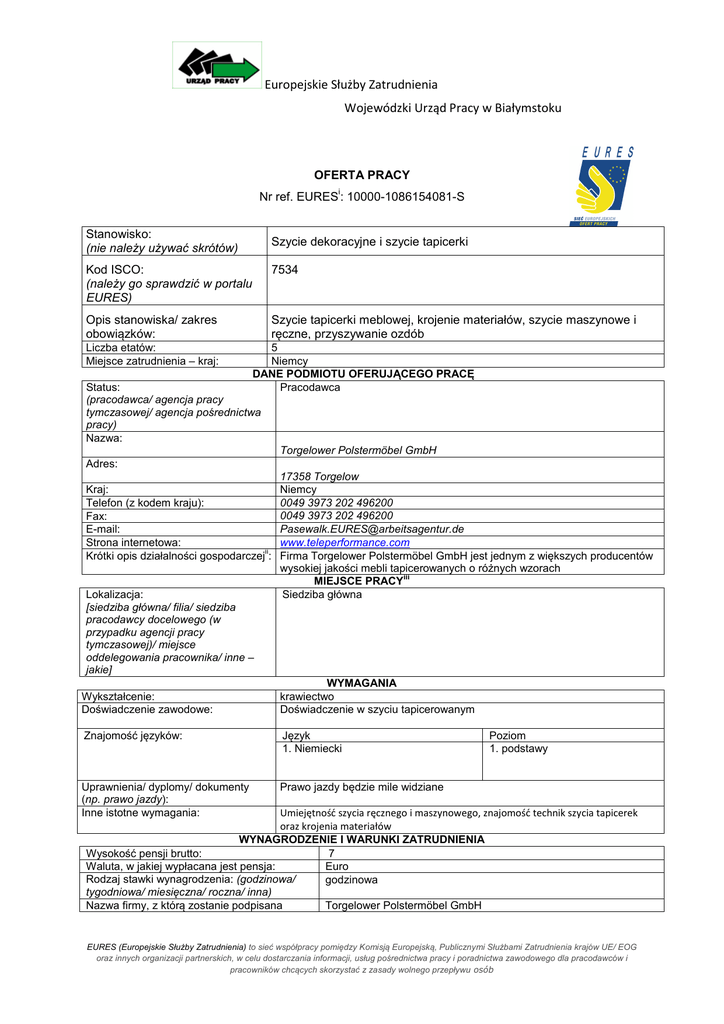 Europejskie Służby Zatrudnienia Wojewódzki Urząd Pracy w Białymstoku OFERTA PRACY i Nr ref. EURES : 10000-1086154081-S Stanowisko: (nie należy używać skrótów) Szycie dekoracyjne i szycie tapicerki Kod ISCO: (należy go sprawdzić w portalu EURES) 7534 Opis stanowiska/ zakres obowiązków: Szycie tapicerki meblowej, krojenie materiałów, szycie maszynowe i ręczne, przyszywanie ozdób Liczba etatów: Miejsce zatrudnienia – kraj: 5 Niemcy DANE PODMIOTU OFERUJĄCEGO PRACĘ Pracodawca Status: (pracodawca/ agencja pracy tymczasowej/ agencja pośrednictwa pracy) Nazwa: Torgelower Polstermöbel GmbH Adres: Kraj: Telefon (z kodem kraju): Fax: E-mail: Strona internetowa: ii Krótki opis działalności gospodarczej : Lokalizacja: [siedziba główna/ filia/ siedziba pracodawcy docelowego (w przypadku agencji pracy tymczasowej)/ miejsce oddelegowania pracownika/ inne – jakie] Wykształcenie: Doświadczenie zawodowe: 17358 Torgelow Niemcy 0049 3973 202 496200 0049 3973 202 496200 [email protected] www.teleperformance.com Firma Torgelower Polstermöbel GmbH jest jednym z większych producentów wysokiej jakości mebli tapicerowanych o różnych wzorach iii MIEJSCE PRACY Siedziba główna WYMAGANIA krawiectwo Doświadczenie w szyciu tapicerowanym Znajomość języków: Język 1. Niemiecki Uprawnienia/ dyplomy/ dokumenty (np. prawo jazdy): Inne istotne wymagania: Prawo jazdy będzie mile widziane Poziom 1. podstawy Umiejętność szycia ręcznego i maszynowego, znajomość technik szycia tapicerek oraz krojenia materiałów WYNAGRODZENIE I WARUNKI ZATRUDNIENIA Wysokość pensji brutto: 7 Waluta, w jakiej wypłacana jest pensja: Euro Rodzaj stawki wynagrodzenia: (godzinowa/ godzinowa tygodniowa/ miesięczna/ roczna/ inna) Nazwa firmy, z którą zostanie podpisana Torgelower Polstermöbel GmbH EURES (Europejskie Służby Zatrudnienia) to sieć współpracy pomiędzy Komisją Europejską, Publicznymi Służbami Zatrudnienia krajów UE/ EOG oraz innych organizacji partnerskich, w celu dostarczania informacji, usług pośrednictwa pracy i poradnictwa zawodowego dla pracodawców i pracowników chcących skorzystać z zasady wolnego przepływu osób umowa: Rodzaj umowy: (umowa o pracę, umowa zlecenia, wolontariat, praktyka zawodowa/ staż, praca zdalna, agencja pracy tymczasowej, inne): Wymiar czasu pracy (praca na pełen etat/ część etatu): Czas trwania umowy: (nieokreślony/ określony) Umowa o pracę z ubezpieczeniem Pełny etat nieokreślony Data wygaśnięcia umowy (w przypadku umowy na czas określony): Liczba godzin tygodniowo: 40 Zmiany i praca w dni wolne: Dwie zmiany : 6.00 – 14.00 oraz 14.00 – 22.00 Data rozpoczęcia: Od września 2012 Wymagane dokumenty (list motywacyjny, CV itp.): SPOSÓB SKŁADANIA WNIOSKU List motywacyjny, CV. świadectwo ukończenia szkoły z tytułem Język, w którym muszą być sporządzone przedkładane dokumenty: Do kogo należy wysłać dokumenty: (do pracodawcy/ doradcy EURES) niemiecki Gdzie należy wysłać dokumenty: (adres, adres e-mail, nr faksu z kodem kraju itp.) Agentur für Arbeit Pasewalk Löcknitzer Str. 10 17309 Pasewalk Dane teleadresowe doradcy EURES lub przedstawiciela pracodawcy: (nazwisko, adres, telefon, fax, e-mail itp.) [email protected] Data publikacji: Djane Jennricke doradca Eures WAŻNOŚĆ 24.07.2012 Termin przedkładania podań o pracę / Do odwołania zakończenia ważności oferty: Uprzejmie informujemy, że skontaktujemy się wyłącznie z wybranymi kandydatami. UWAGA: 1. Umowa z zagranicznym pracodawcą zostanie zawarta zgodnie z prawem kraju zatrudnienia. Oznacza to, że wszystkie roszczenia odnośnie do warunków, które obejmuje umowa, można kierować wyłącznie do odpowiedniego sądu w kraju zatrudnienia. Publiczne służby zatrudnienia (EURES) nie mogą pośredniczyć ani reprezentować pracownika w sądzie kraju zatrudnienia w przypadku sporu z pracodawcą. 2. Publiczne służby zatrudnienia (EURES) dokładają wszelkich starań, aby zapewnić rzetelność i wiarygodność ofert pracy zgłoszonych w lokalnym urzędzie pracy. Należy wyjaśnić, że oferta pracy została zgłoszona przez stronę trzecią i EURES nie odpowiada za ewentualne rozbieżności między warunkami pracy określonymi w ofercie pracy i warunkami oferowanymi przez potencjalnego pracodawcę. 3. Publiczne służby zatrudnienia (EURES) informują, że będą zbierać, przetwarzać i przekazywać potencjalnym pracodawcom zgodnie z przepisami dotyczącymi ochrony danych osobowych wszystkie dane osobowe dostarczone przez osoby poszukujące pracy. i Nr ref. na portalu EURES www.eures.europa.eu . Dotyczy ofert pracy publicznych służb zatrudnienia, których bazy danych ofert pracy nie są połączone z portalem EURES. ii Informacje o firmie, takie jak: status prawny, sektor, typ działalności, rodzaj produktów lub świadczonych usług, data rozpoczęcia działalności gospodarczej, liczba pracowników itp. iii Miejsce, w którym będzie wykonywana praca. Należy wypełnić w przypadku gdy: 1) miejsce wykonywania pracy jest inne niż siedziba podmiotu oferującego pracę, 2) pracę oferuje agencja pośrednictwa pracy/ agencja pracy tymczasowej. EURES (Europejskie Służby Zatrudnienia) to sieć współpracy pomiędzy Komisją Europejską, Publicznymi Służbami Zatrudnienia krajów UE/ EOG oraz innych organizacji partnerskich, w celu dostarczania informacji, usług pośrednictwa pracy i poradnictwa zawodowego dla pracodawców i pracowników chcących skorzystać z zasady wolnego przepływu osób
