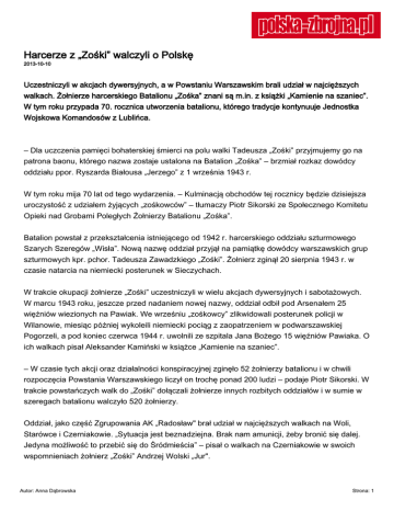 Harcerze z „Zośki” walczyli o Polskę 2013-10-10 Uczestniczyli w akcjach dywersyjnych, a w Powstaniu Warszawskim brali udział w najcięższych walkach. Żołnierze harcerskiego Batalionu „Zośka” znani są m.in. z książki „Kamienie na szaniec”. W tym roku przypada 70. rocznica utworzenia batalionu, którego tradycje kontynuuje Jednostka Wojskowa Komandosów z Lublińca. – Dla uczczenia pamięci bohaterskiej śmierci na polu walki Tadeusza „Zośki” przyjmujemy go na patrona baonu, którego nazwa zostaje ustalona na Batalion „Zośka” – brzmiał rozkaz dowódcy oddziału ppor. Ryszarda Białousa „Jerzego” z 1 września 1943 r. W tym roku mija 70 lat od tego wydarzenia. – Kulminacją obchodów tej rocznicy będzie dzisiejsza uroczystość z udziałem żyjących „zośkowców” – tłumaczy Piotr Sikorski ze Społecznego Komitetu Opieki nad Grobami Poległych Żołnierzy Batalionu „Zośka”. Batalion powstał z przekształcenia istniejącego od 1942 r. harcerskiego oddziału szturmowego Szarych Szeregów „Wisła”. Nową nazwę oddział przyjął na pamiątkę dowódcy warszawskich grup szturmowych kpr. pchor. Tadeusza Zawadzkiego „Zośki”. Żołnierz zginął 20 sierpnia 1943 r. w czasie natarcia na niemiecki posterunek w Sieczychach. W trakcie okupacji żołnierze „Zośki” uczestniczyli w wielu akcjach dywersyjnych i sabotażowych. W marcu 1943 roku, jeszcze przed nadaniem nowej nazwy, oddział odbił pod Arsenałem 25 więźniów wiezionych na Pawiak. We wrześniu „zośkowcy” zlikwidowali posterunek policji w Wilanowie, miesiąc później wykoleili niemiecki pociąg z zaopatrzeniem w podwarszawskiej Pogorzeli, a pod koniec czerwca 1944 r. uwolnili ze szpitala Jana Bożego 15 więźniów Pawiaka. O ich walkach pisał Aleksander Kamiński w książce „Kamienie na szaniec”. – W czasie tych akcji oraz działalności konspiracyjnej zginęło 52 żołnierzy batalionu i w chwili rozpoczęcia Powstania Warszawskiego liczył on trochę ponad 200 ludzi – podaje Piotr Sikorski. W trakcie powstańczych walk do „Zośki” dołączali żołnierze innych rozbitych oddziałów i w sumie w szeregach batalionu walczyło 520 żołnierzy. Oddział, jako część Zgrupowania AK „Radosław" brał udział w najcięższych walkach na Woli, Starówce i Czerniakowie. „Sytuacja jest beznadziejna. Brak nam amunicji, żeby bronić się dalej. Jedyna możliwość to przebić się do Śródmieścia” – pisał o walkach na Czerniakowie w swoich wspomnieniach żołnierz „Zośki” Andrzej Wolski „Jur". Autor: Anna Dąbrowska Strona: 1 Kwatera Batalionu Zośka na warszawskich Powązkach. Batalion wsławił się zdobyciem warszawskiego obozu na Woli tzw. „Gęsiówki”, z którego uwolniono blisko 350 Żydów. Był też jedynym oddziałem, który pod koniec sierpnia 1944 r. przebił się ze Starego Miasta przez zajęty przez Niemców Ogród Saski do Śródmieścia. W powstańczych walkach batalion został jednak zdziesiątkowany. Poległo 360 jego żołnierzy, czyli 70 procent oddziału. Dziś żyje kilkunastu byłych „zośkowców”. Tradycje batalionu kontynuuje Jednostka Wojskowa Komandosów z Lublińca. Jej żołnierze na mundurach noszą naszywki z symbolami „Zośki". W 2000 r. jednostce, która nazywała się wtedy 1 Pułkiem Specjalnym Komandosów, tradycje powstańczego batalionu nadał ówczesny minister obrony Bronisław Komorowski. – Jesteśmy przywiązanie do tych samych wartości, które towarzyszyły powstańcom. Oni walczyli o wolność podczas wojny, my stawiamy czoła współczesnym zagrożeniom na świecie – podkreślają komandosi z Lublińca. Autor: Anna Dąbrowska Strona: 2