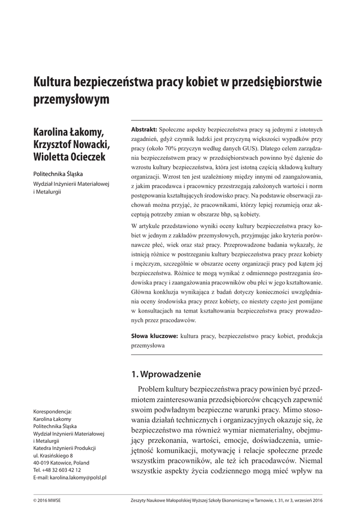 Kultura bezpieczeństwa pracy kobiet w przedsiębiorstwie przemysłowym Karolina Łakomy, Krzysztof Nowacki, Wioletta Ocieczek Politechnika Śląska Wydział Inżynierii Materiałowej i Metalurgii Abstrakt: Społeczne aspekty bezpieczeństwa pracy są jednymi z istotnych zagadnień, gdyż czynnik ludzki jest przyczyną większości wypadków przy pracy (około 70% przyczyn według danych GUS). Dlatego celem zarządzania bezpieczeństwem pracy w przedsiębiorstwach powinno być dążenie do wzrostu kultury bezpieczeństwa, która jest istotną częścią składową kultury organizacji. Wzrost ten jest uzależniony między innymi od zaangażowania, z jakim pracodawca i pracownicy przestrzegają założonych wartości i norm postępowania kształtujących środowisko pracy. Na podstawie obserwacji zachowań można przyjąć, że pracownikami, którzy lepiej rozumieją oraz akceptują potrzeby zmian w obszarze bhp, są kobiety. W artykule przedstawiono wyniki oceny kultury bezpieczeństwa pracy kobiet w jednym z zakładów przemysłowych, przyjmując jako kryteria porównawcze płeć, wiek oraz staż pracy. Przeprowadzone badania wykazały, że istnieją różnice w postrzeganiu kultury bezpieczeństwa pracy przez kobiety i mężczyzn, szczególnie w obszarze oceny organizacji pracy pod kątem jej bezpieczeństwa. Różnice te mogą wynikać z odmiennego postrzegania środowiska pracy i zaangażowania pracowników obu płci w jego kształtowanie. Główna konkluzja wynikająca z badań dotyczy konieczności uwzględniania oceny środowiska pracy przez kobiety, co niestety często jest pomijane w konsultacjach na temat kształtowania bezpieczeństwa pracy prowadzonych przez pracodawców. Słowa kluczowe: kultura pracy, bezpieczeństwo pracy kobiet, produkcja przemysłowa 1. Wprowadzenie Korespondencja: Karolina Łakomy Politechnika Śląska Wydział Inżynierii Materiałowej i Metalurgii Katedra Inżynierii Produkcji ul. Krasińskiego 8 40-019 Katowice, Poland Tel. +48 32 603 42 12 E-mail: [email protected] © 2016 MWSE Problem kultury bezpieczeństwa pracy powinien być przedmiotem zainteresowania przedsiębiorców chcących zapewnić swoim podwładnym bezpieczne warunki pracy. Mimo stosowania działań technicznych i organizacyjnych okazuje się, że bezpieczeństwo ma również wymiar niematerialny, obejmujący przekonania, wartości, emocje, doświadczenia, umiejętność komunikacji, motywację i relacje społeczne przede wszystkim pracowników, ale też ich pracodawców. Niemal wszystkie aspekty życia codziennego mogą mieć wpływ na Zeszyty Naukowe Małopolskiej Wyższej Szkoły Ekonomicznej w Tarnowie, t. 31, nr 3, wrzesień 2016 132 Karolina Łakomy, Krzysztof Nowacki, Wioletta Ocieczek jakość pracy, efektywność, a w konsekwencji na zdrowie i życie zatrudnionych. Dlatego tak ważne jest, aby pracownicy przestrzegali procedur pracy, uczestniczyli w szkoleniach podnoszących kwalifikacje, w tym szkoleniach bhp, dostrzegali zagrożenia występujące na ich stanowiskach pracy, a także byli świadomi skutków, jakie niosą ze sobą czynniki niebezpieczne. Te aspekty uwzględnia kultura bezpieczeństwa, budowana w przedsiębiorstwach przez lata działalności. Kultura bezpieczeństwa ma bardzo wiele mierników, a jednym z nich może być ocena obszarów, których dotyczy. Celem artykułu jest przedstawienie wyników badań dotyczących oceny kultury bezpieczeństwa pracy kobiet w przedsiębiorstwie przemysłowym oraz omówienie ich w aspekcie przyjętych kryteriów porównawczych, takich jak płeć, wiek oraz staż pracy. Celem analizy jest również doskonalenie kultury bezpieczeństwa pracy w badanym przedsiębiorstwie, a co za tym idzie – doskonalenie kapitału ludzkiego. 2. Kultura bezpieczeństwa pracy Pojęcie kultury bezpieczeństwa pracy jest rozwijane od czasów awarii w elektrowni atomowej w Czarnobylu. Od tego momentu zaczęto badać kulturę bezpieczeństwa, początkowo definiowaną jako rezultat indywidualnych i grupowych wartości, postaw, postrzegania, kompetencji, wzorców zachowań oraz stylu i jakości zarządzania bezpieczeństwem w organizacji (Nowacki, Lis, 2016). Podstawą budowania kultury jest zaufanie do skuteczności działań profilaktycznych. Nadrzędną wartością kultury bezpieczeństwa pracy powinno być uwrażliwienie na zagadnienia życia i bezpieczeństwa ludzi. Kulturę bezpieczeństwa i higieny pracy należy postrzegać jako zbiór psychologicznych, społecznych i organizacyjnych czynników uruchamiających lub podtrzymujących działania chroniące życie i zdrowie zarówno w pracy, jak i w czynnościach pozazawodowych. Człowiek powinien wdrażać probezpieczne zachowania na gruncie zawodowym i prywatnym (Studenski, 2000). Kultura bezpieczeństwa pracy ma również swoje odzwierciedlenie w przepisach prawnych. Coraz częściej dyrektywy europejskie oraz normy prowadzą do zminimalizowania ryzyka wynikającego z postępu technologicznego i społecznego (Lis, 2013). Kultura bezpieczeństwa organizacji jest indywidualna dla każdego z przedsiębiorstw i zależy od możliwości podejmowania decyzji, kształtowania postaw i zachowań, osiągnieć technicznych i organizacyjnych, które prowadzą do całkowicie bezpiecznych warunków pracy. Przedsiębiorstwa, którym udało się zbudować wysoką kulturę, charakteryzują się tym, że bezpieczeństwo pracy jest w nich podstawową wartością, a zaangażowanie pracodawcy i pracowników stanowi priorytet. Pracownicy cechują się poczuciem odpowiedzialności za sprawy przedsiębiorstwa i bezpieczeństwa, komunikują się bez barier, a specyfika szkoleń jest dostosowana do umiejętności i potrzeb kadry pracowniczej (Żurakowski, 2015). Kultura bezpieczeństwa w przedsiębiorstwie może być kształtowana przez wiele czynników, między innymi przez otoczenie zewnętrzne, typ organizacji, stosowane technologie, strukturę firmy oraz cechy pracowników (Obolewicz, 2014). Najważniejszym elementem w k