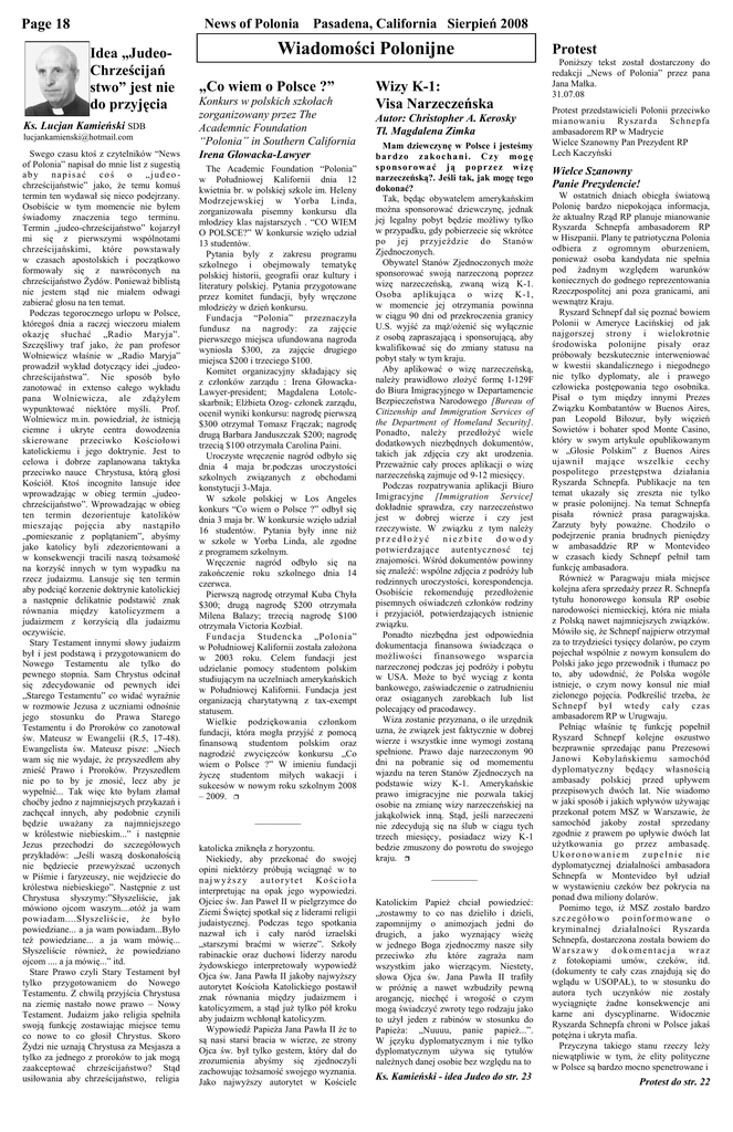 Page 18 News of Polonia Pasadena, California Sierpień 2008 Idea „JudeoChrześcijań stwo” jest nie do przyjęcia Ks. Lucjan Kamieński SDB [email protected] Swego czasu ktoś z czytelników “News of Polonia” napisał do mnie list z sugestią aby napisać coś o „judeo chrześcijaństwie” jako, że temu komuś termin ten wydawał się nieco podejrzany. Osobiście w tym momencie nie byłem świadomy znaczenia tego terminu. Termin „judeo-chrześcijaństwo” kojarzył mi się z pierwszymi wspólnotami chrześcijańskimi, które powstawały w czasach apostolskich i początkowo formowały się z nawróconych na chrześcijaństwo Żydów. Ponieważ biblistą nie jestem stąd nie miałem odwagi zabierać głosu na ten temat. Podczas tegorocznego urlopu w Polsce, któregoś dnia a raczej wieczoru miałem okazję słuchać „Radio Maryja”. Szczęśliwy traf jako, że pan profesor Wołniewicz właśnie w „Radio Maryja” prowadził wykład dotyczący idei „judeochrześcijaństwa”. Nie sposób było zanotować in extenso całego wykładu pana Wolniewicza, ale zdążyłem wypunktować niektóre myśli. Prof. Wolniewicz m.in. powiedział, że istnieją ciemne i ukryte centra dowodzenia skierowane przeciwko Kościołowi katolickiemu i jego doktrynie. Jest to celowa i dobrze zaplanowana taktyka przeciwko nauce Chrystusa, którą głosi Kościół. Ktoś incognito lansuje idee wprowadzając w obieg termin „judeochrześcijaństwo”. Wprowadzając w obieg ten termin dezorientuje katolików mieszając pojęcia aby nastąpiło „pomieszanie z poplątaniem”, abyśmy jako katolicy byli zdezorientowani a w konsekwencji tracili naszą tożsamość na korzyść innych w tym wypadku na rzecz judaizmu. Lansuje się ten termin aby podciąć korzenie doktrynie katolickiej a następnie delikatnie podstawić znak równania między katolicyzmem a judaizmem z korzyścią dla judaizmu oczywiście. Stary Testament innymi słowy judaizm był i jest podstawą i przygotowaniem do Nowego Testamentu ale tylko do pewnego stopnia. Sam Chrystus odcinał się zdecydowanie od pewnych idei „Starego Testamentu” co widać wyraźnie w rozmowie Jezusa z uczniami odnośnie jego stosunku do Prawa Starego Testamentu i do Proroków co zanotował św. Mateusz w Ewangelii (R.5, 17-48). Ewangelista św. Mateusz pisze: „Niech wam się nie wydaje, że przyszedłem aby znieść Prawo i Proroków. Przyszedłem nie po to by je znosić, lecz aby je wypełnić... Tak więc kto byłam złamał choćby jedno z najmniejszych przykazań i zachęcał innych, aby podobnie czynili będzie uważany za najmniejszego w królestwie niebieskim...” i następnie Jezus przechodzi do szczegółowych przykładów: „Jeśli waszą doskonałością nie będziecie przewyższać uczonych w Piśmie i faryzeuszy, nie wejdziecie do królestwa niebieskiego”. Następnie z ust Chrystusa słyszymy:”Słyszeliście, jak mówiono ojcom waszym....otóż ja wam powiadam....Słyszeliście, że było powiedziane... a ja wam powiadam...Było też powiedziane... a ja wam mówię... Słyszeliście również, że powiedziano ojcom .... a ja mówię...” itd. Stare Prawo czyli Stary Testament był tylko przygotowaniem do Nowego Testamentu. Z chwilą przyjścia Chrystusa na ziemię nastało nowe prawo – Nowy Testament. Judaizm jako religia spełniła swoją funkcję zostawiając miejsce temu co nowe to co głosił Chrystus. Skoro Żydzi nie uznają Chrystusa za Mesjasza a tylko za jednego z proroków to jak mogą zaakceptować chrześcijaństwo? Stąd usiłowania aby chrześcijaństwo, religia Wiadomości Polonijne „Co wiem o Polsce ?” Konkurs w polskich szkołach zorganizowany przez The Academnic Foundation “Polonia” in Southern California Irena Głowacka-Lawyer The Academic Foundation “Polonia” w Południowej Kalifornii dnia 12 kwietnia br. w polskiej szkole im. Heleny Modrzejewskiej w Yorba Linda, zorganizowała pisemny konkursu dla młodziey klas najstarszych . “CO WIEM O POLSCE?” W konkursie wzięło udział 13 studentów. Pytania byly z zakresu programu szkolnego i obejmowaly tematykę polskiej historii, geografii oraz kultury i literatury polskiej. Pytania przygotowane przez komitet fundacji, były wręczone młodzieży w dzień konkursu. Fundacja “Polonia” przeznaczyła fundusz na nagrody: za zajęcie pierwszego miejsca ufundowana nagroda wyniosła $300, za zajęcie drugiego miejsca $200 i trzeciego $100. Komitet organizacyjny składający się z członków zarządu : Irena GłowackaLawyer-president; Magdalena Lotolcskarbnik; Elżbieta Ozog- członek zarządu, ocenił wyniki konkursu: nagrodę pierwszą $300 otrzymał Tomasz Frączak; nagrodę drugą Barbara Janduszczak $200; nagrodę trzecią $100 otrzymała Carolina Paini. Uroczyste wręczenie nagród odbyło się dnia 4 maja br.podczas uroczystości szkolnych związanych z obchodami konstytucji 3-Maja. W szkole polskiej w Los Angeles konkurs “Co wiem o Polsce ?” odbył się dnia 3 maja br. W konkursie wzięło udział 16 studentów. Pytania były inne niż w szkole w Yorba Linda, ale zgodne z programem szkolnym. Wręczenie nagród odbyło się na zakończenie roku szkolnego dnia 14 czerwca. Pierwszą nagrodę otrzymał Kuba Chyła $300; drugą nagrodę $200 otrzymała Milena Balazy; trzecią nagrodę $100 otrzymała Victoria Kozbiał. Fundacja Studencka „Polonia” w Południowej Kalifornii została założona w 2003 roku. Celem fundacji jest udzielanie pomocy studentom polskim studiującym na uczelniach amerykańskich w Południowej Kalifornii. Fundacja jest organizacją charytatywną z tax-exempt statusem. Wielkie podziękowania członkom fundacji, która mogła przyjść z pomocą finansową studentom polskim oraz nagrodzić zwycięzców konkursu „Co wiem o Polsce ?” W imieniu fundacji życzę studentom miłych wakacji i sukcesów w nowym roku szkolnym 2008 – 2009. ❒ __________ katolicka zniknęła z horyzontu. Niekiedy, aby przekonać do swojej op
