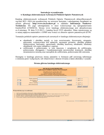 Instrukcja wyszukiwania w Katalogu elektronicznym wybranych Polskich Opisów Patentowych Katalog elektronicznych wybranych Polskich Opisów Patentowych sklasyfikowanych wg klas B23 i B24 jest posadowiony na serwerze Instytutu i udostępniany bezpłatnie na stronie głównej: http://www.ios.krakow.pl w zakładce Informacja NaukowoTechniczna. Do jego udostępniania w sieci wykorzystuje się oprogramowanie GenIsisWeb (UNESCO). Strona www katalogu elektronicznego jest aktualizowana co 4 miesiące. W dniu 9.12.2013 r. katalog liczył 2535 rekordów. Dane rejestrowane są w miarę napływu materiałów z UPRP oraz wstecz ze zbiorów opisów patentowych IZTW. Tematyka polskich opisów patentowych zawartych w katalogu elektronicznym obejmuje: obrabiarki i obróbkę metali, w tym rozwiercanie, frezowanie, struganie, piłowanie, wykonywanie kół zębatych, nacinanie gwintów, obróbkę prądem elektrycznym, lutowanie, zgrzewanie, obróbkę laserową, obrabiarki, elementy obrabiarek, ich części składowe i osprzęt, szlifowanie i polerowanie, w tym maszyny i urządzenia do szlifowania, polerowania, obciągania i kondycjonowania powierzchni ściernych, obróbkę strumieniowo-ścierną oraz narzędzia do szlifowania, polerowania lub ostrzenia. Dostępne w katalogu pierwsze strony patentów w formacie pdf zawierają informacje o istnieniu praw wyłącznych, ich właściwości i okresie trwania a także abstrakty i rysunki. Strona główna katalogu elektronicznego Aby skorzystać z katalogu elektronicznego Polskich Opisów Patentowych należy: 1. w oknie przeglądarki otworzyć stronę katalogu, która znajduje się pod adresem: http://www.ios.krakow.pl/wwwisis/patent/form.htm 2. wybrać pole/pola wyszukiwawcze wg którego/których zamierzamy przeprowadzić wyszukiwanie 3. wpisać terminy wyszukiwawcze do wybranego pola/pól Terminy wyszukiwawcze w ramach jednego pola wpisujemy bez spacji, oddzielając je od siebie średnikiem, np. Numer patentu – 140940;149426 (należy wpisać cały numer) Uprawniony z patentu – Akademia Górniczo-Hutnicza;Instytut Wysokich Ciśnień PAN lub Akademia Górn;Instytut Wysokich Ciśnień P (należy wpisać całą nazwę lub jej fragment, w przypadku nazw złożonych z kilku wyrazów należy wpisać fragment ostatniego wyrazu) Słowa z tytułu – mechanizm;urządzenia;podającego (należy wpisać słowa dokładnie tak jak występują w tytule, oddzielając je średnikami) Słowa kluczowe – automat tokarski poziomy;automat tokarski wielowrzecionowy, automat tokarski poz;automat tokarski wielowrz (należy wpisać całą nazwę lub jej fragment, w przypadku nazw złożonych z kilku wyrazów należy wpisać fragment ostatniego wyrazu) Przykładowy wypełniony formularz wyszukiwawczy Przy wyborze terminu wyszukiwawczego zaleca się korzystanie ze słowników (uprawnionego z patentu i słów kluczowych) przez kliknięcie odpowiedniego przycisku z nazwą słownika, wybór terminów przez podświetlenie w oknie słownika oraz kliknięcie przycisku „Przenieś”, które powoduje przeniesienie terminu do właściwego pola wyszukiwawczego. Przykładowa strona słownika 4. Połączyć pola operatorami logicznymi (and, or) w przypadku gdy - wpisujemy terminy wyszukiwawcze do jednego pola wpisujemy terminy wyszukiwawcze do kilku pól przy czym - wybranie operatora logicznego za pomocą pola wyboru z prawej strony pozwala połączyć terminy wyszukiwawcze w jednym polu wybranie operatora logicznego po lewej stronie pozwala na łączenie kolejnych pól 5. Po wybraniu kryteriów wyszukiwania wciskamy przycisk <szukaj> 6. Wyszukane rekordy można zawężyć za pomocą oznaczeń w polach wyboru (kratkach) przez kliknięcie w pole wyboru z prawej strony (przykład na rys. poniżej). Przykład zbioru wynikowego 7. Wynik drukujemy lub możemy skopiować do edytora MS Word. Jeśli jest to starszy typ edytora (np. wersja MS Word 97-2002) przekształcamy tabelę na tekst. Aby obejrzeć zeskanowaną pierwszą stronę opisu patentowego należy kliknąć w wybranym przez nas rekordzie na link oznaczony napisem „pierwsza strona” (rysunek poniżej). Uwaga: każda strona formularza wyników wyszukiwania musi być zapamiętana lub wydrukowana osobno, ponieważ polecenie „Wyświetlaj wszystkie”/”Wyświetlaj rekordy oznaczone” powoduje wyświetlenie wszystkich rekordów ale tylko z oglądanej aktualnie strony. Pierwsza strona opisu patentowego