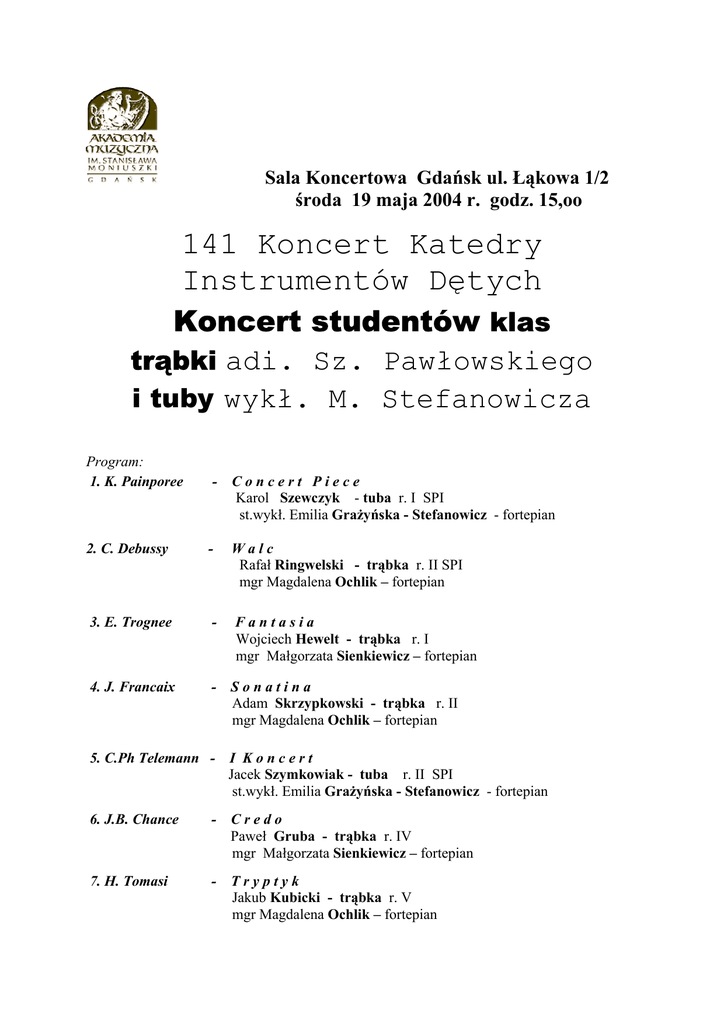 Sala Koncertowa Gdańsk ul. Łąkowa 1/2 środa 19 maja 2004 r. godz. 15,oo 141 Koncert Katedry Instrumentów Dętych Koncert studentów klas trąbki adi. Sz. Pawłowskiego i tuby wykł. M. Stefanowicza Program: 1. K. Painporee - Concert Piece Karol Szewczyk - tuba r. I SPI st.wykł. Emilia Grażyńska - Stefanowicz - fortepian 2. C. Debussy - Walc Rafał Ringwelski - trąbka r. II SPI mgr Magdalena Ochlik – fortepian 3. E. Trognee - Fantasia Wojciech Hewelt - trąbka r. I mgr Małgorzata Sienkiewicz – fortepian 4. J. Francaix - Sonatina Adam Skrzypkowski - trąbka r. II mgr Magdalena Ochlik – fortepian 5. C.Ph Telemann - I K o n c e r t Jacek Szymkowiak - tuba r. II SPI st.wykł. Emilia Grażyńska - Stefanowicz - fortepian 6. J.B. Chance - Credo Paweł Gruba - trąbka r. IV mgr Małgorzata Sienkiewicz – fortepian 7. H. Tomasi - Tryptyk Jakub Kubicki - trąbka r. V mgr Magdalena Ochlik – fortepian