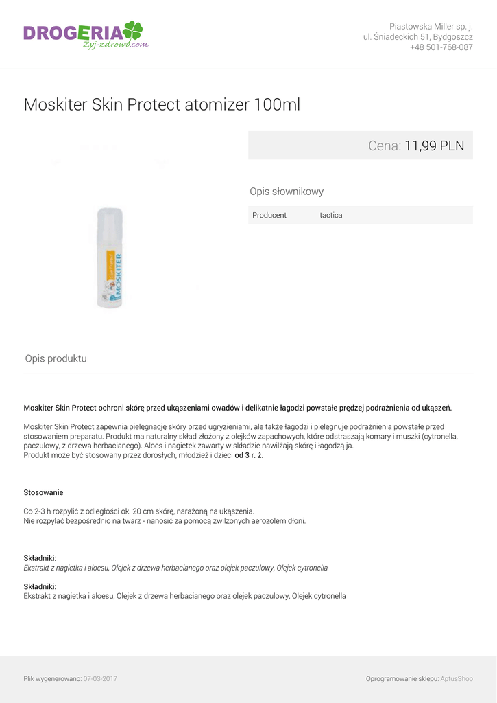 Piastowska Miller sp. j. ul. Śniadeckich 51, Bydgoszcz +48 501-768-087 Moskiter Skin Protect atomizer 100ml Cena: 11,99 PLN Opis słownikowy Producent tactica Opis produktu Moskiter Skin Protect ochroni skórę przed ukąszeniami owadów i delikatnie łagodzi powstałe prędzej podrażnienia od ukąszeń. Moskiter Skin Protect zapewnia pielęgnację skóry przed ugryzieniami, ale także łagodzi i pielęgnuje podrażnienia powstałe przed stosowaniem preparatu. Produkt ma naturalny skład złożony z olejków zapachowych, które odstraszają komary i muszki (cytronella, paczulowy, z drzewa herbacianego). Aloes i nagietek zawarty w składzie nawilżają skórę i łagodzą ja. Produkt może być stosowany przez dorosłych, młodzież i dzieci od 3 r. ż. Stosowanie Co 2-3 h rozpylić z odległości ok. 20 cm skórę, narażoną na ukąszenia. Nie rozpylać bezpośrednio na twarz - nanosić za pomocą zwilżonych aerozolem dłoni. Składniki: Ekstrakt z nagietka i aloesu, Olejek z drzewa herbacianego oraz olejek paczulowy, Olejek cytronella Składniki: Ekstrakt z nagietka i aloesu, Olejek z drzewa herbacianego oraz olejek paczulowy, Olejek cytronella Plik wygenerowano: 07-03-2017 Oprogramowanie sklepu: AptusShop Piastowska Miller sp. j. ul. Śniadeckich 51, Bydgoszcz +48 501-768-087 Plik wygenerowano: 07-03-2017 Powered by TCPDF (www.tcpdf.org) Oprogramowanie sklepu: AptusShop