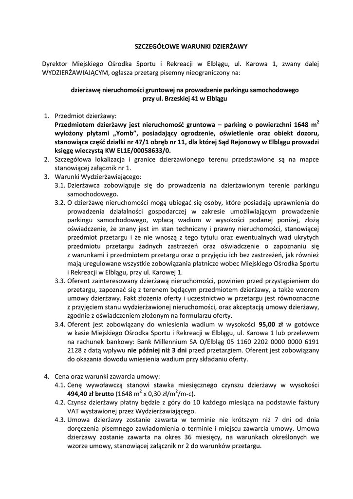 SZCZEGÓŁOWE WARUNKI DZIERŻAWY Dyrektor Miejskiego Ośrodka Sportu i Rekreacji w Elblągu, ul. Karowa 1, zwany dalej WYDZIERŻAWIAJĄCYM, ogłasza przetarg pisemny nieograniczony na: dzierżawę nieruchomości gruntowej na prowadzenie parkingu samochodowego przy ul. Brzeskiej 41 w Elblągu 1. Przedmiot dzierżawy: Przedmiotem dzierżawy jest nieruchomośd gruntowa – parking o powierzchni 1648 m2 wyłożony płytami „Yomb”, posiadający ogrodzenie, oświetlenie oraz obiekt dozoru, stanowiąca częśd działki nr 47/1 obręb nr 11, dla której Sąd Rejonowy w Elblągu prowadzi księgę wieczystą KW EL1E/00058633/0. 2. Szczegółowa lokalizacja i granice dzierżawionego terenu przedstawione są na mapce stanowiącej załącznik nr 1. 3. Warunki Wydzierżawiającego: 3.1. Dzierżawca zobowiązuje się do prowadzenia na dzierżawionym terenie parkingu samochodowego. 3.2. O dzierżawę nieruchomości mogą ubiegad się osoby, które posiadają uprawnienia do prowadzenia działalności gospodarczej w zakresie umożliwiającym prowadzenie parkingu samochodowego, wpłacą wadium w wysokości podanej poniżej, złożą oświadczenie, że znany jest im stan techniczny i prawny nieruchomości, stanowiącej przedmiot przetargu i że nie wnoszą z tego tytułu oraz ewentualnych wad ukrytych przedmiotu przetargu żadnych zastrzeżeo oraz oświadczenie o zapoznaniu się z warunkami i przedmiotem przetargu oraz o przyjęciu ich bez zastrzeżeo, jak również mają uregulowane wszystkie zobowiązania płatnicze wobec Miejskiego Ośrodka Sportu i Rekreacji w Elblągu, przy ul. Karowej 1. 3.3. Oferent zainteresowany dzierżawą nieruchomości, powinien przed przystąpieniem do przetargu, zapoznad się z terenem będącym przedmiotem dzierżawy, a także wzorem umowy dzierżawy. Fakt złożenia oferty i uczestnictwo w przetargu jest równoznaczne z przyjęciem stanu wydzierżawionej nieruchomości, oraz akceptacją umowy dzierżawy, zgodnie z oświadczeniem złożonym na formularzu oferty. 3.4. Oferent jest zobowiązany do wniesienia wadium w wysokości 95,00 zł w gotówce w kasie Miejskiego Ośrodka Sportu i Rekreacji w Elblągu, ul. Karowa 1 lub przelewem na rachunek bankowy: Bank Millennium SA O/Elbląg 05 1160 2202 0000 0000 6191 2128 z datą wpływu nie później niż 3 dni przed przetargiem. Oferent jest zobowiązany do okazania dowodu wniesienia wadium przy składaniu oferty. 4. Cena oraz warunki zawarcia umowy: 4.1. Cenę wywoławczą stanowi stawka miesięcznego czynszu dzierżawy w wysokości 494,40 zł brutto (1648 m2 x 0,30 zł/m2/m-c). 4.2. Czynsz dzierżawy płatny będzie z góry do 10 każdego miesiąca na podstawie faktury VAT wystawionej przez Wydzierżawiającego. 4.3. Umowa dzierżawy zostanie zawarta w terminie nie krótszym niż 7 dni od dnia doręczenia pisemnego zawiadomienia o terminie i miejscu zawarcia umowy. Umowa dzierżawy zostanie zawarta na okres 36 miesięcy, na warunkach określonych we wzorze umowy, stanowiącej załącznik nr 2 do warunków przetargu. Załącznik nr 1 /mapa/ Załącznik nr 2 /wzór umowy/ UMOWA DZIERŻAWY Nr ..…/D/2015 zawarta dnia ……………….. w Elblągu pomiędzy: Gminą Miasto Elbląg, ul. Łączności 1, 82-300 Elbląg, reprezentowaną przez Prezydenta Miasta Elbląga – z pełnomocnictwa, którego działa Marek Wnuk – Dyrektor Miejskiego Ośrodka Sportu i Rekreacji w Elblągu, ul. Karowa 1, NIP: 578-10-08-771, REGON: 000662959, zwany w dalszej części umowy „Wydzierżawiającym”, a …………………………………………………………………………………………………………………………………………………………… …………………………………………………………………………………………………………………………………………………………… zwanym w dalszej części umowy „Dzierżawcą”, o następującej treści: § 1. Wydzierżawiający oddaje Dzierżawcy do odpłatnego używania nieruchomośd gruntową na prowadzenie parkingu samochodowego o powierzchni 1648 m2 położoną przy ulicy Brzeskiej 41 w Elblągu wyłożoną płytami „Yomb”, posiadającą ogrodzenie, oświetlenie oraz obiekt dozoru (grunt stanowiący częśd działki 41/7 obręb 11, KW EL1E/00058633/0). § 2. Dzierżawca zobowiązuje się do: 1) zapewnienia funkcjonowania parkingu przez 24 godzin na dobę; 2) stałego utrzymania czystości i porządku na terenie i wokół parkingu (w odległości 1,5 m od granic parkingu); 3) obsługiwania bramy wjazdowej na terenie obiektu noclegowego MOSiR; 4) pokrywania kosztów związanych z utrzymaniem i eksploatacją parkingu; § 3. Umowa zostaje zawarta na czas określony, od dnia ……………… r. do dnia …………………. r. 1. 2. 3. 4. 5. § 4. Czynsz za dzierżawę, zgodnie ze złożoną ofertą przetargową, wynosi: kwota netto: ……………….. kwota podatku VAT( 23%):…………. kwota brutto:……………. słownie brutto: ……………………………………………………………………………..… Czynsz płatny jest z góry do dnia 10 każdego miesiąca w kasie, bądź przelewem na rachunek bankowy: Bank Millennium SA O/Elbląg 05 1160 2202 0000 0000 6191 2128 Miejskiego Ośrodka Sportu i Rekreacji w Elblągu, ul. Karowa 1 na podstawie wystawionej przez Wydzierżawiającego faktury VAT. Należnośd za zużycie energii elektrycznej w znajdującym się na terenie dzierżawionej nieruchomości – obiekcie dozoru regulowana będzie przez Dzierżawcę na podstawie faktury VAT wystawionej przez Wydzierżawiającego, w terminie 7 dni od daty jej otrzymania. Należnośd ta naliczana będzie według wskazao podlicznika (ilośd kWh x aktualna cena od dostawcy energii). W razie nie uiszczenia opłat w terminie, naliczane będą odsetki ustawowe. Wydzierżawiający ma prawo podwyższenia czynszu za przedmiot dzierżawy w przypadku zmiany Zarządzenia Prezydenta Miasta Elbląga w sprawie ustal