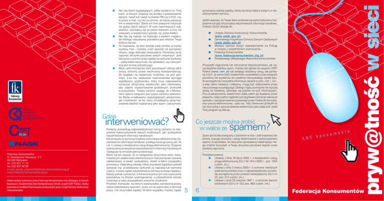 ● ● ● od sprawcy szkody zapłaty, której nie otrzymałeś w związku z niedotrzymaniem terminu. Nie ufaj listom wyglądającym, jakby wysłał je np. Twój bank, w których znajduje się prośba o potwierdzenie danych, haseł lub nawet numerów PIN czy CVV2, czy to przez e-mail, czy też na stronie, do której wskazuje link w wiadomości. Banki ani inne poważne instytucje nie gubią takich danych. W razie najmniejszych wątpliwości, skontaktuj się ze swoim bankiem w inny niż wskazany w wiadomości sposób, np. przez telefon. Nie daj się nabrać na historyjki o wielkim majątku, do którego odzyskania potrzebna jest właśnie Twoja drobna pomoc. To nieprawda, że ktoś dostaje parę centów za każdy wysłany mail – niestety, w ten sposób nie pomożesz nikomu, kogo dotknęło nieszczęście. Pomożesz za to zapchać skrzynki pocztowe swoich znajomych. Jeśli ktoś prosi o pomoc przez wpłatę na rachunek bankowy – zadaj sobie nieco trudu, by sprawdzić, czy rzeczywiście jest to ktoś potrzebujący. Wielu administratorów kont pocztowych oferuje jakiś rodzaj ochrony przed niechcianą korespondencją. Ze względu na niejasność kryteriów, co jest spamem, a co nie, większość mechanizmów wymaga współpracy użytkownika, który musi odpowiednio oznaczyć otrzymaną wiadomość jako niechcianą, aby ułatwić rozpoznawanie podobnych przesyłek w przyszłości. Trzeba zwrócić uwagę, że z ltrowaniem spamu związane jest ryzyko zarówno zawodności ltrów w odławianiu niepożądanych wiadomości, jak i możliwość, że list, który chcielibyśmy otrzymać, zostanie błędnie rozpoznany jako spam i zatrzymany. Jeżeli uważasz, że Twoje dane osobowe są wykorzystywane bezprawnie lub gdy otrzymujesz niezamówione informacje handlowe, możesz złożyć skargę do: ● ● ● ● ● Przypadki zagrożenia lub naruszenia bezpieczeństwa, jak np. szczególnie dotkliwy spam, możesz też zgłosić do zespołu CERT Polska (www. cert. pl) lub swojego dostawcy usług, ale pamiętaj o tym, że sama treść wiadomości wyświetlana przez program pocztowy nie wystarcza do ustalenia rzeczywistego źródła listu. W szczególności wszystkie informacje zawarte w polu „Od” i „Do”, a więc dane nadawcy i odbiorcy, mogą być sfałszowane przez nieuczciwego wysyłającego. Dlatego nigdy pochopnie nie wysyłaj skarg na nadawcę, opierając się jedynie na tych informacjach. Przy przekazywaniu wiadomości dalej celem jej zbadania przez eksperta, załącz pełne nagłówki (szczegółowe instrukcje zależą od sposobu i oprogramowania używanego przez Ciebie do korzystania z poczty elektronicznej – patrz np.: http://www.cert.pl/faq#4.4) lub skorzystaj z opcji przesłania wiadomości jako załącznik, jeżeli Twój program ją oferuje. Gdzie interweniować? Federacja Konsumentów Pl. Powstańców Warszawy 1/3 00-030 Warszawa tel. (22) 827 11 73 fax (22) 827 90 59 e-mail: [email protected] www.federacja-konsumentow.org.pl Ulotka została wykonana przez Federację Konsumentów oraz działający w ramach Naukowej i Akademickiej Sieci Komputerowej (NASK) zespół CERT Polska. Ulotka powstała ze środków nansowych przekazanych przez Urząd Ochrony Konkurencji i Konsumentów. Przepisy przewidują odpowiedzialność karną zarówno za bezprawne wykorzystywanie danych osobowych, jak i przesyłanie niezamówionych informacji handlowych. Kto przesyła za pomocą środków komunikacji elektronicznej niezamówione informacje handlowe, podlega karze grzywny (art. 24 ust. 1 ustawy o świadczeniu usług drogą elektroniczną). Ściganie wykroczenia przesyłania niezamówionych informacji handlowych następuje na wniosek pokrzywdzonego. Może się też okazać, że w następstwie otrzymania wielu niezamówionych wiadomości elektronicznych Twój komputer zostanie zablokowany a nawet uszkodzony. Jeżeli w takim przypadku poniesiesz materialną szkodę, której wysokość będziesz potrał wykazać (np. przedstawisz rachunek za naprawę lub wymianę części), możesz żądać odszkodowania od nieuczciwego nadawcy. Należy jednak zaznaczyć, iż konieczne jest w tym celu wytoczenie powództwa na drodze cywilnoprawnej, a udowodnienie szkody może być w wielu przypadkach znacznie utrudnione. Przykład: Komputer, na którym wykonywałeś zamówioną pracę, został zablokowany spamem, przez co nie wykonałeś w terminie pracy i nie otrzymałeś zapłaty. W takim wypadku możesz żądać Urzędu Ochrony Konkurencji i Konsumentów (www. uokik. gov. pl), Generalnego Inspektora Ochrony Danych Osobowych (www. giodo. gov. pl), Możesz również złożyć zawiadomienie na Policję w związku z popełnieniem wykroczenia, Federacji Konsumentów (www. federacja-konsumentow. org. pl), Powiatowego (Miejskiego) Rzecznika Konsumentów. Co jeszcze można zrobić w walce ze spamem? Spam jest ściśle powiązany z biznesem w sieci. Jeśli wspierasz ten biznes, kupując produkty i usługi reklamowane z wykorzystaniem spamu, to sprawiasz, że nieuczciwi sprzedawcy nadal będą z niego chętnie korzystali, a Twoja skrzynka pocztowa będzie coraz bardziej zapchana. Podstawa prawna: ● Ustawa z dnia 18 lipca 2002 r. o świadczeniu usług drogą elektroniczną (Dz U Nr 144 z 2002 r., poz. 1204 z późn. zm.), ● Ustawa z dnia 2 marca 2000 r. o ochronie niektórych praw konsumentów oraz o odpowiedzialności za szkodę wyrządzoną przez produkt niebezpieczny (Dz U nr 22, poz. 271 z późn. zm.), ● Ustawa z dnia 29 sierpnia 1997 r. o ochronie danych osobowych (Dz U nr 133, poz. 883 z późn. zm.). 5 6 A BC t a umen s n o k pryw@tność w sieci ● Federacja Konsumentów Czym jest spam? Spam bardzo często utożsamiany jest z pojęciem niechcianej i niezamówionej wiadomości wysyłanej za pomocą poczty elektronicznej. Należy jednak pamiętać, że zjawisko to ma dużo szerszy zakres oddziaływania. Za spam należy bowiem uznać wszelką niechcianą korespondencję pojawiającą się na następujących platforma