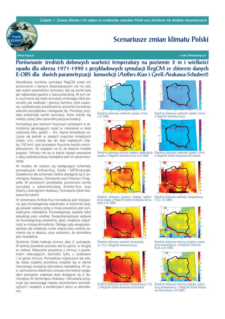 Zadanie 1. Zmiany klimatu i ich wpływ na środowisko naturalne Polski oraz określenie ich skutków ekonomicznych Scenariusze zmian klimatu Polski klimat.imgw.pl e-mail: [email protected] Porównanie średnich dobowych wartości temperatury na poziomie 2 m i wielkości opadu dla okresu 1971-1990 z przykładowych symulacji RegCM ze zbiorem danych E-OBS dla dwóch parametryzacji konwekcji (Anthes-Kuo i Grell-Arakawa-Schubert) Weryfikacja wyników symulacji RegCM przez ich porównanie z danymi obserwacyjnymi ma na celu taki wybór parametrów symulacji, aby jej wyniki były jak najbardziej zgodne z rzeczywistością. W tym celu uruchamia się wiele symulacji zmieniając takie parametry jak wielkość i granice domeny, krok czasowy, rozdzielczość przestrzenna, schemat konwekcji, warunki początkowe i brzegowe itp. Poniższy przykład prezentuje wyniki symulacji, które różniły się miedzy sobą tylko parametryzacją konwekcji. Konwekcja jest istotnym fizycznym procesem w atmosferze generującym opad w mezoskali w skali czasowej kilku godzin – dni. Sama konwekcja zaczyna się jednak w skalach znacznie mniejszych (rzędu cm), rozwija się do skal większych (rzędu 100 km) i jest procesem fizycznie bardzo skomplikowanym. Ze względu na to, że obecne modele pogody i klimatu nie są w stanie opisać procesów z taką rozdzielczością niezbędna jest ich parametryzacja. W modelu do wyboru są następujące schematy konwekcyjne: Anthes-Kuo, Grella i MITEmanuela. Dodatkowo dla schematu Grell’a dostępne są 2 domknięcia: Arakawy i Schuberta oraz Fritscha i Chappella. W poniższym przykładzie porównano wyniki symulacji z parametryzacją Anthes-Kuo oraz Grell'a z doknięciem Arakawy i Schuberta (Grell-Arakawa-Schubert) W schemacie Anthes-Kuo konwekcja jest inicjowana, gdy konwergencja wilgotności w kolumnie osiąga pewien zadany próg a masa powietrza jest konwekcyjnie niestabilna. Konwergencja zawiera tylko adwekcję pary wodnej. Ewapotranspiracja wpływa na konwergencję pośrednio, gdyż zwiększa wilgotność w niższej atmosferze. Dlatego, gdy ewapotranspiracja się zwiększa, coraz więcej pary wodnej zamienia się w deszcz, przy założeniu, że atmosfera jest niestabilna. Schemat Grella traktuje chmury jako 2 cyrkulacje. W jednej powietrze porusza się ku górze, w drugiej ku dołowi. Mieszanie powietrza z chmury z powietrzem otaczającym zachodzi tylko u podstawy i na górze chmury. Konwekcja rozpoczyna się wtedy, kiedy cząstka powietrza znajdzie się w stanie równowagi chwiejnej (atmosfera niestabilna). W celu zachowania stabilności procesu konwekcji względem procesów większej skali dostępne są 2 domknięcia. W domknięciu Arakawy i Schuberta przyjmuje się równowagę między strumieniami konwekcyjnymi i opadem a tendencjami stanu w atmosferze. Średnia dobowa wielkość opadu (mm) z E-OBS Średnia dobowa wielkość opadu (mm) z RegCM (Anthes-Kuo) Średnia dobowa różnica między wielkością Średnia dobowa wielkość opadu (mm) opadu z RegCM (Anthes-Kuo) a E-OBS z RegCM (Grell-Arakawa-Schubert) Średnia dobowa różnica między wielko- Średnia dobowa wartość temperatury ścią opadu z RegCM (Grell-Arakawa-Schu- (°C) z E-OBS bert) a E-OBS Średnia dobowa wartość temperatury (°C) z RegCM (Anthes-Kuo) Średnia dobowa różnica między wartością temperatury z RegCM (AnthesKuo) a E-OBS Średnia dobowa wartość temperatury (°C) Średnia dobowa różnica między wartoz RegCM (Grell-Arakawa-Schubert) ścią temperatury z RegCM (Grell-Arakawa-Schubert) a E-OBS