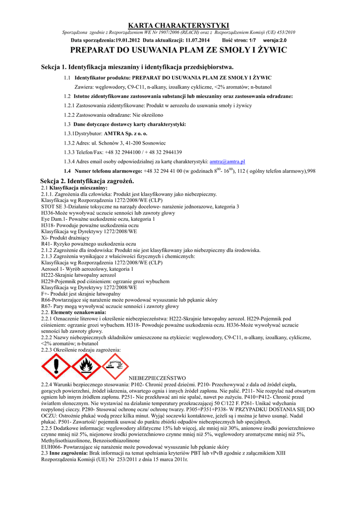 KARTA CHARAKTERYSTYKI Sporządzona zgodnie z Rozporządzeniem WE Nr 1907/2006 (REACH) oraz z Rozporządzeniem Komisji (UE) 453/2010 Data sporządzenia:19.01.2012 Data aktualizacji: 11.07.2014 Ilość stron: 1/7 wersja:2.0 PREPARAT DO USUWANIA PLAM ZE SMOŁY I ŻYWIC Sekcja 1. Identyfikacja mieszaniny i identyfikacja przedsiębiorstwa. 1.1 Identyfikator produktu: PREPARAT DO USUWANIA PLAM ZE SMOŁY I ŻYWIC Zawiera: węglowodory, C9-C11, n-alkany, izoalkany cykliczne, <2% aromatów; n-butanol 1.2 Istotne zidentyfikowane zastosowania substancji lub mieszaniny oraz zastosowania odradzane: 1.2.1 Zastosowania zidentyfikowane: Produkt w aerozolu do usuwania smoły i żywicy 1.2.2 Zastosowania odradzane: Nie określono 1.3 Dane dotyczące dostawcy karty charakterystyki: 1.3.1Dystrybutor: AMTRA Sp. z o. o. 1.3.2 Adres: ul. Schonów 3, 41-200 Sosnowiec 1.3.3 Telefon/Fax: +48 32 2944100 / + 48 32 2944139 1.3.4 Adres email osoby odpowiedzialnej za kartę charakterystyki: [email protected] 1.4 Numer telefonu alarmowego: +48 32 294 41 00 (w godzinach 800- 1600), 112 ( ogólny telefon alarmowy),998 Sekcja 2. Identyfikacja zagrożeń. 2.1 Klasyfikacja mieszaniny: 2.1.1. Zagrożenia dla człowieka: Produkt jest klasyfikowany jako niebezpieczny. Klasyfikacja wg Rozporządzenia 1272/2008/WE (CLP) STOT SE 3-Działanie toksyczne na narządy docelowe- narażenie jednorazowe, kategoria 3 H336-Może wywoływać uczucie senności lub zawroty głowy Eye Dam.1- Poważne uszkodzenie oczu, kategoria 1 H318- Powoduje poważne uszkodzenia oczu Klasyfikacja wg Dyrektywy 1272/2008/WE Xi- Produkt drażniący R41- Ryzyko poważnego uszkodzenia oczu 2.1.2 Zagrożenie dla środowiska: Produkt nie jest klasyfikowany jako niebezpieczny dla środowiska. 2.1.3 Zagrożenia wynikające z właściwości fizycznych i chemicznych: Klasyfikacja wg Rozporządzenia 1272/2008/WE (CLP) Aerosol 1- Wyrób aerozolowy, kategoria 1 H222-Skrajnie łatwopalny aerozol H229-Pojemnik pod ciśnieniem: ogrzanie grozi wybuchem Klasyfikacja wg Dyrektywy 1272/2008/WE F+- Produkt jest skrajnie łatwopalny R66-Powtarzające się narażenie może powodować wysuszanie lub pękanie skóry R67- Pary mogą wywoływać uczucie senności i zawroty głowy 2.2. Elementy oznakowania: 2.2.1 Oznaczenie literowe i określenie niebezpieczeństwa: H222-Skrajnie łatwopalny aerozol. H229-Pojemnik pod ciśnieniem: ogrzanie grozi wybuchem. H318- Powoduje poważne uszkodzenia oczu. H336-Może wywoływać uczucie senności lub zawroty głowy. 2.2.2 Nazwy niebezpiecznych składników umieszczone na etykiecie: węglowodory, C9-C11, n-alkany, izoalkany, cykliczne, <2% aromatów; n-butanol 2.2.3 Określenie rodzaju zagrożenia: NIEBEZPIECZEŃSTWO 2.2.4 Warunki bezpiecznego stosowania: P102- Chronić przed dziećmi. P210- Przechowywać z dala od źródeł ciepła, gorących powierzchni, źródeł iskrzenia, otwartego ognia i innych źródeł zapłonu. Nie palić. P211- Nie rozpylać nad otwartym ogniem lub innym źródłem zapłonu. P251- Nie przekłuwać ani nie spalać, nawet po zużyciu. P410+P412- Chronić przed światłem słonecznym. Nie wystawiać na działanie temperatury przekraczającej 50 C/122 F. P261- Unikać wdychania rozpylonej cieczy. P280- Stosować ochronę oczu/ ochronę twarzy. P305+P351+P338- W PRZYPADKU DOSTANIA SIĘ DO OCZU: Ostrożnie płukać wodą przez kilka minut. Wyjąć soczewki kontaktowe, jeżeli są i można je łatwo usunąć. Nadal płukać. P501- Zawartość/ pojemnik usuwać do punktu zbiórki odpadów niebezpiecznych lub specjalnych. 2.2.5 Dodatkowe informacje: węglowodory alifatyczne 15% lub więcej, ale mniej niż 30%, anionowe środki powierzchniowo czynne mniej niż 5%, niejonowe środki powierzchniowo czynne mniej niż 5%, węglowodory aromatyczne mniej niż 5%, Methylisothiazolinone, Benzoisothiazolinone EUH066- Powtarzające się narażenie może powodować wysuszanie lub pękanie skóry 2.3 Inne zagrożenia: Brak informacji na temat spełniania kryteriów PBT lub vPvB zgodnie z załącznikiem XIII Rozporządzenia Komisji (UE) Nr 253/2011 z dnia 15 marca 2011r. KARTA CHARAKTERYSTYKI Sporządzona zgodnie z Rozporządzeniem WE Nr 1907/2006 (REACH) oraz z Rozporządzeniem Komisji (UE) 453/2010 Data sporządzenia:19.01.2012 Data aktualizacji: 11.07.2014 Ilość stron: 2/7 wersja:2.0 PREPARAT DO USUWANIA PLAM ZE SMOŁY I ŻYWIC Sekcja3.Skład i informacje o składnikach 3.1 Substancje: Nie dotyczy 3.2 Mieszaniny: Nazwa chemiczna składnika Zakres stężeń Numer CAS Numer WE Klasyfikacja wg 67/548/EWG Klasyfikacja wg 1272/2008/WE Gaz z ropy naftowej Nr rejestracji: nie podlega 50%-55% 68476-86-8 270-705-8 F+, R12 Nota H, K, S Węglowodory, C9-C11, n-alkany, izoalkany, cykliczne, <2% aromatów Nr rejestracji: 01-2119463258-33xxxx n-butanol Nr rejestracji: 01-2119484630-38xxxx 30%-35% - 919-857-5 R10 Xn, R65, R66, R67 Flam. Gas 1, H220 Press. Gas, H280 Nota H, K, S, U Flam. Liq.3, H226 Asp. Tox.1, H304 STOT SE.3, H336 EUH 066 1%-5% 71-36-3 200-751-6 R10 Xn, R22 Xi, R37/38, R41 R67 Kwas pdodecylobenzenosulfonowy, związek 1-aminopropan-2-olu Nr rejestracji: nie podlega Dekan-1-ol, etoksylowany Nr rejestracji: nie podlega <1% 42504-46-1 255-854-9 Xi, R38, R41 <1% 26183-52-8 - Xi, R41 Eye Dam. 1, H318 Alkohole C12-C14 etoksylowane Nr rejestracji: 01-2119487984-16xxxx Dioktylowy eter soli sodowej kwasu sulfobursztynowego Nr rejestracji: 01-2119491296-29xxxx 1-(2-metoksy-1metyloetoksy)propan-2-ol <1% 68439-50-9 - Xi, R41 N, R50 Eye Dam.1, H318 Aquatic Acute 1, H400 <1% 577-11-7 209-406-4 Xi, R38, R41 Skin Irrit.2, H315 Eye Dam. 1, H318 <0,1% 34590-94-8 252-104-2 - - Flam. Liq.3, H226 Acute Tox.4, H302 STOT SE.3, H335 Skin Irrit.2, H315 Eye Dam.1, H318 STOT SE.3, H336 Skin Irrit.2, H315 Eye Dam.1, H318 SEKCJA 4. ŚRODKI PIERWSZEJ POMOCY 4.1 Opis środków pierwszej pomocy: 4.1.1 Połknięcie: W razie połknięcia, nie wywoływać wymiotów. W przypadku wystąpienia naturalnych odruchów wymiotnych trzymać poszkodowanego w pozycji nachylonej do