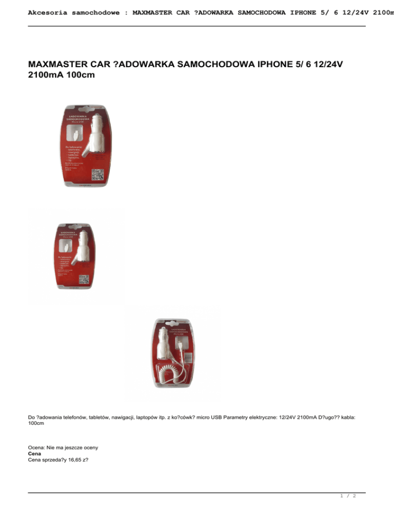 Akcesoria samochodowe : MAXMASTER CAR ?ADOWARKA SAMOCHODOWA IPHONE 5/ 6 12/24V 2100m MAXMASTER CAR ?ADOWARKA SAMOCHODOWA IPHONE 5/ 6 12/24V 2100mA 100cm Do ?adowania telefonów, tabletów, nawigacji, laptopów itp. z ko?cówk? micro USB Parametry elektryczne: 12/24V 2100mA D?ugo?? kabla: 100cm Ocena: Nie ma jeszcze oceny Cena Cena sprzeda?y 16,65 z? 1 / 2 Akcesoria samochodowe : MAXMASTER CAR ?ADOWARKA SAMOCHODOWA IPHONE 5/ 6 12/24V 2100m Ask a question about this product Opis Do ?adowania telefonów, tabletów, nawigacji, laptopów itp. z ko?cówk? micro USB Parametry elektryczne: 12/24V 2100mA D?ugo?? kabla: 100cm Opinie Nikt jeszcze nie recenzowa? tego produktu. 2 / 2 Powered by TCPDF (www.tcpdf.org)