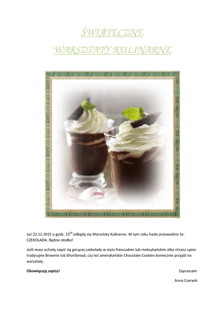 Ś Ą ŚWIĄTECZNE WARSZTATY KULINARNE Już 22.12.2015 o godz. 1500 odbędą się Warsztaty Kulinarne. W tym roku hasło przewodnie to: CZEKOLADA. Będzie słodko! Jeśli masz ochotę napić się gorącej czekolady w stylu francuskim lub meksykańskim albo chcesz upiec tradycyjne Brownie lub Shortbread, czy też amerykańskie Chocolate Cookies koniecznie przyjdź na warsztaty. Obowiązują zapisy! Zapraszam Anna Czerwik