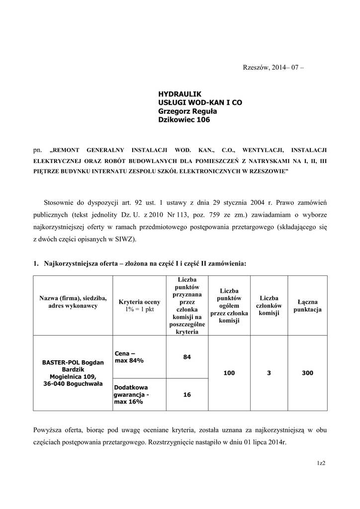 Rzeszów, 2014– 07 – HYDRAULIK USŁUGI WOD-KAN I CO Grzegorz Reguła Dzikowiec 106 pn. „REMONT GENERALNY INSTALACJI WOD. KAN., C.O., WENTYLACJI, INSTALACJI ELEKTRYCZNEJ ORAZ ROBÓT BUDOWLANYCH DLA POMIESZCZEŃ Z NATRYSKAMI NA I, II, III PIĘTRZE BUDYNKU INTERNATU ZESPOŁU SZKÓŁ ELEKTRONICZNYCH W RZESZOWIE” Stosownie do dyspozycji art. 92 ust. 1 ustawy z dnia 29 stycznia 2004 r. Prawo zamówień publicznych (tekst jednolity Dz. U. z 2010 Nr 113, poz. 759 ze zm.) zawiadamiam o wyborze najkorzystniejszej oferty w ramach przedmiotowego postępowania przetargowego (składającego się z dwóch części opisanych w SIWZ). 1. Najkorzystniejsza oferta – złoŜona na część I i część II zamówienia: Nazwa (firma), siedziba, adres wykonawcy BASTER-POL Bogdan Bardzik Mogielnica 109, 36-040 Boguchwała Kryteria oceny 1% = 1 pkt Cena – max 84% Liczba punktów Liczba przyznana punktów przez ogółem członka przez członka komisji na komisji poszczególne kryteria Łączna punktacja 3 300 84 100 Dodatkowa gwarancja max 16% Liczba członków komisji 16 PowyŜsza oferta, biorąc pod uwagę oceniane kryteria, została uznana za najkorzystniejszą w obu częściach postępowania przetargowego. Rozstrzygnięcie nastąpiło w dniu 01 lipca 2014r. 1z2 2. Pozostałe oferty: Nazwa (firma), siedziba, adres wykonawcy HYDRAULIK USŁUGI WOD-KAN I CO Grzegorz Reguła Dzikowiec 106 Firma Handlowo – Usługowa Remontowo – Budowlana Rafał Kołodziej 38-103 Glinik Charzewski, Zaborów 181 Kryteria oceny 1% = 1 pkt Liczba punktów przyznana przez członka komisji na poszczególn e kryteria Liczba punktów ogółem przez członka komisji Liczba członków komisji Łączna punktacja Oferta (tylko część II zamówienia) odrzucona na podstawie art. 89 ust. 1 pkt 6 ustawy z dnia 29 stycznia 2004 r. Prawo zamówień publicznych (tekst jednolity Dz. U. z 2010 Nr 113, poz. 759 ze zm.) – w ofercie zastosowano nieprawidłową stawkę podatku VAT Oferta (część I i część II zamówienia) odrzucona na podstawie art. 89 ust. 1 pkt 6 ustawy z dnia 29 stycznia 2004 r. Prawo zamówień publicznych (tekst jednolity Dz. U. z 2010 Nr 113, poz. 759 ze zm.) – w ofercie zastosowano nieprawidłową stawkę podatku VAT 3. Termin po upływie którego moŜe zostać zawarta umowa - po upływie 5 dni od dnia przekazania niniejszego wyboru najkorzystniejszej oferty (art. 94 ust. 1 pkt 2 uPzp). 2z2