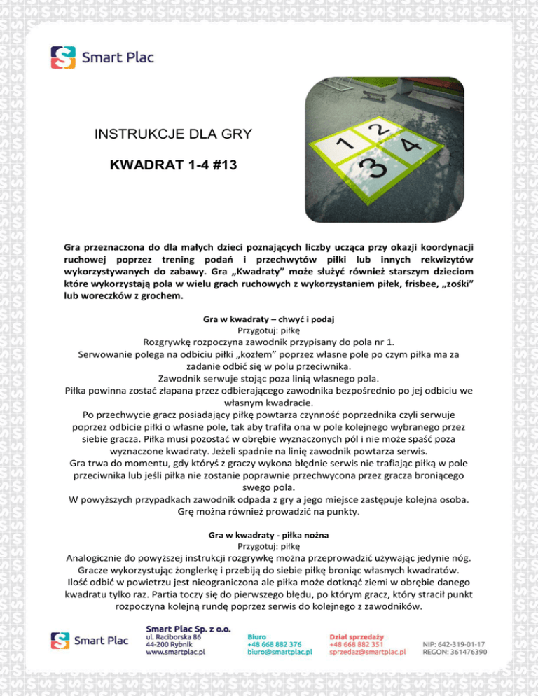 INSTRUKCJE DLA GRY KWADRAT 1-4 #13 Gra przeznaczona do dla małych dzieci poznających liczby ucząca przy okazji koordynacji ruchowej poprzez trening podao i przechwytów piłki lub innych rekwizytów wykorzystywanych do zabawy. Gra „Kwadraty” może służyd również starszym dzieciom które wykorzystają pola w wielu grach ruchowych z wykorzystaniem piłek, frisbee, „zośki” lub woreczków z grochem. Gra w kwadraty – chwyd i podaj Przygotuj: piłkę Rozgrywkę rozpoczyna zawodnik przypisany do pola nr 1. Serwowanie polega na odbiciu piłki „kozłem” poprzez własne pole po czym piłka ma za zadanie odbid się w polu przeciwnika. Zawodnik serwuje stojąc poza linią własnego pola. Piłka powinna zostad złapana przez odbierającego zawodnika bezpośrednio po jej odbiciu we własnym kwadracie. Po przechwycie gracz posiadający piłkę powtarza czynnośd poprzednika czyli serwuje poprzez odbicie piłki o własne pole, tak aby trafiła ona w pole kolejnego wybranego przez siebie gracza. Piłka musi pozostad w obrębie wyznaczonych pól i nie może spaśd poza wyznaczone kwadraty. Jeżeli spadnie na linię zawodnik powtarza serwis. Gra trwa do momentu, gdy któryś z graczy wykona błędnie serwis nie trafiając piłką w pole przeciwnika lub jeśli piłka nie zostanie poprawnie przechwycona przez gracza broniącego swego pola. W powyższych przypadkach zawodnik odpada z gry a jego miejsce zastępuje kolejna osoba. Grę można również prowadzid na punkty. Gra w kwadraty - piłka nożna Przygotuj: piłkę Analogicznie do powyższej instrukcji rozgrywkę można przeprowadzid używając jedynie nóg. Gracze wykorzystując żonglerkę i przebiją do siebie piłkę broniąc własnych kwadratów. Ilośd odbid w powietrzu jest nieograniczona ale piłka może dotknąd ziemi w obrębie danego kwadratu tylko raz. Partia toczy się do pierwszego błędu, po którym gracz, który stracił punkt rozpoczyna kolejną rundę poprzez serwis do kolejnego z zawodników.