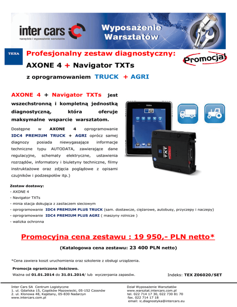 Profesjonalny zestaw diagnostyczny: AXONE 4 + Navigator TXTs z oprogramowaniem TRUCK + AGRI AXONE 4 + Navigator TXTs jest wszechstronną i kompletną jednostką diagnostyczną, która oferuje maksymalne wsparcie warsztatom. Dostępne w AXONE 4 oprogramowanie IDC4 PREMIUM TRUCK + AGRI oprócz samej diagnozy posiada techniczne typu regulacyjne, niewygasające AUTODATA, schematy informacje zawierające elektryczne, dane ustawienia rozrządów, informatory i biuletyny techniczne, filmy instruktażowe oraz zdjęcia poglądowe z opisami czujników i podzespołów itp.) Zestaw dostawy: - AXONE 4 - Navigator TXTs - minia stacja dokująca z zasilaczem sieciowym - oprogramowanie IDC4 PREMIUM PLUS TRUCK (sam. dostawcze, ciężarowe, autobusy, przyczepy i naczepy) - oprogramowanie IDC4 PREMIUM PLUS AGRI ( maszyny rolnicze ) - walizka ochronna Promocyjna cena zestawu : 19 950,- PLN netto* (Katalogowa cena zestawu: 23 400 PLN netto) *Cena zawiera koszt uruchomienia oraz szkolenie z obsługi urządzenia. Promocja ograniczona ilościowo. Ważna od 01.01.2014 do 31.01.2014/ lub wyczerpania zapasów. Inter Cars SA Centrum Logistyczne 1. ul. Gdańska 15, Cząstków Mazowiecki, 05-152 Czosnów 2. ul. Klonowa 48, Kajetany, 05-830 Nadarzyn www.intercars.com.pl Indeks: TEX Z06020/SET Dział Wyposażenie Warsztatów www.warsztat.intercars.com.pl tel. 022 714 17 30, 022 730 81 70 fax. 022 714 17 18 email: [email protected]