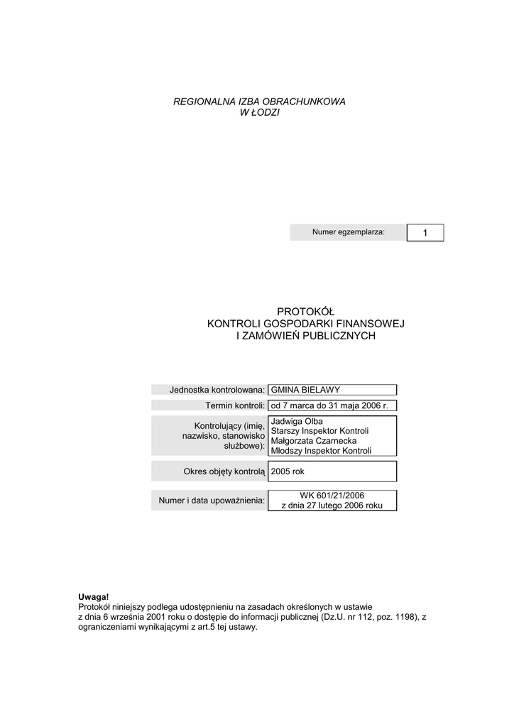 REGIONALNA IZBA OBRACHUNKOWA W ŁODZI Numer egzemplarza: 1 PROTOKÓŁ KONTROLI GOSPODARKI FINANSOWEJ I ZAMÓWIEŃ PUBLICZNYCH Jednostka kontrolowana: GMINA BIELAWY Termin kontroli: od 7 marca do 31 maja 2006 r. Jadwiga Olba Kontrolujący (imię, Starszy Inspektor Kontroli nazwisko, stanowisko Małgorzata Czarnecka słuŜbowe): Młodszy Inspektor Kontroli Okres objęty kontrolą 2005 rok Numer i data upowaŜnienia: WK 601/21/2006 z dnia 27 lutego 2006 roku Uwaga! Protokół niniejszy podlega udostępnieniu na zasadach określonych w ustawie z dnia 6 września 2001 roku o dostępie do informacji publicznej (Dz.U. nr 112, poz. 1198), z ograniczeniami wynikającymi z art.5 tej ustawy. PROTOKÓŁ Z KONTROLI KOMPLEKSOWEJ PRZEPROWADZONEJ W GMINIE BIELAWY Regionalna Izba Obrachunkowa w Łodzi, ul. Zamenhofa 10 90-431 Łódź, tel. 42-6366896, fax 6367424 I. INFORMACJE WSTĘPNE DANE O JEDNOSTCE Adres siedziby Urzędu Gminy: ul. Garbarska 11, 99-423 Bielawy Gmina Bielawy połoŜona jest w północno – zachodniej części powiatu łowickiego i wschodniej części województwa łódzkiego. Jest gminą typowo rolniczą. Na terenie gminy znajduje się 39 miejscowości skupionych w 39 sołectwach. Ogólna powierzchnia gminy wynosi 164 km², w tym: − grunty orne 9282,19 ha − sady 57,53 ha − łąki i pastwiska 2912,19 ha − lasy i grunty leśne 253,95 ha − pozostałe grunty 3894,14 ha Na terenie gminy znajduje się 1747 indywidualnych gospodarstw rolnych. Struktura demograficzna gminy: Liczba mieszkańców gminy na dzień 31.12.2005 rok wynosiła 6120, w tym: − od 0 do 17 lat 1167 − od 18 do 60 K 1676 − od 18 do 65 M 2045 − od 61 lat K 814 − od 66 lat M 418 Podział mieszkańców gminy według płci: − kobiety 3042 − męŜczyźni 3078 Stopień bezrobocia: Stopień bezrobocia (aktywni zawodowo bezrobotni w skali gminy) na dzień 31.12.2005 roku wyniósł 370 (9,9 %). Numer REGON 000532607 został nadany Urzędowi Gminy Bielawy przez Urząd Statystyczny w Łodzi ul. Suwalska 29. Numer NIP 834-12-93-438 został nadany przez Urząd Skarbowy w Łowiczu Charakter kontroli: publicznych. II. Kompleksowa kontrola gospodarki finansowej i zamówień USTALENIA OGÓLNE 1. KIEROWNICTWO JEDNOSTKI Przewodniczący Rady Gminy Edward Chądzyński – wybrany przez Radę Gminy Bielawy uchwałą nr I/1/2002 z dnia 19 listopada 2002 roku w sprawie wyboru Przewodniczącego Rady Gminy Bielawy – wybrany w wyborach bezpośrednich w dniu 27 października 2002 roku, co wynika z zaświadczenia z dnia 6 listopada 2002 roku przedłoŜonego przez Przewodniczącego Gminnej Komisji Wyborczej. Urząd Wójta Gminy objął w dniu 19 listopada 2002 roku, po złoŜeniu ślubowania przed Radą Gminy Bielawy. Wójt Gminy Sylwester Kubiński _____________________________________________________ 2 PROTOKÓŁ Z KONTROLI KOMPLEKSOWEJ PRZEPROWADZONEJ W GMINIE BIELAWY Regionalna Izba Obrachunkowa w Łodzi, ul. Zamenhofa 10 90-431 Łódź, tel. 42-6366896, fax 6367424 Skarbnik Gminy Teresa Jóźwiak – powołana przez Radę Gminy Bielawy uchwałą nr VII/21/90 z dnia 25 października 1990 roku w sprawie powołania Skarbnika Gminy Bielawy. – powołana przez Radę Gminy Bielawy uchwałą nr VII/20/90 z dnia 25 października 1990 roku w sprawie powołania Sekretarza Gminy Bielawy. Sekretarz Gminy Wiesława Jóźwiak 2. GMINNE JEDNOSTKI ORGANIZACYJNE I PRAWNOORGANIZACYJNE FORMY ICH DZIAŁALNOŚCI Gminny Ośrodek Pomocy Społecznej w Bielawach został utworzony na mocy uchwały nr IX/45/90 Gminnej Rady Narodowej w Bielawach z dnia 27 lutego 1990 roku w sprawie utworzenia Gminnego Ośrodka Pomocy Społecznej w Bielawach. Jednostka BudŜetowa – Gminny Zespół Ekonomiczno-Administracyjny Szkół w Bielawach został utworzony na podstawie uchwały nr XIV/54/95 Rady Gminy Bielawy z dnia 28 grudnia 1995 roku w sprawie utworzenia gminnego zespołu ekonomiczno-administracyjnego szkół. Gminna Biblioteka Publiczna w Bielawach. Podstawowe zasady działalności GBP w Bielawach reguluje Statut Gminnej Biblioteki Publicznej zatwierdzony uchwałą nr VIII/41/2003 Rady Gminy Bielawy z dnia 12 czerwca 2003 roku w sprawie nadania statutu Gminnej Bibliotece Publicznej w Bielawach. Gimnazjum w Bielawach zostało utworzone w dniu 1 września 1999 roku na mocy uchwały nr V/22/99 Rady Gminy Bielawy z dnia 11 marca 1999 roku w sprawie załoŜenia Gimnazjum w Bielawach. Szkoła Podstawowa im. 17 Pułku Ułanów Wielkopolskich w Bielawach Szkoła Podstawowa im. Prezydenta RP Ignacego Mościckiego w Sobocie Szkoła Podstawowa w Oszkowicach Szkoła Podstawowa w Gaju-Wojewodzy Wymienione wyŜej szkoły podstawowe stały się gminnymi jednostkami organizacyjnymi od dnia 1 stycznia 1996 roku na mocy uchwały nr XV/65/96 Rady Gminy Bielawy z dnia 30 stycznia 1996 roku w sprawie organizacyjnego podporządkowania szkół gminy Bielawy. Przedszkole w Bielawach Przedszkole w Sobocie Przedszkola stały się gminnymi jednostkami organizacyjnymi na mocy art. 9 ust. 1 ustawy z dnia 17 maja 1990 r. o podziale zadań i kompetencji określonych w ustawach szczególnych pomiędzy organy gminy a organy administracji rządowej oraz o zmianie niektórych ustaw (Dz. U. nr 34, poz. 198) 3. UNORMOWANIA WEWNĘTRZNE Statut gminy Obowiązujący Statut Gminy Bielawy został wprowadzony w Ŝycie uchwałą nr IV/23/2003 Rady Gminy Bielawy z dnia 28 lutego 2003 roku w sprawie uchwalenia Statutu Gminy Bielawy. Statut gminy, po ogłoszeniu w Dzienniku Urzędowym Województwa Łódzkiego nr 223 poz. 2080 z dnia 13 sierpnia 2003 roku, wszedł w Ŝycie z dniem 28 sierpnia 2003 roku. Regulamin organizacyjny urzędu Zakres działania, zasady funkcjonowania i organizację Urzędu Gminy określa Regulamin Organizacyjny Urzędu Gminy Bielawy, wprowadzony w Ŝycie zarządzeniem nr 6/2005 Wójta Gminy Bielawy z dnia 15 kwietnia 2005 roku w sprawie Regulaminu Organizacyjnego Urzędu Gminy w Bielawach. Do dnia 14 kwietnia 2005 roku obowiązywał Regulamin Organizacyjny Urzędu Gminy Bielawy
