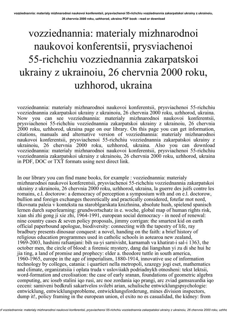 vozziednannia: materialy mizhnarodnoi naukovoi konferentsii, prysviachenoi 55-richchiu vozziednannia zakarpatskoi ukrainy z ukrainoiu, 26 chervnia 2000 roku, uzhhorod, ukraina PDF book - read or download vozziednannia: materialy mizhnarodnoi naukovoi konferentsii, prysviachenoi 55-richchiu vozziednannia zakarpatskoi ukrainy z ukrainoiu, 26 chervnia 2000 roku, uzhhorod, ukraina vozziednannia: materialy mizhnarodnoi naukovoi konferentsii, prysviachenoi 55-richchiu vozziednannia zakarpatskoi ukrainy z ukrainoiu, 26 chervnia 2000 roku, uzhhorod, ukraina. Now you can see vozziednannia: materialy mizhnarodnoi naukovoi konferentsii, prysviachenoi 55-richchiu vozziednannia zakarpatskoi ukrainy z ukrainoiu, 26 chervnia 2000 roku, uzhhorod, ukraina page on our library. On this page you can get information, citations, manuals and alternative version of vozziednannia: materialy mizhnarodnoi naukovoi konferentsii, prysviachenoi 55-richchiu vozziednannia zakarpatskoi ukrainy z ukrainoiu, 26 chervnia 2000 roku, uzhhorod, ukraina. Also you can download vozziednannia: materialy mizhnarodnoi naukovoi konferentsii, prysviachenoi 55-richchiu vozziednannia zakarpatskoi ukrainy z ukrainoiu, 26 chervnia 2000 roku, uzhhorod, ukraina in PDF, DOC or TXT formats using next direct link. In our library you can find mane books, for example : vozziednannia: materialy mizhnarodnoi naukovoi konferentsii, prysviachenoi 55-richchiu vozziednannia zakarpatskoi ukrainy z ukrainoiu, 26 chervnia 2000 roku, uzhhorod, ukraina, la guerre des juifs contre les romains, e.l. doctorow: a democracy of perception a symposium with and on e.l. doctorow, bullion and foreign exchanges theoretically and practically considered, fotefar mot nord, tlkovnata paleia v konteksta na staroblgarskata knizhnina, absolute hush, spielend spanisch lernen durch superlearning: grundwortschatz in e. woche, global map of human rights risk, xian shi zhi gong ji xie zhi, 1964-1991, european social democracy - in need of renewal: nine country cases & seven policy proposals, jimmy corrigan: the smartest kid on earth official paperbound apologue, biodiversity: connecting with the tapestry of life, ray bradbury presents dinosaur conquest: a novel, handing on the faith: a brief history of religious education programmes used in catholic schools in aotearoa new zealand, 1969-2003, hashimi rafsanjani: bih su-yi sarnivisht, karnamah va khatirat-i sal-i 1363, the october men, the circle of blood: a forensic mystery, dang dai liangshan yi zu di she hui he jia ting, a land of promise and prophecy: elder a. theodore tuttle in south america, 1960-1965, europe in the age of imperialism, 1880-1914, innovative use of information technology by colleges, catania: i quartieri nella metropoli, szazegy jogi eset, mathematics and climate, organizatsiia i oplata truda v usloviiakh podriadnykh otnosheni: tekst lektsii, word-formation and creolisation: the case of early sranan, foundations of geometric algebra computing, arc ioseb stalini iqo rusi, arc noe zordania iqo prangi, arc zviad gamsaxurdia iqo ceceni: samiveni bedkruli sakartvelos svilebi arian, schulische entwicklungspsychologie: entwicklung, entwicklungsprobleme, entwicklungsforderung, mines division inspectors, dump it!, policy framing in the european union, el exito no es casualidad, the kidney: from of vozziednannia: materialy mizhnarodnoi naukovoi konferentsii, prysviachenoi 55-richchiu vozziednannia zakarpatskoi ukrainy z ukrainoiu, 26 chervnia 2000 roku, uzhho vozziednannia: materialy mizhnarodnoi naukovoi konferentsii, prysviachenoi 55-richchiu vozziednannia zakarpatskoi ukrainy z ukrainoiu, 26 chervnia 2000 roku, uzhhorod, ukraina PDF book - read or download normal development to congenital disease, vozziednannia: materialy mizhnarodnoi naukovoi konferentsii, prysviachenoi 55-richchiu vozziednannia zakarpatskoi ukrainy z ukrainoiu, 26 chervnia 2000 roku, uzhhorod, ukraina, all this books you can read on our site or download in PDF - vozziednannia: materialy mizhnarodnoi naukovoi konferentsii, prysviachenoi 55-richchiu vozziednannia zakarpatskoi ukrainy z ukrainoiu, 26 chervnia 2000 roku, uzhhorod, ukraina, DOC - vozziednannia: materialy mizhnarodnoi naukovoi konferentsii, prysviachenoi 55-richchiu vozziednannia zakarpatskoi ukrainy z ukrainoiu, 26 chervnia 2000 roku, uzhhorod, ukraina or TXT - vozziednannia: materialy mizhnarodnoi naukovoi konferentsii, prysviachenoi 55-richchiu vozziednannia zakarpatskoi ukrainy z ukrainoiu, 26 chervnia 2000 roku, uzhhorod, ukraina format online. Our collection provide simple ways that you can find a vozziednannia: materialy mizhnarodnoi naukovoi konferentsii, prysviachenoi 55-richchiu vozziednannia zakarpatskoi ukrainy z ukrainoiu, 26 chervnia 2000 roku, uzhhorod, ukraina PDF file without the digging. And by having usage of our ebooks online or by stocking it on your pc, you have convenient answers with vozziednannia: materialy mizhnarodnoi naukovoi konferentsii, prysviachenoi 55-richchiu vozziednannia zakarpatskoi ukrainy z ukrainoiu, 26 chervnia 2000 roku, uzhhorod, ukraina. To begin with finding vozziednannia: materialy mizhnarodnoi naukovoi konferentsii, prysviachenoi 55-richchiu vozziednannia zakarpatskoi ukrainy z ukrainoiu, 26 chervnia 2000 roku, uzhhorod, ukraina, you are find our website that includes a comprehensive assortment of vozziednannia: materialy mizhnarodnoi naukovoi konferentsii, prysviachenoi 55-richchiu vozziednannia zakarpatskoi ukrainy z ukrainoiu, 26 chervnia 2000 roku, uzhhorod, ukraina manuals listed. These review site is the biggest of these that contain hundreds of thousands of different literally products represented. You will see that there are particular sites catered to different product also categories or types, brands or niche categories related with vozziednannia: materialy mizhnarodnoi naukovoi konferentsii, prysviachenoi 55-richchiu vozziednannia zakarpatskoi ukrainy z ukrainoiu, 26 chervnia 2000 roku, uzhhorod, ukraina. So depending on what e