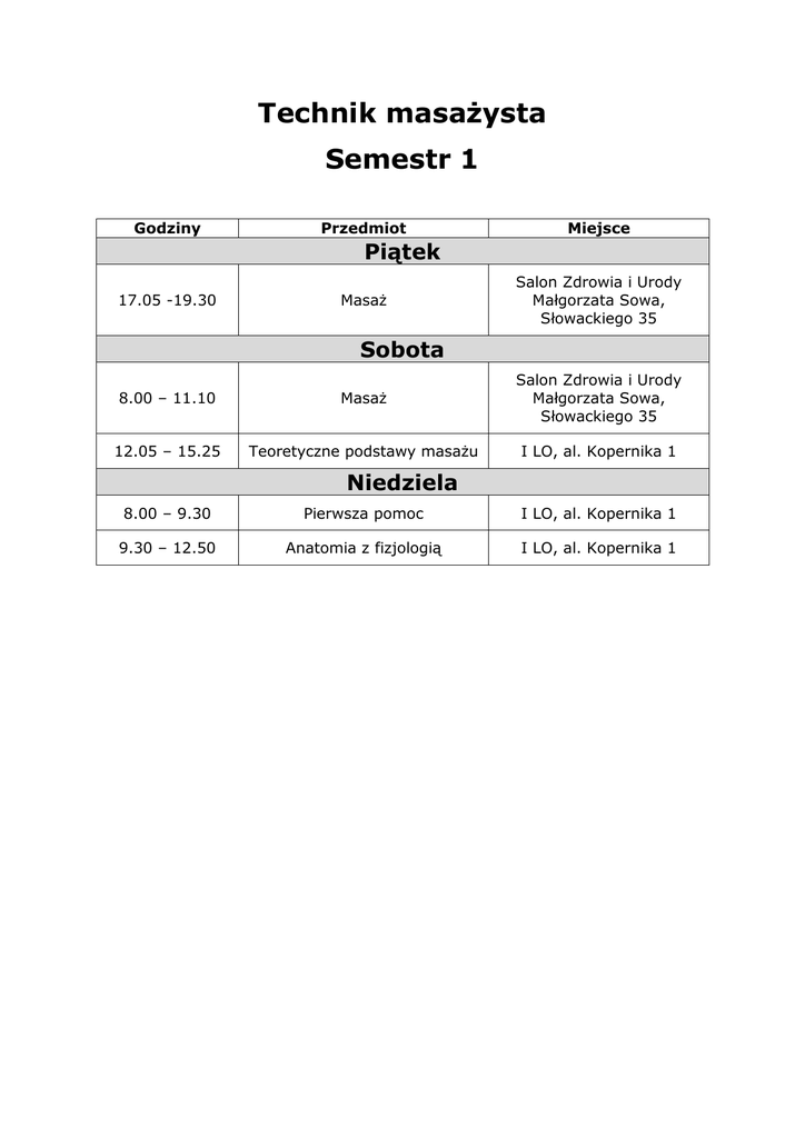 Technik masażysta Semestr 1 Godziny Przedmiot Miejsce Piątek 17.05 -19.30 Masaż Salon Zdrowia i Urody Małgorzata Sowa, Słowackiego 35 Sobota 8.00 – 11.10 Masaż Salon Zdrowia i Urody Małgorzata Sowa, Słowackiego 35 12.05 – 15.25 Teoretyczne podstawy masażu I LO, al. Kopernika 1 Niedziela 8.00 – 9.30 Pierwsza pomoc I LO, al. Kopernika 1 9.30 – 12.50 Anatomia z fizjologią I LO, al. Kopernika 1