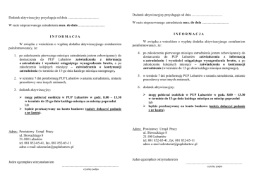 Dodatek aktywizacyjny przysługuje od dnia ..................................... W razie nieprzerwanego zatrudnienia max. do dnia ................................ W razie nieprzerwanego zatrudnienia max. do dnia ................................ INFORMACJA INFORMACJA W związku z wnioskiem o wypłatę dodatku aktywizacyjnego zostałam/em poinformowana/y, że: 1. po zakończeniu pierwszego miesiąca zatrudnienia jestem zobowiązana/y do dostarczenia do PUP Lubartów zaświadczenia z informacją o zatrudnieniu i wysokości osiągniętego wynagrodzenia brutto, a po zakończeniu kolejnych miesięcy – zaświadczenia o kontynuacji zatrudnienia (w terminie do 13-go dnia każdego miesiąca następnego), 2. w terminie 7 dni poinformuję PUP Lubartów o ustaniu zatrudnienia, zmianie pracodawcy oraz innych zmianach, 3. dodatek aktywizacyjny: mogę pobierać osobiście w PUP Lubartów w godz. 8.00 – 13.30 w terminie do 13-go dnia każdego miesiąca za miesiąc poprzedni lub będzie przekazywany na konto bankowe (należy dołączyć podanie z nr konta). W związku z wnioskiem o wypłatę dodatku aktywizacyjnego zostałam/em poinformowana/y, że: 4. po zakończeniu pierwszego miesiąca zatrudnienia jestem zobowiązana/y do dostarczenia do PUP Lubartów zaświadczenia z informacją o zatrudnieniu i wysokości osiągniętego wynagrodzenia brutto, a po zakończeniu kolejnych miesięcy – zaświadczenia o kontynuacji zatrudnienia (w terminie do 13-go dnia każdego miesiąca następnego), 5. w terminie 7 dni poinformuję PUP Lubartów o ustaniu zatrudnienia, zmianie pracodawcy oraz innych zmianach, 6. dodatek aktywizacyjny: mogę pobierać osobiście w PUP Lubartów w godz. 8.00 – 13.30 w terminie do 13-go dnia każdego miesiąca za miesiąc poprzedni lub będzie przekazywany na konto bankowe (należy dołączyć podanie z nr konta). Adres: Powiatowy Urząd Pracy ul. Słowackiego 8 21-100 Lubartów tel. 081 852-65-41, fax. 081 852-65-11 adres e-mail [email protected] Adres: Powiatowy Urząd Pracy ul. Słowackiego 8 21-100 Lubartów tel. 081 852-65-41, fax. 081 852-65-11 adres e-mail [email protected] Jeden egzemplarz otrzymałam/em Dodatek aktywizacyjny przysługuje od dnia ..................................... .................................................................... czytelny podpis Jeden egzemplarz otrzymałam/em .................................................................... czytelny podpis