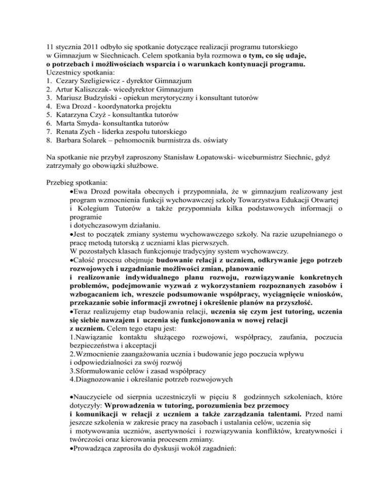 11 stycznia 2011 odbyło się spotkanie dotyczące realizacji programu tutorskiego w Gimnazjum w Siechnicach. Celem spotkania była rozmowa o tym, co się udaje, o potrzebach i możliwościach wsparcia i o warunkach kontynuacji programu. Uczestnicy spotkania: 1. Cezary Szeligiewicz - dyrektor Gimnazjum 2. Artur Kaliszczak- wicedyrektor Gimnazjum 3. Mariusz Budzyński - opiekun merytoryczny i konsultant tutorów 4. Ewa Drozd - koordynatorka projektu 5. Katarzyna Czyż - konsultantka tutorów 6. Marta Smyda- konsultantka tutorów 7. Renata Zych - liderka zespołu tutorskiego 8. Barbara Solarek – pełnomocnik burmistrza ds. oświaty Na spotkanie nie przybył zaproszony Stanisław Łopatowski- wiceburmistrz Siechnic, gdyż zatrzymały go obowiązki służbowe. Przebieg spotkania: Ewa Drozd powitała obecnych i przypomniała, że w gimnazjum realizowany jest program wzmocnienia funkcji wychowawczej szkoły Towarzystwa Edukacji Otwartej i Kolegium Tutorów a także przypomniała kilka podstawowych informacji o programie i dotychczasowym działaniu. Jest to początek zmiany systemu wychowawczego szkoły. Na razie uzupełnianego o pracę metodą tutorską z uczniami klas pierwszych. W pozostałych klasach funkcjonuje tradycyjny system wychowawczy. Całość procesu obejmuje budowanie relacji z uczniem, odkrywanie jego potrzeb rozwojowych i uzgadnianie możliwości zmian, planowanie i realizowanie indywidualnego planu rozwoju, rozwiązywanie konkretnych problemów, podejmowanie wyzwań z wykorzystaniem rozpoznanych zasobów i wzbogacaniem ich, wreszcie podsumowanie współpracy, wyciągnięcie wniosków, przekazanie sobie informacji zwrotnej i określenie planów na przyszłość. Teraz realizujemy etap budowania relacji, uczenia się czym jest tutoring, uczenia się siebie nawzajem i uczenia się funkcjonowania w nowej relacji z uczniem. Celem tego etapu jest: 1.Nawiązanie kontaktu służącego rozwojowi, współpracy, zaufania, poczucia bezpieczeństwa i akceptacji 2.Wzmocnienie zaangażowania ucznia i budowanie jego poczucia wpływu i odpowiedzialności za swój rozwój 3.Sformułowanie celów i zasad współpracy 4.Diagnozowanie i określanie potrzeb rozwojowych Nauczyciele od sierpnia uczestniczyli w pięciu 8 godzinnych szkoleniach, które dotyczyły: Wprowadzenia w tutoring, porozumienia bez przemocy i komunikacji w relacji z uczniem a także zarządzania talentami. Przed nami jeszcze szkolenia w zakresie pracy na zasobach i ustalania celów, uczenia się i motywowania uczniów, asertywności i rozwiązywania konfliktów, kreatywności i twórczości oraz kierowania procesem zmiany. Prowadząca zaprosiła do dyskusji wokół zagadnień: Jaka jest dynamika procesu (jak często udaje się spotykać z uczniami, w jakim czasie, sporadycznie, systematycznie, w określonym czasie, tutorzy i uczniowie nie mogą się rozstać…… Jaki jest klimat spotkań i wokół projektu (co myślą, mówią uczniowie, nauczyciele… może rodzice) Co buduje i wzmacnia relacje tutorskie, co daje nam satysfakcję, co uznajemy za sukces,(jakie działania, sytuacje, emocje, odkrycia….. Co osłabia proces, przeszkadza, utrudnia – co warto przedyskutować, zmienić, zmodyfikować- jakiego wsparcia i kto może udzielić w realizacji podejmowanych działań. Refleksje dotyczące realizacji programu: Atutem jest wprowadzenie metody we wszystkich klasach pierwszych, co dało szansę na wzmocnienie poczucia bezpieczeństwa uczniów w nowej szkole, w nowych warunkach uczenia się i pomoc w procesie adaptacji (pedagodzy zgłaszali problem niedojrzałości emocjonalnej uczniów z rocznika 1997- rocznik powodziowy). Dla uczniów klas pierwszych tuto ring jest naturalnie związany z „wejściem” do gimnazjum. Uczniowie często zgłaszają się z prośbą o pomoc zarówno do tutora jak i do wychowawcy. Tutorzy uczestniczyli w spotkaniach z rodzicami. Wartością docenianą przez tutorów i podopiecznych jest odejście od przymusu. W spotkaniach tutorskich uczestniczy około 80% uczniów (trudniej chłopcom przekonać się do nich). Na razie spotkania odbywają się jeszcze w grupach, czasem w parach i indywidualnie. Uczniowie mają potrzebę rozmowy, dopominają się o kontakt z tutorem (choroba nauczyciela- co się stało?) , czasem zostają w szkole dłużej niż przewidziany czas spotkania. Nauczyciele doceniają możliwość bliższego kontaktu z uczniami. Uczniowie chętnie prezentują i wciągają nauczycieli w „swój świat” . Nauczyciele częściej posługują się słowami „moi uczniowie”. Zespół nauczycieli-tutorów bardzo się zintegrował, do czego przyczynia się prowadzenie parami jednej klasy (w jednej sytuacji w trójkę) i często bieżące omawianie spraw uczniowskich a także współpraca i lepsze poznawanie się podczas szkoleń. Zmniejszyła się potrzeba zainteresowania pedagoga szkolnego wieloma uczniami (zastępuje je kontakt z tutorem). Zauważane i sygnalizowane przez specjalistów jest inne (od dawna sugerowane) podejście do uczniów (faktycznie a nie deklaratywnie podmiotowe). W szkole obserwuje się dobry klimat wokół tutoringu. Nauczyciele obserwują i doceniają zmiany zachowań i postaw uczniów (lepiej się z nimi pracuje..). Zgłaszane problemy tutorzy zgłaszają problemy z organizacją czasu na spotkania- trudność ze zgraniem czasu ucznia i nauczyciela, konieczność dojazdu do domu po lekcjach – godziny przyjazdu gimbusów, niewielka ilość wolnego czasu uczniów z powodu udziału uczniów w dodatkowych zajęciach itp. Rekomendacje dla tutorów Systematycznie, w różnorodny sposób zachęcać uczniów do spotkań indywidualnych. Wzmacniać rangę spotkania mistrz-uczeń w kontekście wymiany doświadczeń i wspólnego uczenia się. Rozpatrzyć możliwość zmiany organizacji pracy szkoły (dodatkowej godziny tutorskiej) lub zaproponować i zadbać o uzyskanie zgody nauczycieli na spotkania z uczniami podczas niektórych lekcji. Stopniowo przygotowywać się do