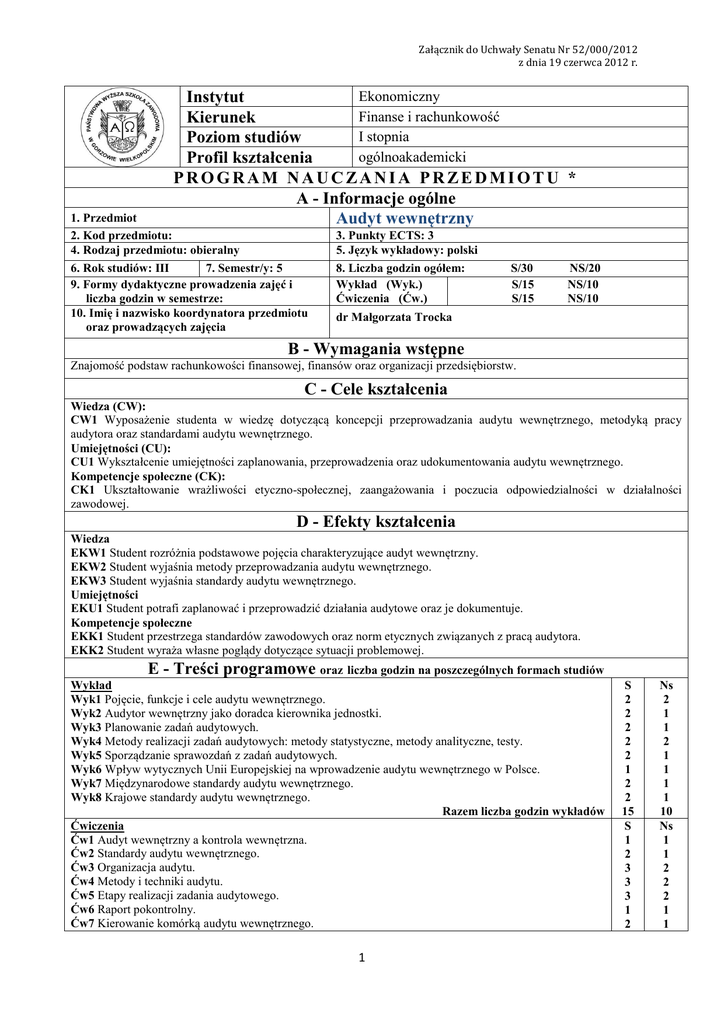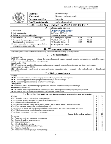 Załącznik do Uchwały Senatu Nr 52/000/2012 z dnia 19 czerwca 2012 r. Ekonomiczny Instytut Finanse i rachunkowość Kierunek I stopnia Poziom studiów ogólnoakademicki Profil kształcenia PROGRAM NAUCZANIA PRZEDMIOTU * A - Informacje ogólne Audyt wewnętrzny 1. Przedmiot 2. Kod przedmiotu: 4. Rodzaj przedmiotu: obieralny 6. Rok studiów: III 7. Semestr/y: 5 9. Formy dydaktyczne prowadzenia zajęć i liczba godzin w semestrze: 10. Imię i nazwisko koordynatora przedmiotu oraz prowadzących zajęcia 3. Punkty ECTS: 3 5. Język wykładowy: polski 8. Liczba godzin ogółem: Wykład (Wyk.) Ćwiczenia (Ćw.) S/30 S/15 S/15 NS/20 NS/10 NS/10 dr Małgorzata Trocka B - Wymagania wstępne Znajomość podstaw rachunkowości finansowej, finansów oraz organizacji przedsiębiorstw. C - Cele kształcenia Wiedza (CW): CW1 Wyposażenie studenta w wiedzę dotyczącą koncepcji przeprowadzania audytu wewnętrznego, metodyką pracy audytora oraz standardami audytu wewnętrznego. Umiejętności (CU): CU1 Wykształcenie umiejętności zaplanowania, przeprowadzenia oraz udokumentowania audytu wewnętrznego. Kompetencje społeczne (CK): CK1 Ukształtowanie wrażliwości etyczno-społecznej, zaangażowania i poczucia odpowiedzialności w działalności zawodowej. D - Efekty kształcenia Wiedza EKW1 Student rozróżnia podstawowe pojęcia charakteryzujące audyt wewnętrzny. EKW2 Student wyjaśnia metody przeprowadzania audytu wewnętrznego. EKW3 Student wyjaśnia standardy audytu wewnętrznego. Umiejętności EKU1 Student potrafi zaplanować i przeprowadzić działania audytowe oraz je dokumentuje. Kompetencje społeczne EKK1 Student przestrzega standardów zawodowych oraz norm etycznych związanych z pracą audytora. EKK2 Student wyraża własne poglądy dotyczące sytuacji problemowej. E - Treści programowe oraz liczba godzin na poszczególnych formach studiów Wykład Wyk1 Pojęcie, funkcje i cele audytu wewnętrznego. Wyk2 Audytor wewnętrzny jako doradca kierownika jednostki. Wyk3 Planowanie zadań audytowych. Wyk4 Metody realizacji zadań audytowych: metody statystyczne, metody analityczne, testy. Wyk5 Sporządzanie sprawozdań z zadań audytowych. Wyk6 Wpływ wytycznych Unii Europejskiej na wprowadzenie audytu wewnętrznego w Polsce. Wyk7 Międzynarodowe standardy audytu wewnętrznego. Wyk8 Krajowe standardy audytu wewnętrznego. Razem liczba godzin wykładów Ćwiczenia Ćw1 Audyt wewnętrzny a kontrola wewnętrzna. Ćw2 Standardy audytu wewnętrznego. Ćw3 Organizacja audytu. Ćw4 Metody i techniki audytu. Ćw5 Etapy realizacji zadania audytowego. Ćw6 Raport pokontrolny. Ćw7 Kierowanie komórką audytu wewnętrznego. 1 S 2 2 2 2 2 1 2 2 15 S 1 2 3 3 3 1 2 Ns 2 1 1 2 1 1 1 1 10 Ns 1 1 2 2 2 1 1 Załącznik do Uchwały Senatu Nr 52/000/2012 z dnia 19 czerwca 2012 r. Razem liczba godzin ćwiczeń Ogółem liczba godzin przedmiotu: 15 30 10 20 F – Metody nauczania oraz środki dydaktyczne Wykład problemowy z prezentacjami multimedialnymi, case study, praca własna z zalecaną literaturą. G - Metody oceniania F – formująca F1 – sprawdzian pisemny z wiedzy i umiejętności, F2 – obserwacja podczas zajęć, aktywność. Forma zaliczenia przedmiotu: zaliczenie z oceną P– podsumowująca P1 – zaliczenie pisemne w formie testu, P2 – projekt przeprowadzenia audytu. H - Literatura przedmiotu Literatura obowiązkowa: 1. Czerwiński K.: Audyt wewnętrzny, InfoAudit, Warszawa 2005. 2. Winiarska K.: Teoretyczne i praktyczne aspekty audytu wewnętrznego, Difin, Warszawa 2005. Literatura zalecana / fakultatywna: 1. Kuc B.R.: Audyt wewnętrzny. Teoria i praktyka, Wydawnictwo menedŜerskie PTM, Warszawa 2002. 2. Knedler K., Stasik M.: Audyt wewnętrzny w praktyce, Polska Akademia Rachunkowości, Łódź 2005. 3. Międzynarodowe Standardy Profesjonalnej Praktyki Audytu Wewnętrznego 2001 r. Tłum, II A – Polska, Warszawa 2001. 4. Piaszczyk A.: Audyt wewnętrzny, Stowarzyszenie Księgowych w Polsce, Warszawa 2004. I – Informacje dodatkowe Imię i nazwisko sporządzającego Data sporządzenia / aktualizacji Dane kontaktowe (e-mail, telefon) Podpis dr Małgorzata Trocka 14/06/2012 [email protected] 2 Załącznik do Uchwały Senatu Nr 52/000/2012 z dnia 19 czerwca 2012 r. Tabele sprawdzające program nauczania przedmiotu audyt wewnętrzny na kierunku finanse i rachunkowość Tabela 1. Sprawdzenie, czy metody oceniania gwarantują określenie zakresu, w jakim uczący się osiągnął zakładane kompetencje – powiązanie efektów kształcenia, metod uczenia się i oceniania: Efekty kształcenia EKW1 EKW2 EKW3 EKU1 EKK1 EKK2 Sprawdzian pisemny z wiedzy i umiejętności (F1) X X X Metoda oceniania Obserwacja Zaliczenie podczas pisemne w zajęć, formie testu aktywność (P1) (F2) X X X X X X X X X Projekt przeprowadze nia audytu (P2) X X X Tabela 2. Obciążenie pracą studenta: Forma aktywności studenta Godziny zajęć z nauczycielem/ami Czytanie literatury Przygotowanie projektu Przygotowanie do sprawdzianu Przygotowanie do zaliczenia Liczba punktów ECTS dla przedmiotu Średnia liczba godzin na realizację studia stacjonarne studia niestacjonarne 30 20 10 20 15 15 5 5 15 15 75godz./25godz. = 3 pkt. ECTS Sporządził: Data: 14/06/2012 Podpis………………………. 3 Załącznik do Uchwały Senatu Nr 52/000/2012 z dnia 19 czerwca 2012 r. Tabela 3. Powiązanie celów i efektów kształcenia przedmiotu audyt wewnętrzny treści programowych, metod i form dydaktycznych z celami i efektami zdefiniowanymi dla kierunku finanse i rachunkowość Cele przedmiotu (C) Odniesienie danego celu do celów zdefiniowanych dla całego programu Treści programowe (E) Metody dydaktyczne (F) Formy dydaktyczne prowadzenia zajęć (A9) Efekt kształcenia (D) wiedza CW1 CW1, CW2 Wykłady: 1, 2, 3, 4, 5, 6, 7, 8 Ćwiczenia: 1, 2, 7 Wykład problemowy z prezentacjami multimedialnymi, case study, praca własna z zalecaną literaturą. Wykłady, ćwiczenia EKW1 EKW2 EKW3 umiejętności CU1 CU1, CU2 Wykłady: 3, 4, 5 Ćwic
