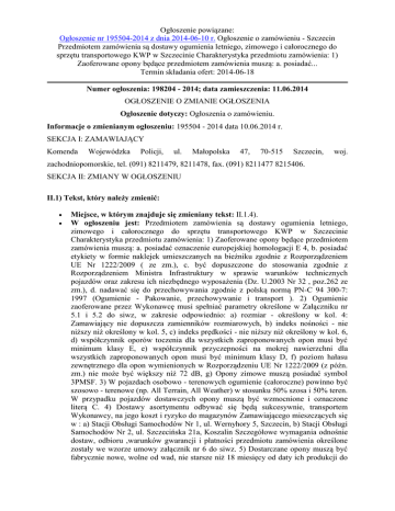 Ogłoszenie powiązane: Ogłoszenie nr 195504-2014 z dnia 2014-06-10 r. Ogłoszenie o zamówieniu - Szczecin Przedmiotem zamówienia są dostawy ogumienia letniego, zimowego i całorocznego do sprzętu transportowego KWP w Szczecinie Charakterystyka przedmiotu zamówienia: 1) Zaoferowane opony będące przedmiotem zamówienia muszą: a. posiadać... Termin składania ofert: 2014-06-18 Numer ogłoszenia: 198204 - 2014; data zamieszczenia: 11.06.2014 OGŁOSZENIE O ZMIANIE OGŁOSZENIA Ogłoszenie dotyczy: Ogłoszenia o zamówieniu. Informacje o zmienianym ogłoszeniu: 195504 - 2014 data 10.06.2014 r. SEKCJA I: ZAMAWIAJĄCY Komenda Wojewódzka Policji, ul. Małopolska 47, 70-515 Szczecin, woj. zachodniopomorskie, tel. (091) 8211479, 8211478, fax. (091) 8211477 8215406. SEKCJA II: ZMIANY W OGŁOSZENIU II.1) Tekst, który należy zmienić: Miejsce, w którym znajduje się zmieniany tekst: II.1.4). W ogłoszeniu jest: Przedmiotem zamówienia są dostawy ogumienia letniego, zimowego i całorocznego do sprzętu transportowego KWP w Szczecinie Charakterystyka przedmiotu zamówienia: 1) Zaoferowane opony będące przedmiotem zamówienia muszą: a. posiadać oznaczenie europejskiej homologacji E 4, b. posiadać etykiety w formie naklejek umieszczanych na bieżniku zgodnie z Rozporządzeniem UE Nr 1222/2009 ( ze zm.), c. być dopuszczone do stosowania zgodnie z Rozporządzeniem Ministra Infrastruktury w sprawie warunków technicznych pojazdów oraz zakresu ich niezbędnego wyposażenia (Dz. U.2003 Nr 32 , poz.262 ze zm.), d. nadawać się do przechowywania zgodnie z polską normą PN-C 94 300-7: 1997 (Ogumienie - Pakowanie, przechowywanie i transport ). 2) Ogumienie zaoferowane przez Wykonawcę musi spełniać parametry określone w Załączniku nr 5.1 i 5.2 do siwz, w zakresie odpowiednio: a) rozmiar - określony w kol. 4: Zamawiający nie dopuszcza zamienników rozmiarowych, b) indeks nośności - nie niższy niż określony w kol. 5, c) indeks prędkości - nie niższy niż określony w kol. 6, d) współczynnik oporów toczenia dla wszystkich zaproponowanych opon musi być minimum klasy E, e) współczynnik przyczepności na mokrej nawierzchni dla wszystkich zaproponowanych opon musi być minimum klasy D, f) poziom hałasu zewnętrznego dla opon wymienionych w Rozporządzeniu UE Nr 1222/2009 (z późn. zm.) nie może być większy niż 72 dB, g) Opony zimowe muszą posiadać symbol 3PMSF. 3) W pojazdach osobowo - terenowych ogumienie (całoroczne) powinno być szosowo - terenowe (np. All Terrain, All Weather) w stosunku 50% szosa i 50% teren. W przypadku pojazdów dostawczych opony muszą być wzmocnione i oznaczone literą C. 4) Dostawy asortymentu odbywać się będą sukcesywnie, transportem Wykonawcy, na jego koszt i ryzyko do magazynów Zamawiającego mieszczących się w : a) Stacji Obsługi Samochodów Nr 1, ul. Wernyhory 5, Szczecin, b) Stacji Obsługi Samochodów Nr 2, ul. Szczecińska 21a, Koszalin Szczegółowe wymagania odnośnie dostaw, odbioru ,warunków gwarancji i płatności przedmiotu zamówienia określone zostały we wzorze umowy załącznik nr 6 do siwz. 5) Dostarczane opony muszą być fabrycznie nowe, wolne od wad, nie starsze niż 18 miesięcy od daty ich produkcji do momentu każdej dostawy lub wymiany. 6) Zaoferowane ogumienie musi posiadać świadectwo homologacji, odpowiednio do typu opony wydane zgodnie z: a) Regulaminem nr 30.02 EKG ONZ ( ze zm.) - ogumienie do pojazdów osobowych, b) Regulaminem nr 54.00 EKG ONZ ( ze zm.) - ogumienie do pojazdów ciężarowych i przyczep, c) Regulaminem nr 75.00 EKG ONZ ( ze zm.) - ogumienie do motocykli i motorowerów, d) Regulaminem nr 117.00 EKG ONZ ( ze zm.) - homologacja ogumienia w odniesieniu do emisji hałasu toczenia i przyczepności na mokrych nawierzchniach lub oporu toczenia. W ogłoszeniu powinno być: Przedmiotem zamówienia są dostawy ogumienia letniego, zimowego i całorocznego do sprzętu transportowego KWP w Szczecinie Charakterystyka przedmiotu zamówienia: 1) Zaoferowane opony będące przedmiotem zamówienia muszą: a. posiadać oznaczenie europejskiej homologacji E 4, b. posiadać etykiety w formie naklejek umieszczanych na bieżniku zgodnie z Rozporządzeniem UE Nr 1222/2009 ( ze zm.), c. być dopuszczone do stosowania zgodnie z Rozporządzeniem Ministra Infrastruktury w sprawie warunków technicznych pojazdów oraz zakresu ich niezbędnego wyposażenia / Dz. U.2003 Nr 32 , poz.262 ze zm./, d. nadawać się do przechowywania zgodnie z polską normą PN-C 94 300-7 : 1997 / Ogumienie - Pakowanie, przechowywanie i transport /. 2) Ogumienie zaoferowane przez Wykonawcę musi spełniać parametry określone w Załączniku nr 5.1 i 5.2 do siwz, w zakresie odpowiednio: a)rozmiar - określony w kol. 4: Zamawiający nie dopuszcza zamienników rozmiarowych, b) indeks nośności - nie niższy niż określony w kol. 5, c) indeks prędkości - nie niższy niż określony w kol. 6, d) współczynnik oporów toczenia - nie niższy niż określony w kol 7, e) współczynnik przyczepności na mokrej nawierzchni - nie niższy niż określony w kolumnie 8, f) poziom hałasu zewnętrznego nie wyższy niż określony w kol.9, g) Opony zimowe muszą posiadać symbol 3PMSF. 3) W pojazdach osobowo - terenowych ogumienie (całoroczne) powinno być szosowo - terenowe (np. All Terrain, All Weather) w stosunku 50% szosa i 50% teren. W przypadku pojazdów dostawczych opony muszą być wzmocnione i oznaczone literą C. 4) Dostawy asortymentu odbywać się będą sukcesywnie, transportem Wykonawcy, na jego koszt i ryzyko do magazynów Zamawiającego mieszczących się w : a) Stacji Obsługi Samochodów Nr 1, ul. Wernyhory 5, Szczecin, b) Stacji Obsługi Samochodów Nr 2, ul. Szczecińska 21a, Koszalin Szczegółowe wymagania odnośnie dostaw, odbioru ,warunków gwarancji i płatności przedmiotu zamówienia określone zostały we wzorze umowy załącznik nr 6 do siwz. 5) Dostarczane opony muszą być fabrycznie nowe, wolne od wad, nie stars