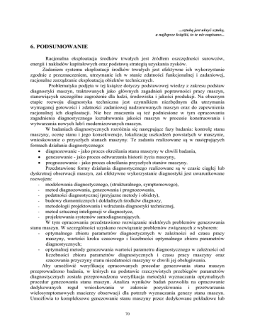 ...sztuką jest ukryć sztukę, a najlepsze książki, to te nie napisane... 6. PODSUMOWANIE Racjonalna eksploatacja środków trwałych jest źródłem oszczędności surowców, energii i nakładów kapitałowych oraz podstawą strategią uzyskania zysków. Zadaniem systemu eksploatacji środków trwałych jest efektywne ich wykorzystanie zgodnie z przeznaczeniem, utrzymanie ich w stanie zdatności funkcjonalnej i zadaniowej, racjonalne zarządzanie eksploatacją obiektów technicznych. Problematyka podjęta w tej książce dotyczy podstawowej wiedzy z zakresu podstaw diagnostyki maszyn, traktowanych jako głównych zagadnień poprawności pracy maszyn, stanowiących szczególne zagrożenie dla ludzi, środowiska i jakości produkcji. Na obecnym etapie rozwoju diagnostyka techniczna jest czynnikiem niezbędnym dla utrzymania wymaganej gotowości i zdatności zadaniowej nadzorowanych maszyn oraz do zapewnienia racjonalnej ich eksploatacji. Nie bez znaczenia są też podniesione w tym opracowaniu zagadnienia diagnostycznego kształtowania jakości maszyn w procesie konstruowania i wytwarzania nowych lub/i modernizowanych maszyn. W badaniach diagnostycznych rozróżnia się następujące fazy badania: kontrolę stanu maszyny, ocenę stanu i jego konsekwencje, lokalizację uszkodzeń powstałych w maszynie, wnioskowanie o przyszłych stanach maszyny. Te zadania realizowane są w następujących formach działania diagnostycznego: diagnozowanie - jako proces określania stanu maszyny w chwili badania, genezowanie - jako proces odtwarzania historii życia maszyny, prognozowanie - jako proces określania przyszłych stanów maszyny. Przedstawione formy działania diagnostycznego realizowane są w czasie ciągłej lub dyskretnej obserwacji maszyn, zaś efektywne wykorzystanie diagnostyki jest uwarunkowane rozwojem: - modelowania diagnostycznego, (strukturalnego, symptomowego), - metod diagnozowania, genezowania i prognozowania, - podatności diagnostycznej (przyjazne metody i obiekty), - budowy ekonomicznych i dokładnych środków diagnozy, - metodologii projektowania i wdrażania diagnostyki technicznej, - metod sztucznej inteligencji w diagnostyce, - projektowania systemów samodiagnozujących. W tym opracowaniu przedstawiono rozwiązanie niektórych problemów genezowania stanu maszyn. W szczególności uzyskano rozwiązanie problemów związanych z wyborem: - optymalnego zbioru parametrów diagnostycznych w zależności od czasu pracy maszyny, wartości kroku czasowego i liczebności optymalnego zbioru parametrów diagnostycznych; - optymalnej metody genezowania wartości parametru diagnostycznego w zależności od liczebności zbioru parametrów diagnostycznych i czasu pracy maszyny oraz szacowania przyczyny stanu niezdatności maszyny w chwili jej obsługiwania. Aby umożliwić weryfikację opracowanych procedur genezowania stanu maszyn przeprowadzono badania, w których na podstawie rzeczywistych przebiegów parametrów diagnostycznych została przeprowadzona weryfikacja metodyki wyznaczania optymalnych procedur genezowania stanu maszyn. Analiza wyników badań pozwoliła na opracowanie dedykowanych reguł wnioskowania w zakresie pozyskiwania i przetwarzania wielosymptomowych macierzy obserwacji dla potrzeb wyznaczania genezy stanu maszyn. Umożliwia to kompleksowe genezowanie stanu maszyny przez dedykowane pokładowe lub 70 stacjonarne systemy diagnostyczne, których podstawowym narzędziem są reguły wnioskowania diagnostycznego, opracowane na podstawie analizy wyników badań metodyki. Na podstawie przedstawionych powyżej działań oraz merytorycznych wniosków szczegółowych, uzyskanych na podstawie wyników badań i zamieszczonych w opracowaniu, można sformułować następujące wnioski końcowe: 1. Narzędziem sterowania utrzymaniem maszyn w stanie zdatności funkcjonalnej i zadaniowej jest system rozpoznawania stanu maszyny jako istotny element systemu działania w zakresie podsystemu użytkowania i obsługiwania maszyn. 2. Genezowanie stanu maszyny jest to proces, który powinien umożliwić przewidywanie stanu maszyny w czasie przeszłym na podstawie niepełnej historii wyników badań diagnostycznych, co umożliwia oszacowanie stanu maszyny w przeszłości i określenie przyczyny wystąpienia uszkodzenia stwierdzonego podczas oceny stanu. 3. System genezowania stanu maszyn powinien spełniać oddzielnie lub łącznie następujące funkcje na podstawie genezowania wartości parametrów diagnostycznych określenie przyczyny stanu niezdatności maszyny. 4. W celu realizacji powyższych funkcji wyznaczono, za pomocą metody optymalizacji wielokryterialnej, zbiory parametrów diagnostycznych, które: a) jednoznacznie opisują stan maszyny; b) są skorelowane ze zmianą stanu maszyny w czasie jej eksploatacji; c) posiadają maksymalną ilość informacji o stanie maszyny. 5. W celu ich wyznaczenia zbadano zbiory parametrów diagnostycznych opisujących stan techniczny zespołów i układów maszyn w aspekcie możliwości ich wykorzystania w procesie genezowania stanu poprzez: a) opracowanie metod klasyfikowania parametrów diagnostycznych do określonego modelu matematycznego (funkcji) opisującej zmianę ich wartości; b) opracowanie metody wyboru optymalnego zbioru parametrów diagnostycznych. 6. W celu określenia przyczyny stanu niezdatności maszyny w chwili jej badania: a) określono optymalną metodę wyznaczania wartości genezowanej parametru diagnostycznego według funkcji błędu genezy; b) określono metodę szacowania stanu niezdatności maszyny w przeszłości; c) zbadano wrażliwość genezy stanu maszyn na czynniki eksploatacyjne poprzez: - wybór optymalnego zbioru parametrów diagnostycznych, - wybór optymalnej metody genezowania wartości genezowanej parametru diagnostycznego według przyjętych kryteriów, - badania wpływu wartości horyzontu genezy na wartości genezowaną parametru diagnostycznego, - wybór optymalnej metody szacowania przyczyny stanu nie