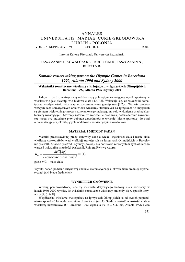ANNALES UNIVERSITATIS MARIAE CURIE-SKŁODOWSKA LUBLIN - POLONIA VOL.LIX, SUPPL. XIV, 159 SECTIO D 2004 Instytut Kultury Fizycznej, Uniwersytet Szczeciński JASZCZANIN J., KOWALCZYK R., KRUPECKI K., JASZCZANIN N., BURYTA R. Somatic rowers taking part on the Olympic Games in Barcelona 1992, Atlanta 1996 and Sydney 2000 Wskaźniki somatyczne wioślarzy startujących w Igrzyskach Olimpijskich Barcelona 1992, Atlanta 1996 i Sydney 2000 Jednym z bardzo ważnych czynników mających wpływ na osiągany wynik sportowy w wioślarstwie jest niewątpliwie budowa ciała [4,6,7,8]. Wskazuje się, że wskaźniki somatyczne wiodące wśród wioślarzy są zdeterminowane genetycznie [1,2,9]. Wartości podstawowych cech somatycznych oraz wieku wioślarzy startujących na Igrzyskach Olimpijskich są efektem wieloletniego procesu szkoleniowego mającego na celu wyłonienie osad najskuteczniej wiosłujących. Możemy założyć, że wartości te oraz wiek, doświadczenie zawodnicze mogą być przydatne przy doborze zawodników o wysokiej klasie sportowej do osad reprezentacyjnych, określających modelowe charakterystyki zawodników. MATERIAŁ I METODY BADAŃ Materiał przedstawionej pracy stanowiły dane o wieku, wysokości ciała i masie ciała wioślarzy (zawodników wagi ciężkiej) startujących na Igrzyskach Olimpijskich w Barcelonie (n=368), Atlancie (n=285) i Sydney (n=261). Na podstawie zebranych danych obliczono wartość wskaźnika smukłości (wskaźnik Rohrera Rw) wg wzoru: Rw = MC [kg ] ∗ 100; ( wysokosc ciala [cm])3 gdzie MC – masa ciała Wyniki badań poddano rutynowej analizie matematycznej z określeniem średniej arytmetycznej (x) i błędu średniej (s). WYNIKI I ICH OMÓWIENIE Według przeprowadzonej analizy materiału dotyczącego budowy ciała wioślarzy w latach 1960-2000 wynika, że wskaźniki somatyczne wioślarzy zmieniły się w sposób oczywisty [4, 5, 6, 8]. Współcześni wioślarze występujący na Igrzyskach Olimpijskich są od swoich poprzedników sprzed 40 lat wyżsi średnio o około 9 cm (ryc.1). Średnia wartość wysokości ciała u wioślarzy uczestników IO Barcelona 1992 wynosiła 191,6 ± 5,47 cm, Atlanta 1996 nieco 351 niższą i osiągnęła wartość 190,4 ± 5,14 cm. Natomiast na IO Sydney 2000, była nieco wyższa i wyniosła 192,8 ± 5,47 cm. We wszystkich przypadkach zróżnicowania nie są znaczące (p>0,05). Zmiany dotyczą masy ciała wioślarzy, gdzie średnia wartość wzrosła o ponad 1 kg. Na IO w Barcelonie średnia masa ciała wioślarzy wynosiła 89,95 ± 6,38 kg, na IO w Atlancie 91,3 ± 5,77 kg, natomiast na IO w Sydney średni wskaźnik ten osiągnął wartość 91,2 ± 6,97 kg (tab.1) (zróżnicowanie nieistotne p>0,05). Warto zauważyć, że w przeciągu zaledwie 8 lat, od Igrzysk Olimpijskich Barcelona 1992 do Igrzysk Olimpijskich Sydney 2000 średnia masa ciała wioślarzy wzrosła o 1,25 kg (p>0,05). Z dokonanej analizy wynika natomiast, że wskaźnik smukłości (Rw) pozostał w ciągu tego całego okresu na podobnym poziomie, dostrzec jednak można, że najniższą wartość spośród trzech ostatnich Igrzysk Olimpijskich odnotowano zawodnikom IO w Sydney (1,271). Należy odnotować, że systematycznie na kolejnych Igrzyskach Olimpijskich rośnie średnia wartość wieku zawodników startujących w wioślarstwie. W Barcelonie średnia wieku wioślarzy wynosiła 25,7 ± 3,95 lat, w Atlancie 26,1 ± 4,58 lat, natomiast w Sydney 26,4 ± 3,94. Wydaje się, że wskazywać to może tylko na to, jak ważną rolę w wioślarstwie odgrywa wiek zawodnika, który wiąże się bezpośrednio ze stażem treningowym, a tym samym z doświadczeniem zawodniczym. Pośrednio także może świadczyć o optymalizacji procesu treningowego w tym treści i metod odnowy powysiłkowej. Można sugerować, że wioślarze w wymienionym okresie wiekowym prezentują najbardziej wysoki poziom sprawności psychofizycznej PODSUMOWANIE Przedstawione w pracy wyniki są pochodną cech somatycznych elity wioślarskiej spotykającej się, co 4 lata, na Igrzyskach Olimpijskich. Można założyć, że wskaźniki somatyczne funkcjonalne oraz wiek wioślarzy, biorących udział w IO uwzględnia elity wioślarskie bardzo zbliżone do charakterystyk modelowych [3,4,5,6,8]. W warunkach regat wioślarskich, nawet nieznaczne różnice w poziomie w/w wskaźników mogą być znaczące w ostatecznej klasyfikacji. Dowodzi to tego, że przy selekcji zawodników należałoby uwzględnić modelowe charakterystyki cech somatycznych wioślarzy startujących na Igrzyskach Olimpijskich oraz odznaczające się tendencje tzn., że wskaźnik wysokości ciała wioślarzy ma ciągłą tendencję wzrostową. Podobna dynamika jest określana we wskaźnikach masy ciała i wieku zawodników. WNIOSKI Wartości wskaźników wysokości, masy ciała wioślarzy uczestników IO w okresie 1992-2000 mają tendencje wzrostowe. Podczas trzech ostatnich IO (Barcelona 1992, Atlanta 1996, Sydney 2000) wskaźnik wieku wioślarzy wzrósł o 0,7 lat. Wartości średnie wskaźnika smukłości na IO w okresie 1992-2000 pozostaje na zbliżonym poziomie. Wskaźniki somatyczne i wiek olimpijczyków mogą posłużyć jako jedno z kryteriów doboru wioślarzy do kadry narodowej. 352 LITERATURA 1. 2. 3. 4. 5. 6. 7. 8. 9. Blacha L.: An attempt at the development of a top rower model with a view to anthropometric parameters. II-nd Anthropological Congress of Ales Hrdlicka. Universitas Carolina Pragensis, 1982. Garay A. A., Levine L., Lindsay I. E.: Genetic and anthropological studies of olimpic athletes. New York – San Francisco – London, Academic Press, 1974. Henning M., Krupecki K. I wsp.: Wioślarstwo. PZTW, Warszawa 2003, s. 23-26. Jaszczanin J., Krupecki K.: Wpływ podstawowych cech somatycznych wioślarzy na osiągnięty wynik sportowy, na podstawie danych uczestników Igrzysk Olimpijskich w Atlancie 1996 r., Vilnius 1997, s. 27-29. Krupecki K.: Charakterystyka somatyczna wioślarzy krótkowiosłowych i długowiosłow