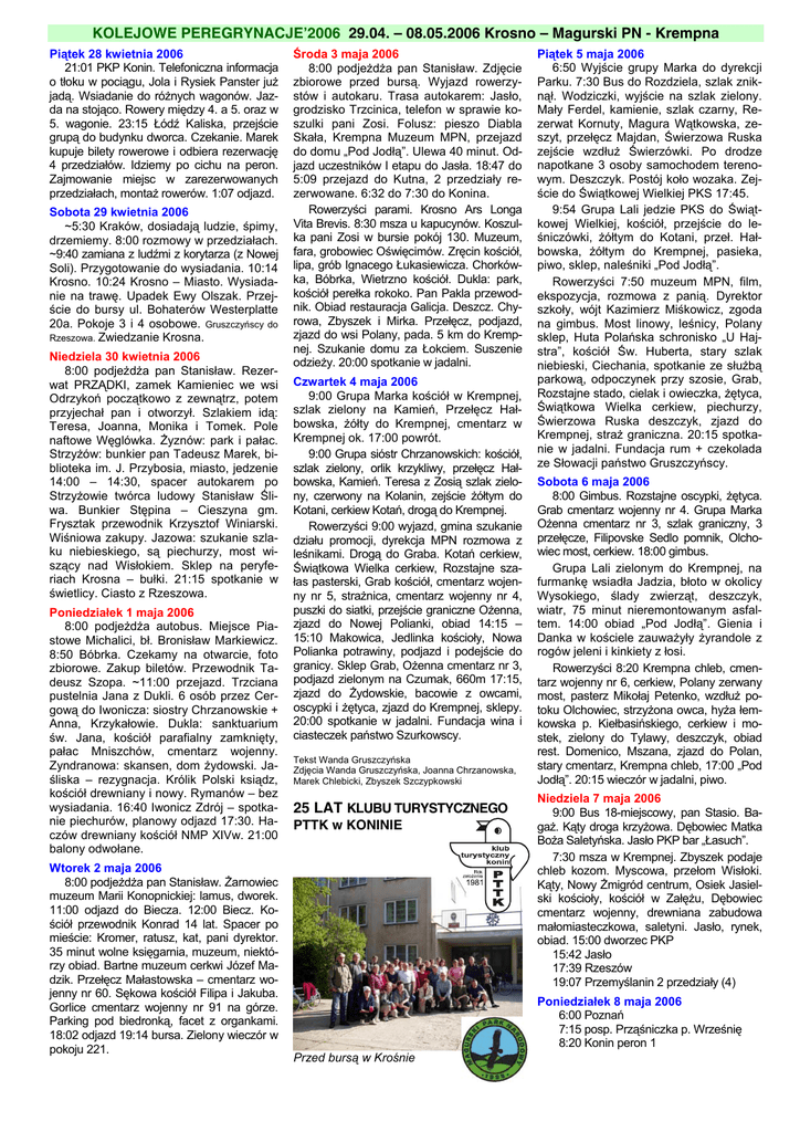KOLEJOWE PEREGRYNACJE’2006 29.04. – 08.05.2006 Krosno – Magurski PN - Krempna Piątek 28 kwietnia 2006 21:01 PKP Konin. Telefoniczna informacja o tłoku w pociągu, Jola i Rysiek Panster już jadą. Wsiadanie do różnych wagonów. Jazda na stojąco. Rowery między 4. a 5. oraz w 5. wagonie. 23:15 Łódź Kaliska, przejście grupą do budynku dworca. Czekanie. Marek kupuje bilety rowerowe i odbiera rezerwację 4 przedziałów. Idziemy po cichu na peron. Zajmowanie miejsc w zarezerwowanych przedziałach, montaż rowerów. 1:07 odjazd. Sobota 29 kwietnia 2006 ~5:30 Kraków, dosiadają ludzie, śpimy, drzemiemy. 8:00 rozmowy w przedziałach. ~9:40 zamiana z ludźmi z korytarza (z Nowej Soli). Przygotowanie do wysiadania. 10:14 Krosno. 10:24 Krosno – Miasto. Wysiadanie na trawę. Upadek Ewy Olszak. Przejście do bursy ul. Bohaterów Westerplatte 20a. Pokoje 3 i 4 osobowe. Gruszczyńscy do Rzeszowa. Zwiedzanie Krosna. Niedziela 30 kwietnia 2006 8:00 podjeżdża pan Stanisław. Rezerwat PRZĄDKI, zamek Kamieniec we wsi Odrzykoń początkowo z zewnątrz, potem przyjechał pan i otworzył. Szlakiem idą: Teresa, Joanna, Monika i Tomek. Pole naftowe Węglówka. Żyznów: park i pałac. Strzyżów: bunkier pan Tadeusz Marek, biblioteka im. J. Przybosia, miasto, jedzenie 14:00 – 14:30, spacer autokarem po Strzyżowie twórca ludowy Stanisław Śliwa. Bunkier Stępina – Cieszyna gm. Frysztak przewodnik Krzysztof Winiarski. Wiśniowa zakupy. Jazowa: szukanie szlaku niebieskiego, są piechurzy, most wiszący nad Wisłokiem. Sklep na peryferiach Krosna – bułki. 21:15 spotkanie w świetlicy. Ciasto z Rzeszowa. Poniedziałek 1 maja 2006 8:00 podjeżdża autobus. Miejsce Piastowe Michalici, bł. Bronisław Markiewicz. 8:50 Bóbrka. Czekamy na otwarcie, foto zbiorowe. Zakup biletów. Przewodnik Tadeusz Szopa. ~11:00 przejazd. Trzciana pustelnia Jana z Dukli. 6 osób przez Cergową do Iwonicza: siostry Chrzanowskie + Anna, Krzykałowie. Dukla: sanktuarium św. Jana, kościół parafialny zamknięty, pałac Mniszchów, cmentarz wojenny. Zyndranowa: skansen, dom żydowski. Jaśliska – rezygnacja. Królik Polski ksiądz, kościół drewniany i nowy. Rymanów – bez wysiadania. 16:40 Iwonicz Zdrój – spotkanie piechurów, planowy odjazd 17:30. Haczów drewniany kościół NMP XIVw. 21:00 balony odwołane. Wtorek 2 maja 2006 8:00 podjeżdża pan Stanisław. Żarnowiec muzeum Marii Konopnickiej: lamus, dworek. 11:00 odjazd do Biecza. 12:00 Biecz. Kościół przewodnik Konrad 14 lat. Spacer po mieście: Kromer, ratusz, kat, pani dyrektor. 35 minut wolne księgarnia, muzeum, niektórzy obiad. Bartne muzeum cerkwi Józef Madzik. Przełęcz Małastowska – cmentarz wojenny nr 60. Sękowa kościół Filipa i Jakuba. Gorlice cmentarz wojenny nr 91 na górze. Parking pod biedronką, facet z organkami. 18:02 odjazd 19:14 bursa. Zielony wieczór w pokoju 221. Środa 3 maja 2006 8:00 podjeżdża pan Stanisław. Zdjęcie zbiorowe przed bursą. Wyjazd rowerzystów i autokaru. Trasa autokarem: Jasło, grodzisko Trzcinica, telefon w sprawie koszulki pani Zosi. Folusz: pieszo Diabla Skała, Krempna Muzeum MPN, przejazd do domu „Pod Jodłą”. Ulewa 40 minut. Odjazd uczestników I etapu do Jasła. 18:47 do 5:09 przejazd do Kutna, 2 przedziały rezerwowane. 6:32 do 7:30 do Konina. Rowerzyści parami. Krosno Ars Longa Vita Brevis. 8:30 msza u kapucynów. Koszulka pani Zosi w bursie pokój 130. Muzeum, fara, grobowiec Oświęcimów. Zręcin kościół, lipa, grób Ignacego Łukasiewicza. Chorkówka, Bóbrka, Wietrzno kościół. Dukla: park, kościół perełka rokoko. Pan Pakla przewodnik. Obiad restauracja Galicja. Deszcz. Chyrowa, Zbyszek i Mirka. Przełęcz, podjazd, zjazd do wsi Polany, pada. 5 km do Krempnej. Szukanie domu za Łokciem. Suszenie odzieży. 20:00 spotkanie w jadalni. Czwartek 4 maja 2006 9:00 Grupa Marka kościół w Krempnej, szlak zielony na Kamień, Przełęcz Hałbowska, żółty do Krempnej, cmentarz w Krempnej ok. 17:00 powrót. 9:00 Grupa sióstr Chrzanowskich: kościół, szlak zielony, orlik krzykliwy, przełęcz Hałbowska, Kamień. Teresa z Zosią szlak zielony, czerwony na Kolanin, zejście żółtym do Kotani, cerkiew Kotań, drogą do Krempnej. Rowerzyści 9:00 wyjazd, gmina szukanie działu promocji, dyrekcja MPN rozmowa z leśnikami. Drogą do Graba. Kotań cerkiew, Świątkowa Wielka cerkiew, Rozstajne szałas pasterski, Grab kościół, cmentarz wojenny nr 5, strażnica, cmentarz wojenny nr 4, puszki do siatki, przejście graniczne Ożenna, zjazd do Nowej Polianki, obiad 14:15 – 15:10 Makowica, Jedlinka kościoły, Nowa Polianka potrawiny, podjazd i podejście do granicy. Sklep Grab, Ożenna cmentarz nr 3, podjazd zielonym na Czumak, 660m 17:15, zjazd do Żydowskie, bacowie z owcami, oscypki i żętyca, zjazd do Krempnej, sklepy. 20:00 spotkanie w jadalni. Fundacja wina i ciasteczek państwo Szurkowscy. Tekst Wanda Gruszczyńska Zdjęcia Wanda Gruszczyńska, Joanna Chrzanowska, Marek Chlebicki, Zbyszek Szczypkowski 25 LAT KLUBU TURYSTYCZNEGO PTTK w KONINIE Piątek 5 maja 2006 6:50 Wyjście grupy Marka do dyrekcji Parku. 7:30 Bus do Rozdziela, szlak zniknął. Wodziczki, wyjście na szlak zielony. Mały Ferdel, kamienie, szlak czarny, Rezerwat Kornuty, Magura Wątkowska, zeszyt, przełęcz Majdan, Świerzowa Ruska zejście wzdłuż Świerzówki. Po drodze napotkane 3 osoby samochodem terenowym. Deszczyk. Postój koło wozaka. Zejście do Świątkowej Wielkiej PKS 17:45. 9:54 Grupa Lali jedzie PKS do Świątkowej Wielkiej, kościół, przejście do leśniczówki, żółtym do Kotani, przeł. Hałbowska, żółtym do Krempnej, pasieka, piwo, sklep, naleśniki „Pod Jodłą”. Rowerzyści 7:50 muzeum MPN, film, ekspozycja, rozmowa z panią. Dyrektor szkoły, wójt Kazimierz Miśkowicz, zgoda na gimbus. Most linowy, leśnicy, Polany sklep, Huta Polańska schronisko „U Hajstra”, kościół Św. Huberta, stary szlak niebieski, Ciechania, spotkanie ze służbą parkową,