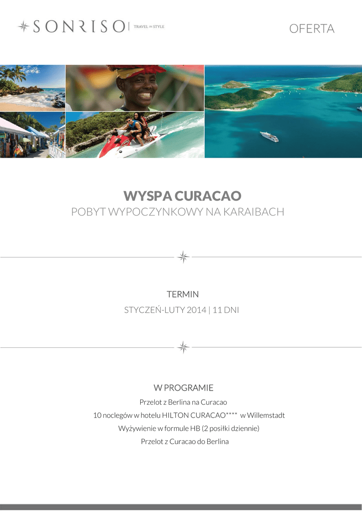 WYSPA CURACAO POBYT WYPOCZYNKOWY NA KARAIBACH TERMIN STYCZEŃ-LUTY 2014 | 11 DNI W PROGRAMIE Przelot z Berlina na Curacao 10 noclegów w hotelu HILTON CURACAO**** w Willemstadt Wyżywienie w formule HB (2 posiłki dziennie) Przelot z Curacao do Berlina HOTEL HILTON CURACAO **** http://www.hiltoncuracaoresort.com/ Znakomity czterogwiazdkowy hotel należący do sieci Hilton położony jest w zatoce Piscadera Bay, obok kompleksu World Trade Centre Curaçao. Do zabytkowego centrum miasta Willemstad można dojechać w 5 minut. Na terenie obiektu znajduje się centrum nurkowania, kasyno, 6 restauracji, SPA oraz 2 prywatne plaże pokryte białym piaskiem. Podczas pobytu w hotelu Hilton Curaçao goście mogą spróbować sił w nurkowaniu z akwalungiem lub rurką, można też wybrać się na przejażdżkę skuterem wodnym. Na terenie hotelu znajduje się wypożyczalnia samochodów, kwiaciarnia oraz butik odzieżowy. Dla najmłodszych przygotowano klub i pole do minigolfa. W ofercie proponujemy pokój kategorii standard z łóżkiem typu queen-size bed lub dwoma łóżkami pojedynczymi. Każdy z pokoi w hotelu Hilton Curaçao dysponuje balkonem z widokiem na wyspę lub ocean. Wyposażenie obejmuje stację dokującą do iPoda, bezprzewodowy internet, telewizor LCD z dostępem do telewizji kablowej, sejf, mini-bar, klimatyzację, telefon, ekspres do kawy, żelazko i deskę do prasowania. W łazience znajduje się m.in. prysznic i wanna oraz suszarka do włosów. KALKULACJA CENOWA od 2076,- EUR/os. Powyższa cena została skalkulowana w oparciu o dostępność oraz ceny z dnia 19.09.2013 r. Dokładna cena zostanie potwierdzona w momencie zakładania rezerwacji. Istnieje możliwość zmiany terminu wylotu oraz pobytu. CENA ZAWIERA Przelot do/z Curacao 10 noclegów w hotelu Hilton Curacao **** wyżywienie w formule HB (2 posiłki dziennie) transfery na trasie lotnisko/hotel/lotnisko ubezpieczenie turystyczne opieka niemieckojęzycznego rezydenta DODATKOWE OPŁATY korzystanie z mini baru w hotelu wydatki osobiste ubezpieczenie od chorób przewlekłych wycieczki fakultatywne w j. niemieckim dopłata do pokoju 1- os. KONTAKT SONRISO WARSZAWA Lipiński Passage Al. Jerozolimskie 61 00-697 Warszawa tel. +48 22 206 45 00 e-mail: [email protected] SONRISO POZNAŃ City Park (Stare Koszary) ul. Wojskowa 4 60-792 Poznań tel. +48 61 674 60 70 e-mail: [email protected]