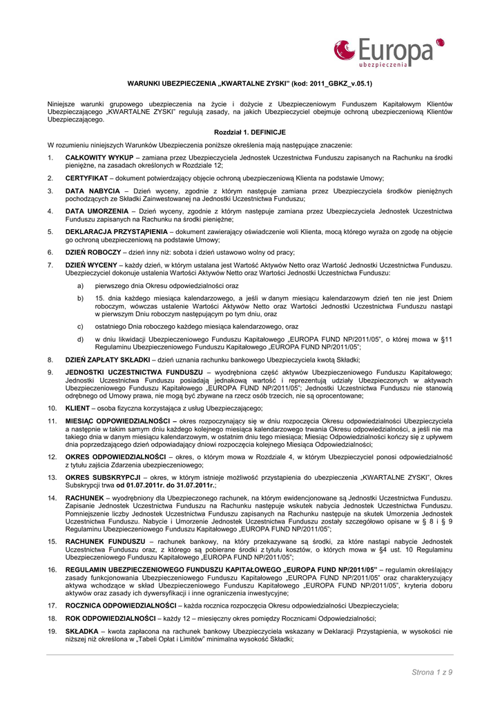WARUNKI UBEZPIECZENIA „KWARTALNE ZYSKI” (kod: 2011_GBKZ_v.05.1) Niniejsze warunki grupowego ubezpieczenia na życie i dożycie z Ubezpieczeniowym Funduszem Kapitałowym Klientów Ubezpieczającego „KWARTALNE ZYSKI” regulują zasady, na jakich Ubezpieczyciel obejmuje ochroną ubezpieczeniową Klientów Ubezpieczającego. Rozdział 1. DEFINICJE W rozumieniu niniejszych Warunków Ubezpieczenia poniższe określenia mają następujące znaczenie: 1. CAŁKOWITY WYKUP – zamiana przez Ubezpieczyciela Jednostek Uczestnictwa Funduszu zapisanych na Rachunku na środki pieniężne, na zasadach określonych w Rozdziale 12; 2. CERTYFIKAT – dokument potwierdzający objęcie ochroną ubezpieczeniową Klienta na podstawie Umowy; 3. DATA NABYCIA – Dzień wyceny, zgodnie z którym następuje zamiana przez Ubezpieczyciela środków pieniężnych pochodzących ze Składki Zainwestowanej na Jednostki Uczestnictwa Funduszu; 4. DATA UMORZENIA – Dzień wyceny, zgodnie z którym następuje zamiana przez Ubezpieczyciela Jednostek Uczestnictwa Funduszu zapisanych na Rachunku na środki pieniężne; 5. DEKLARACJA PRZYSTĄPIENIA – dokument zawierający oświadczenie woli Klienta, mocą którego wyraża on zgodę na objęcie go ochroną ubezpieczeniową na podstawie Umowy; 6. DZIEŃ ROBOCZY – dzień inny niż: sobota i dzień ustawowo wolny od pracy; 7. DZIEŃ WYCENY – każdy dzień, w którym ustalana jest Wartość Aktywów Netto oraz Wartość Jednostki Uczestnictwa Funduszu. Ubezpieczyciel dokonuje ustalenia Wartości Aktywów Netto oraz Wartości Jednostki Uczestnictwa Funduszu: a) pierwszego dnia Okresu odpowiedzialności oraz b) 15. dnia każdego miesiąca kalendarzowego, a jeśli w danym miesiącu kalendarzowym dzień ten nie jest Dniem roboczym, wówczas ustalenie Wartości Aktywów Netto oraz Wartości Jednostki Uczestnictwa Funduszu nastąpi w pierwszym Dniu roboczym następującym po tym dniu, oraz c) ostatniego Dnia roboczego każdego miesiąca kalendarzowego, oraz d) w dniu likwidacji Ubezpieczeniowego Funduszu Kapitałowego „EUROPA FUND NP/2011/05”, o której mowa w §11 Regulaminu Ubezpieczeniowego Funduszu Kapitałowego „EUROPA FUND NP/2011/05”; 8. DZIEŃ ZAPŁATY SKŁADKI – dzień uznania rachunku bankowego Ubezpieczyciela kwotą Składki; 9. JEDNOSTKI UCZESTNICTWA FUNDUSZU – wyodrębniona część aktywów Ubezpieczeniowego Funduszu Kapitałowego; Jednostki Uczestnictwa Funduszu posiadają jednakową wartość i reprezentują udziały Ubezpieczonych w aktywach Ubezpieczeniowego Funduszu Kapitałowego „EUROPA FUND NP/2011/05”; Jednostki Uczestnictwa Funduszu nie stanowią odrębnego od Umowy prawa, nie mogą być zbywane na rzecz osób trzecich, nie są oprocentowane; 10. KLIENT – osoba fizyczna korzystająca z usług Ubezpieczającego; 11. MIESIĄC ODPOWIEDZIALNOŚCI – okres rozpoczynający się w dniu rozpoczęcia Okresu odpowiedzialności Ubezpieczyciela a następnie w takim samym dniu każdego kolejnego miesiąca kalendarzowego trwania Okresu odpowiedzialności, a jeśli nie ma takiego dnia w danym miesiącu kalendarzowym, w ostatnim dniu tego miesiąca; Miesiąc Odpowiedzialności kończy się z upływem dnia poprzedzającego dzień odpowiadający dniowi rozpoczęcia kolejnego Miesiąca Odpowiedzialności; 12. OKRES ODPOWIEDZIALNOŚCI – okres, o którym mowa w Rozdziale 4, w którym Ubezpieczyciel ponosi odpowiedzialność z tytułu zajścia Zdarzenia ubezpieczeniowego; 13. OKRES SUBSKRYPCJI – okres, w którym istnieje możliwość przystąpienia do ubezpieczenia „KWARTALNE ZYSKI”, Okres Subskrypcji trwa od 01.07.2011r. do 31.07.2011r.; 14. RACHUNEK – wyodrębniony dla Ubezpieczonego rachunek, na którym ewidencjonowane są Jednostki Uczestnictwa Funduszu. Zapisanie Jednostek Uczestnictwa Funduszu na Rachunku następuje wskutek nabycia Jednostek Uczestnictwa Funduszu. Pomniejszenie liczby Jednostek Uczestnictwa Funduszu zapisanych na Rachunku następuje na skutek Umorzenia Jednostek Uczestnictwa Funduszu. Nabycie i Umorzenie Jednostek Uczestnictwa Funduszu zostały szczegółowo opisane w § 8 i § 9 Regulaminu Ubezpieczeniowego Funduszu Kapitałowego „EUROPA FUND NP/2011/05”; 15. RACHUNEK FUNDUSZU – rachunek bankowy, na który przekazywane są środki, za które nastąpi nabycie Jednostek Uczestnictwa Funduszu oraz, z którego są pobierane środki z tytułu kosztów, o których mowa w §4 ust. 10 Regulaminu Ubezpieczeniowego Funduszu Kapitałowego „EUROPA FUND NP/2011/05”; 16. REGULAMIN UBEZPIECZENIOWEGO FUNDUSZU KAPITAŁOWEGO „EUROPA FUND NP/2011/05” – regulamin określający zasady funkcjonowania Ubezpieczeniowego Funduszu Kapitałowego „EUROPA FUND NP/2011/05” oraz charakteryzujący aktywa wchodzące w skład Ubezpieczeniowego Funduszu Kapitałowego „EUROPA FUND NP/2011/05”, kryteria doboru aktywów oraz zasady ich dywersyfikacji i inne ograniczenia inwestycyjne; 17. ROCZNICA ODPOWIEDZIALNOŚCI – każda rocznica rozpoczęcia Okresu odpowiedzialności Ubezpieczyciela; 18. ROK ODPOWIEDZIALNOŚCI – każdy 12 – miesięczny okres pomiędzy Rocznicami Odpowiedzialności; 19. SKŁADKA – kwota zapłacona na rachunek bankowy Ubezpieczyciela wskazany w Deklaracji Przystąpienia, w wysokości nie niższej niż określona w „Tabeli Opłat i Limitów” minimalna wysokość Składki; Strona 1 z 9 20. SKŁADKA ZAINWESTOWANA – Składka pomniejszona o Opłatę Wstępną, o której mowa w Rozdziale 7 pkt. 1 ppkt 1; 21. ŚWIADCZENIE UBEZPIECZENIOWE – świadczenie pieniężne Uprawnionemu z tytułu zajścia Zdarzenia ubezpieczeniowego; 22. UBEZPIECZAJĄCY – Getin Noble Bank S.A. z siedzibą w Warszawie, ul. Domaniewska 39b, 02-675 Warszawa, wpisana do rejestru przedsiębiorców prowadzonego przez Sąd Rejonowy dla m.st. Warszawy, XIII Wydział Gospodarczy Krajowego Rejestru Sądowego pod numerem KRS 0000018507, NIP 712 010 27 93, REGON 004184103, której kapitał zakładowy wynosi 953.763.097,00 zł (w pełni opłacon