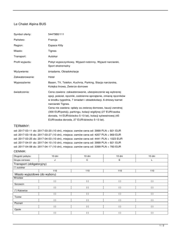 Le Chalet Alpina BUS Symbol oferty: 5447980/111 Państwo: Francja Region: Espace Killy Miasto: Tignes Transport: Autokar Profil wyjazdu: Pobyt wypoczynkowy, Wyjazd rodzinny, Wyjazd narciarski, Wyżywienie: śniadanie, Obiadokolacje Zakwaterowanie: Hotel Wyposażenie: Basen, TV, Telefon, Kuchnia, Parking, Stacja narciarska, świadczenia: Cena zawiera: zakwaterowanie, ubezpieczenie wg wybranej Sport ekstremalny Kolejka linowa, Zwierze domowe opcji, pościel, ręczniki, codzienne sprzątanie, zmianę ręczników w środku tygodnia, 7 śniadań i obiadokolacji, 6-dniowy karnet narciarski Tignes. Cena nie zawiera: opłaty za zwierzę domowe, kaucji zwrotnej (300 EUR/pokój), parkingu, kolacji wigilijnej (27 EUR/osoba dorosła, 14 EUR/dziecko 5-13 lat), kolacji sylwestrowej (45 EUR/osoba dorosła, 27 EUR/dziecko 5-13 lat). TERMINY: od: 2017-03-11 do: 2017-03-20 (10 dni), miejsca: zamów cena od: 3999 PLN = 921 EUR od: 2017-03-18 do: 2017-03-27 (10 dni), miejsca: zamów cena od: 4207 PLN = 969 EUR od: 2017-03-25 do: 2017-04-03 (10 dni), miejsca: zamów cena od: 4441 PLN = 1023 EUR od: 2017-04-01 do: 2017-04-10 (10 dni), miejsca: zamów cena od: 3999 PLN = 921 EUR od: 2017-04-08 do: 2017-04-17 (10 dni), miejsca: zamów cena od: 3399 PLN = 783 EUR CENNIK: Długość pobytu: 10 dni 10 dni 10 dni 10 dni Grupa cenowa: J C E L 110 110 110 110 (-) (-) (-) (-) (-) (-) (-) (-) (-) (-) (-) (-) (-) (-) (-) (-) (-) (-) (-) (-) (-) (-) (-) (-) Transport (obligatoryjny) (*) autokar Miasto wyjazdowe (do wyboru) Wrocław Szczecin (*) Katowice Tczew Poznań Opole 1/2 Warszawa Toruń Białystok Kraków3 Łódź Bielsko-Biała Częstochowa Gdynia Gdańsk Sopot Gliwice Olsztyn (-) (-) (-) (-) (-) (-) (-) (-) (-) (-) (-) (-) (-) (-) (-) (-) (-) (-) (-) (-) (-) (-) (-) (-) (-) (-) (-) (-) (-) (-) (-) (-) (-) (-) (-) (-) (-) (-) (-) (-) (-) (-) (-) (-) (-) (-) (-) (-) 2424 2928 1404 1872 1272 1536 1926 2376 1746 2070 Pobyt w obiekcie (do wyboru) pokój 2-4-osobowy typu suite dla 4 osób standardowo dla osób: 4 3312 3144 pokój 2-4-osobowy typu suite dla 2 osób standardowo dla osób: 2 2100 2004 (*) pokój 2-3-osobowy dla 2 osób standardowo dla osób: 2 1752 1632 pokój 2-4-osobowy typu suite dla 3 osób standardowo dla osób: 3 2736 2556 pokój 2-3-osobowy dla 3 osób standardowo dla osób: 3 2376 2196 Ubezpieczenie (do wyboru) (*) ubezpieczenie NWKL ubezpieczenie NWKLSKI Bilet (do wyboru) 7 7 7 7 12 12 12 12 36 30 36 3% 3% 3% 3% (-) (-) (-) (-) (*) 6-dniowy karnet narciarski na obszar Espace Killy 30 Ubezpieczenie (opcjonalne) ubezpiecznie od kosztów rezygnacji Inne (do wyboru) (*) atlas narciarski Europy Waluta: EUR Aktualne ceny z systemu S.A.R.T. (-) - cena usługi, podatku kalkulowana przy osobie lub gratis (*) - kwota wliczona w cenę standardową 2/2