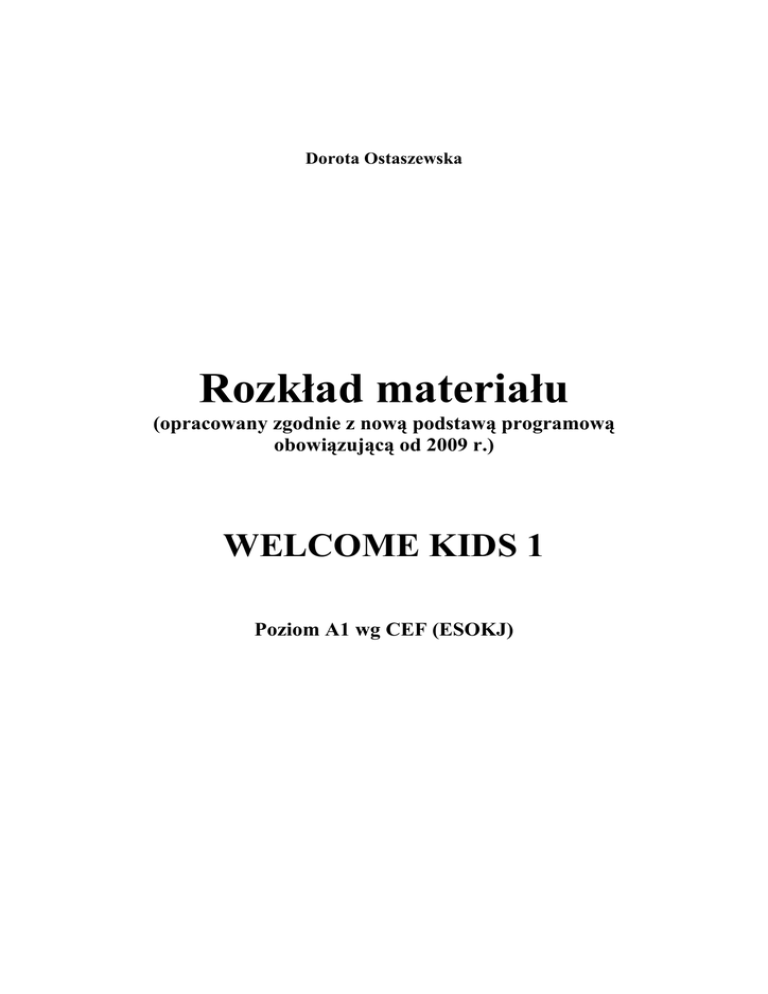Dorota Ostaszewska Rozkład materiału (opracowany zgodnie z nową podstawą programową obowiązującą od 2009 r.) WELCOME KIDS 1 Poziom A1 wg CEF (ESOKJ) Wstęp Zadaniem edukacji wczesnoszkolnej jest stopniowe i możliwie łagodne przeprowadzenie dziecka z kształcenia zintegrowanego do nauczania przedmiotowego w klasach IV-VI szkoły podstawowej. Aby ten proces ułatwić, w nowej podstawie programowej wyodrębniono dwa etapy nauczania oraz związane z nimi wiadomości i umiejętności: dla uczniów kończących klasę I oraz dla uczniów kończących klasę III. Wprowadzenie takiego podziału jest spowodowane specyfiką pracy z dzieckiem w klasie pierwszej, gdzie należy zapewnić kontynuację edukacji przedszkolnej. Drugi i trzeci rok edukacji wczesnoszkolnej polega na powtarzaniu, pogłębianiu oraz poszerzaniu wiadomości i umiejętności zdobytych w klasie pierwszej. Celem nauki języka na pierwszym etapie edukacyjnym jest przede wszystkim rozwój sprawności słuchania i znajomości słownictwa, jak również budowanie elementarnych umiejętności komunikacyjnych. Podręcznik Welcome Kids 1 wychodzi naprzeciw potrzebom dzieci w młodszym wieku szkolnym, które rozpoczynają naukę języka angielskiego równocześnie ze stawianiem pierwszych kroków na długiej drodze do uporządkowania, uzupełnienia i poszerzenia swojej wiedzy o świecie. Niemal każdy nauczyciel zajmujący się dziećmi w ciągu trzech pierwszych lat nauki twierdzi, że praca ta przynosi ogromną satysfakcję, ale jednocześnie wymaga ogromnego wysiłku i bezgranicznej wręcz cierpliwości. Wynika to przede wszystkim z faktu, że najmłodsi uczniowie nie są jeszcze przyzwyczajeni do ograniczeń, jakie narzuca szkoła, nie potrafią zbyt długo usiedzieć na miejscu, nie mówiąc o skupieniu się przez dłuższy czas na jednym zadaniu. Ponadto wciąż jeszcze potrzebują okazji do zabawy i rozładowania rozpierającej ich energii, chcą pozostawać w centrum uwagi i bardzo przeżywają wszelkie, najdrobniejsze nawet niepowodzenia. Jednym słowem, są dużo bardziej absorbujący niż uczniowie na jakimkolwiek innym poziomie edukacyjnym. Nauczyciel języka obcego napotka w najmłodszych klasach dodatkowe utrudnienia. Nie da się tutaj, niestety, wytłumaczyć zasad gramatycznych i oczekiwać, że dzieci zrozumieją je i będą stosować. Nie da się zadać do domu listy słówek do opanowania i odpytać z niej na następnej lekcji. Nie da się zażądać od uczniów, by usiedli i rozwiązali ćwiczenie, czy napisali wypracowanie. Cały czas trzeba pamiętać o tym, że pierwsze lata nauki języka obcego kształtują postawę dzieci wobec tego języka, kultury narodu, który się nim posługuje i nauki języków w ogóle. 2 Autorki podręcznika Welcome Kids 1 wzięły pod uwagę zarówno wiek i związane z nim potrzeby uczniów, jak i komfort pracy nauczyciela. Kolorowa, wypełniona historyjkami obrazkowymi i piosenkami książka z pewnością przyciągnie uwagę dzieci. Prosta, bliska codzienności dzieci tematyka rozdziałów zapewni uczniom poczucie bezpieczeństwa w obcojęzycznym środowisku. Dzięki temu, że budowa podręcznika do pewnego stopnia pozwala na manipulowanie kolejnością, w jakiej realizowane będą jego treści, nauczyciel może dopasować swoje zajęcia do programu nauczania zintegrowanego. Niezwykle istotną cechą podręcznika jest także fakt, że kładzie się tu nacisk przede wszystkim na naukę słownictwa i prostych fraz oraz kształtowanie wymowy – temu właśnie przede wszystkim służą liczne piosenki i wyliczanki, a także specjalne ćwiczenia poświęcone pojedynczym dźwiękom. W Welcome Kids 1 nie pojawiają się żadne tabele gramatyczne ani reguły. Choć wydaje się to niemal nieprawdopodobne na tym etapie kształcenia językowego, podstawę nauki stanowi komunikacja – umożliwienie zrozumienia przekazu w formie ustnej lub pisemnej i zapewnienie środków do wyrażenia nieskomplikowanych treści. Wprawdzie nie można tu jeszcze mówić o rozwijaniu umiejętności językowych, ale niewątpliwie celem zajęć jest kształtowanie podwalin pod te umiejętności. Nauka języka opiera się w dużej mierze na pamięciowym opanowaniu słownictwa. W przypadku uczniów młodszych jest to źródłem kolejnych problemów. Dzieci nie lubią uczyć się „na pamięć”, nie do końca też potrafią to robić. Owszem, kiedy chodzi o wierszyki i piosenki, chętnie powtarzają je do całkowitego wyuczenia, ponieważ uważają to za świetną zabawę, a ponadto mogą potem zaprezentować świeżo zdobyte umiejętności w domu. Poza tym rymowane wersy stosunkowo łatwo zapamiętać. Pod tym względem Welcome Kids 1 znakomicie nadaje się dla młodszych uczniów – nawet teksty towarzyszące historyjkom obrazkowym są rymowane i doskonale nadają się do mini-inscenizacji. Jeśli chodzi o zapamiętywanie słówek, sytuacja wydaje się trudniejsza. Skoro zmuszanie dzieci do opanowania list wyrazów może prowadzić jedynie do frustracji i zniechęcenia – i to zarówno u uczniów, jak i u nauczyciela – należy zastosować inne, skuteczniejsze metody. Wielokrotne używanie wspomaga zapamiętywanie, ale dzieci szybko się nudzą, jeśli pracują zbyt długo nad tym samym zadaniem. Rozwiązaniem tego problemu są zaproponowane w Welcome Kids 1 (w Podręczniku ucznia i Zeszycie ćwiczeń) różnorodne ćwiczenia oparte na tych samych jednostkach leksykalnych. Ponadto wszystkie zadania zawierają rysunki, a wiele z nich również elementy ruchu, co także ułatwia zapamiętywanie. 3 Rozkład materiału zawiera informacje o jednostkach leksykalnych, zwrotach i strukturach, elementach czytania, słuchania i pisania, aspektach wymowy, a także treściach o charakterze realioznawczym i międzyprzedmiotowym umieszczonych w poszczególnych rozdziałach. Brakuje w nim natomiast rubryki określającej orientacyjny czas realizacji, co wynika z faktu, że w nauczaniu zintegrowanym nie ma formalnego
