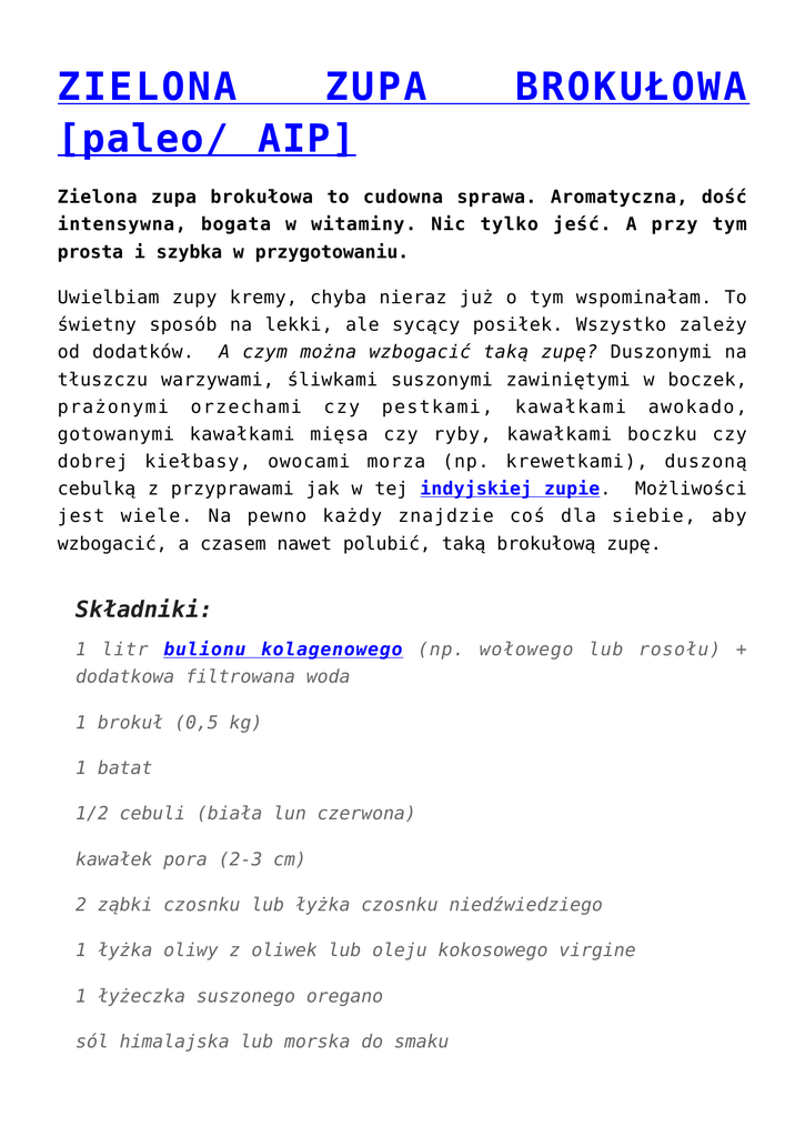 ZIELONA ZUPA [paleo/ AIP] BROKUŁOWA Zielona zupa brokułowa to cudowna sprawa. Aromatyczna, dość intensywna, bogata w witaminy. Nic tylko jeść. A przy tym prosta i szybka w przygotowaniu. Uwielbiam zupy kremy, chyba nieraz już o tym wspominałam. To świetny sposób na lekki, ale sycący posiłek. Wszystko zależy od dodatków. A czym można wzbogacić taką zupę? Duszonymi na tłuszczu warzywami, śliwkami suszonymi zawiniętymi w boczek, prażonymi orzechami czy pestkami, kawałkami awokado, gotowanymi kawałkami mięsa czy ryby, kawałkami boczku czy dobrej kiełbasy, owocami morza (np. krewetkami), duszoną cebulką z przyprawami jak w tej indyjskiej zupie. Możliwości jest wiele. Na pewno każdy znajdzie coś dla siebie, aby wzbogacić, a czasem nawet polubić, taką brokułową zupę. Składniki: 1 litr bulionu kolagenowego (np. wołowego lub rosołu) + dodatkowa filtrowana woda 1 brokuł (0,5 kg) 1 batat 1/2 cebuli (biała lun czerwona) kawałek pora (2-3 cm) 2 ząbki czosnku lub łyżka czosnku niedźwiedziego 1 łyżka oliwy z oliwek lub oleju kokosowego virgine 1 łyżeczka suszonego oregano sól himalajska lub morska do smaku świeżo zmielony czarny pieprz 1/3-1/2 łyżeczki kurkumy garść posiekanego koperku (lub więcej) Przygotowanie W garnku rozgrzewamy bulion, dolewamy także wodę filtrowaną, aby było jej tyle by przykryć warzywa (około 2 litrów). Na patelni rozgrzewamy tłuszcz i dusimy pokrojoną w plastry cebulę, pokrojonego w plasterki pora, pokrojonego w kostkę batata, przeciśnięty przez praskę czosnek (jeśli jest potrzeba – dolewamy do warzyw także odrobinę wody, aby warzywa się zbyt mocno nie przysmażyły; warzywa powinny odrobinę zmięknąć ale się nie rozpaść!). Brokuła dzielimy na mniejsze różyczki. Do gotującego się bulionu wrzucamy uduszone warzywa, brokuł oraz przyprawy. Gotujemy kilka minut (bez przykrycia) do momentu jak delikatnie zmiękną brokuły (nie powinny się rozgotować). Zestawiamy garnek z ognia, a następnie blenderujemy gładko (jak widać na zdjęciach, u mnie zupa krem była taka gładka). Jeśli zupa jest zbyt gęsta, odpowiednią ilość filtrowanej wody i doprowadzamy wrzenia, po czym wyłączamy gaz. całość na wcale nie dodajemy całość do Na końcu dodajemy koperek. Należy go dokładnie wmieszać w zupę. Podajemy z dodatkami (propozycje wyżej). Kto co lubi :) Jak widać ja wybrałam uduszoną na oleju kokosowym czerwoną cebulę z cukinią i czosnkiem. Jak widać jem nawet warzywa z warzywami :)) Taka zupa to dobra propozycja dla osób, które wymagają regeneracji czy wzmocnienia. Odpowiednia jest także dla osób z chorą tarczycą (tak, gotowane brokuły można jeść :) ). Jeśli ktoś nie lubi brokuła, warto jego smak zamaskować dodając więcej batata i dodatkowo marchew, a zmniejszają ilość brokuła ogółem. I jeszcze kilka słów o brokułach… „(…) Zawierają duże ilości kwasu pantotenowego i witaminy A, która wpływa korzystnie na szorstką skórę; mają więcej witaminy C niż cytrusy; są obfitym, naturalnym źródłem siarki, żelaza i witamin z grupy B. Lekko podgotowane brokuły zachowują swój cały chlorofil, który przeciwdziała gazom powstałym wskutek obecnej w nich siarki.” źródło: „Odżywianie dla zdrowia” P. Pitchford Smacznego!