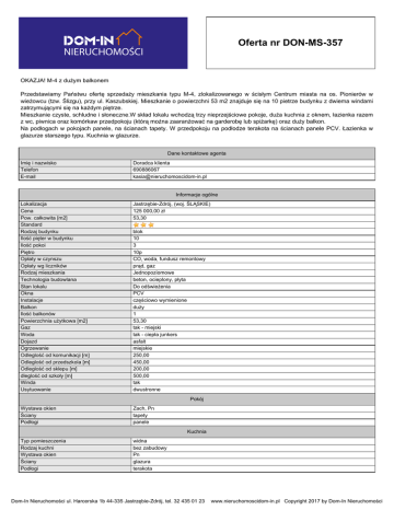 Oferta nr DON-MS-357 OKAZJA! M-4 z dużym balkonem Przedstawiamy Państwu ofertę sprzedaży mieszkania typu M-4, zlokalizowanego w ścisłym Centrum miasta na os. Pionierów w wieżowcu (tzw. Ślizgu), przy ul. Kaszubskiej. Mieszkanie o powierzchni 53 m2 znajduje się na 10 pietrze budynku z dwiema windami zatrzymującymi się na każdym piętrze. Mieszkanie czyste, schludne i słoneczne.W skład lokalu wchodzą trzy nieprzejściowe pokoje, duża kuchnia z oknem, łazienka razem z wc, piwnica oraz komórkaw przedpokoju (którą można zaaranżować na garderobę lub spiżarkę) oraz duży balkon. Na podłogach w pokojach panele, na ścianach tapety. W przedpokoju na podłodze terakota na ścianach panele PCV. Łazienka w glazurze starszego typu. Kuchnia w glazurze. Dane kontaktowe agenta Imię i nazwisko Telefon E-mail Doradca klienta 690886067 [email protected] Lokalizacja Cena Pow. całkowita [m2] Standard Rodzaj budynku Ilość pięter w budynku Ilość pokoi Piętro Opłaty w czynszu Opłaty wg liczników Rodzaj mieszkania Technologia budowlana Stan lokalu Okna Instalacje Balkon Ilość balkonów Powierzchnia użytkowa [m2] Gaz Woda Dojazd Ogrzewanie Odleglość od komunikacji [m] Odleglość od przedszkola [m] Odleglość od sklepu [m] dleglość od szkoły [m] Winda Usytuowanie Jastrzębie-Zdrój, (woj. ŚLĄSKIE) 125 000,00 zł 53,30 Informacje ogólne blok 10 3 10p CO, woda, fundusz remontowy prąd, gaz Jednopoziomowe beton, ocieplony, płyta Do odświeżenia PCV częściowo wymienione duży 1 53,30 tak - miejski tak - ciepła junkers asfalt miejskie 250,00 450,00 200,00 500,00 tak dwustronne Pokój Wystawa okien Ściany Podłogi Zach, Pn tapety panele Kuchnia Typ pomieszczenia Rodzaj kuchni Wystawa okien Ściany Podłogi widna bez zabudowy Pn glazura terakota Dom-In Nieruchomości ul. Harcerska 1b 44-335 Jastrzębie-Zdrój, tel. 32 435 01 23 www.nieruchomoscidom-in.pl Copyright 2017 by Dom-In Nieruchomości Oferta nr DON-MS-357 Łazienka Typ pomieszczenia Glazura Ściany Podłogi razem z wc starszego typu glazura terakota Przedpokój Ściany Podłogi panel ścienny terakota Dom-In Nieruchomości ul. Harcerska 1b 44-335 Jastrzębie-Zdrój, tel. 32 435 01 23 www.nieruchomoscidom-in.pl Copyright 2017 by Dom-In Nieruchomości
